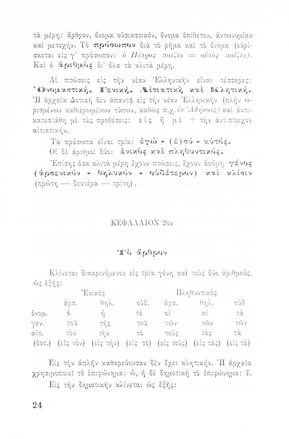 Σχολικό εγχειρίδιο γραμματικής για τους μαθητές της Ε΄ και ΣΤ΄ τάξης του Δημοτικού. Περιέχει τη διδασκαλία της γραμματικής της καθαρεύουσας με κανόνες και παραδείγματα.