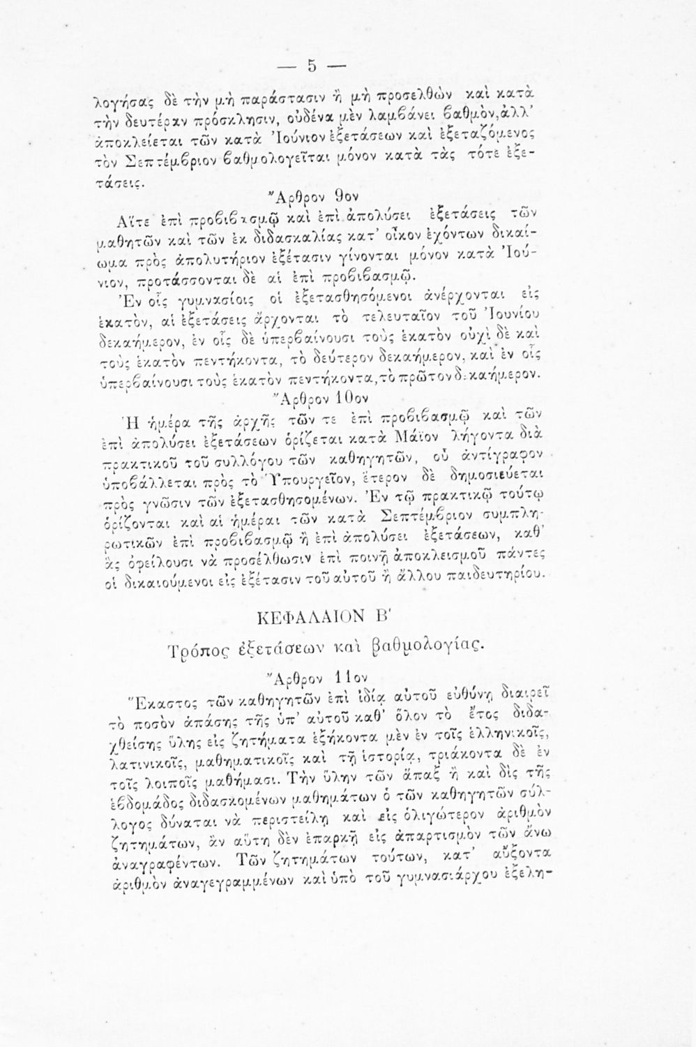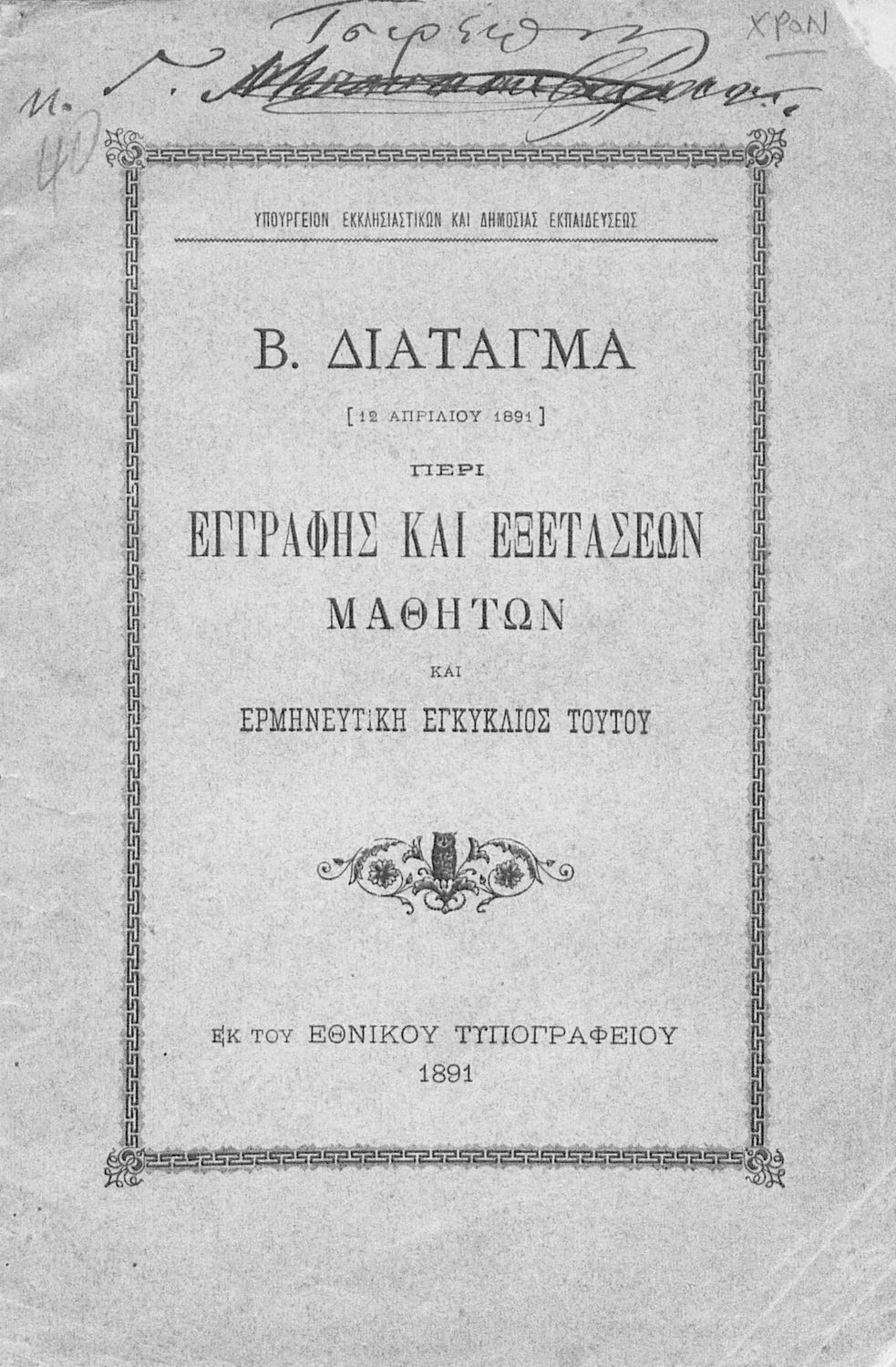 Β. Διάταγμα (12 Απριλίου 1891) περί εγγραφής και εξετάσεων μαθητών και ερμηνευτική εγκύκλιος τούτου