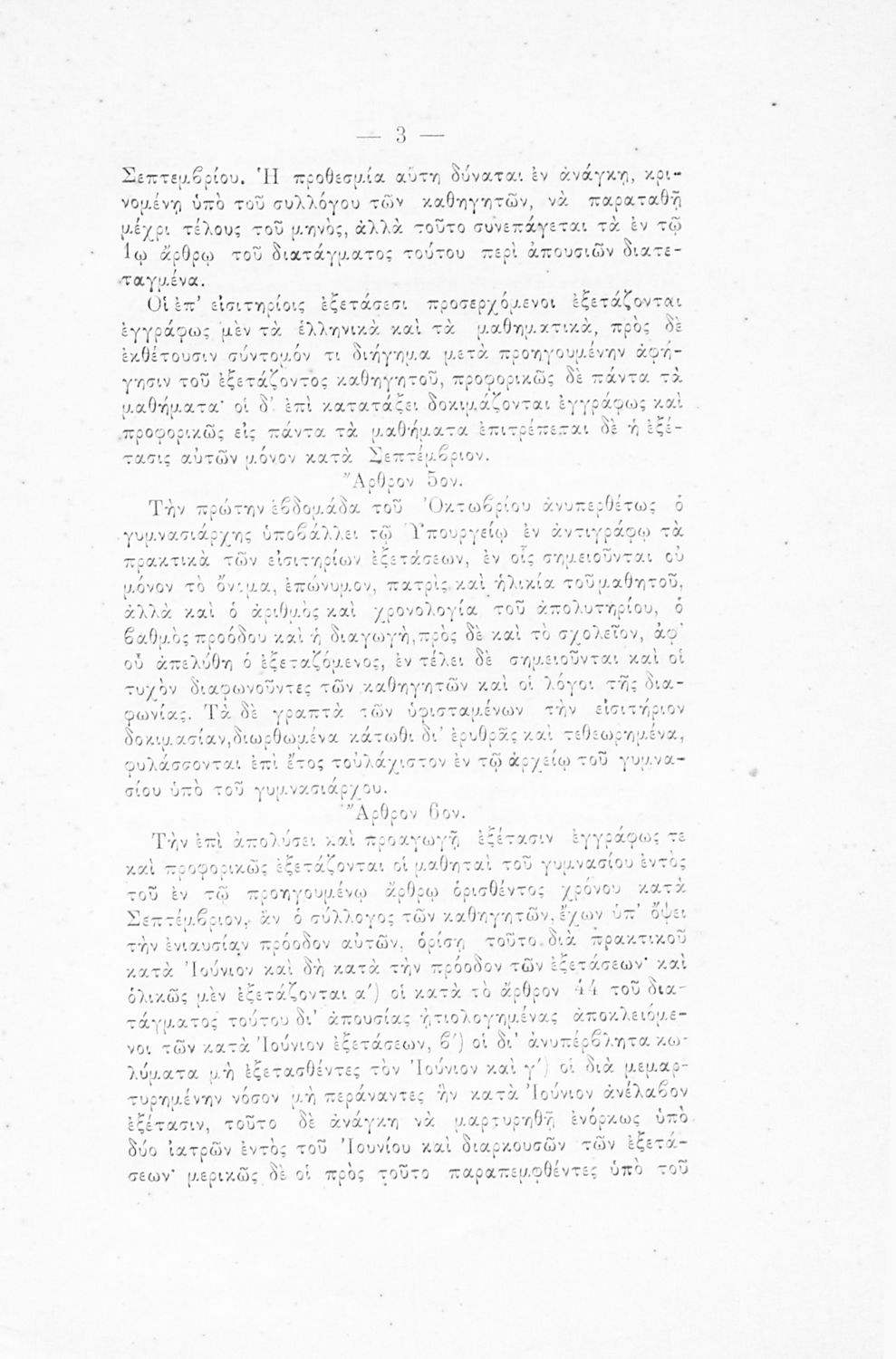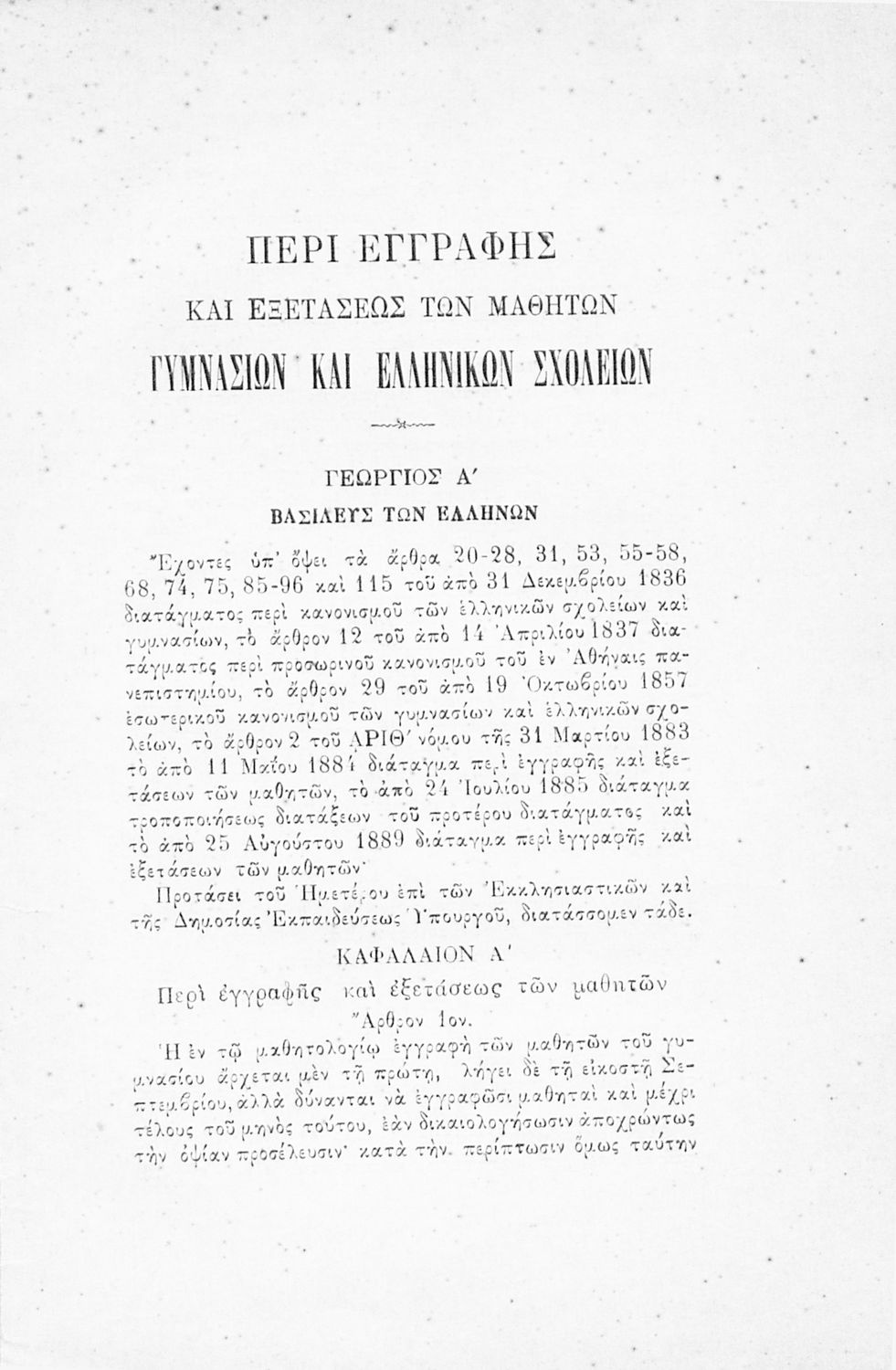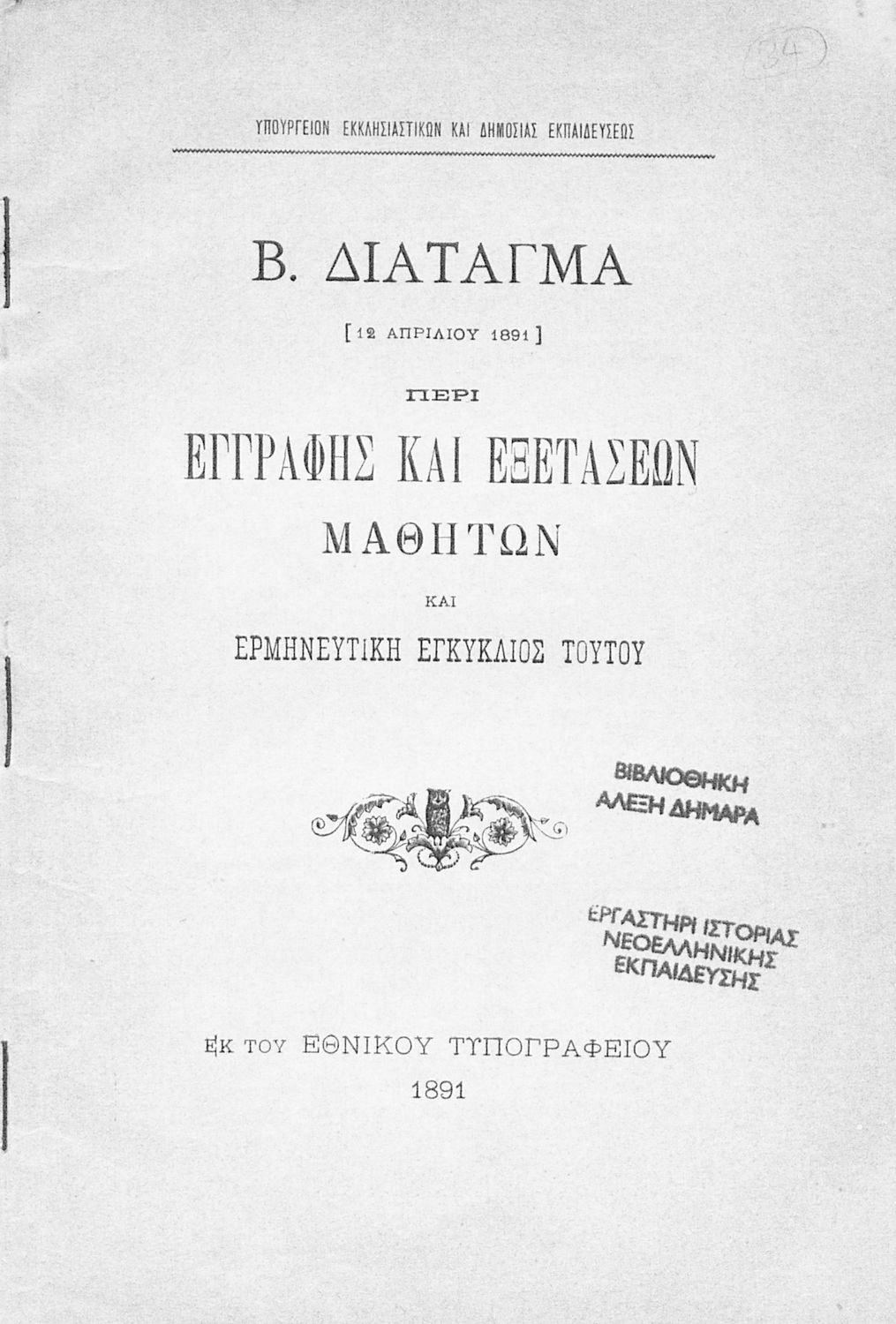 Τίτλος: Β. Διάταγμα (12 Απριλίου 1891) περί εγγραφής και εξετάσεων μαθητών και ερμηνευτική εγκύκλιος τούτου