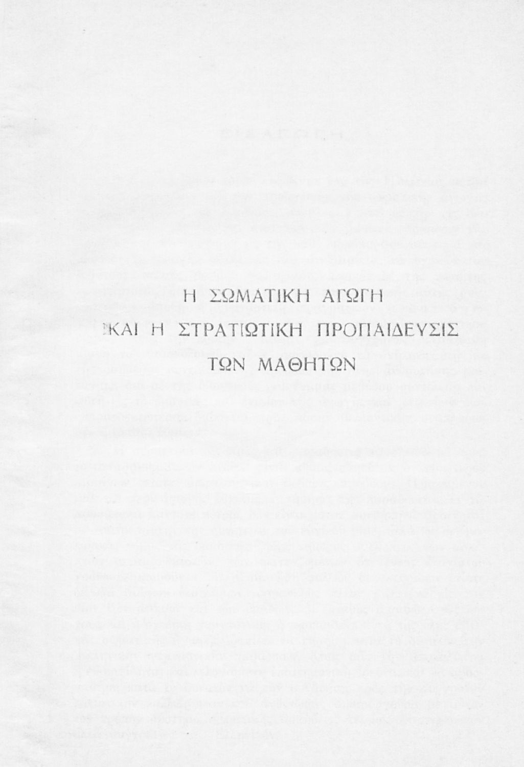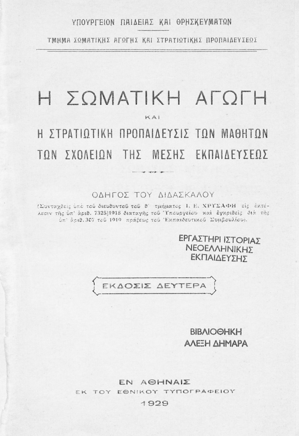Κωδικός αναγνώρισης: 05-00035 Τίτλος: Η σωματική αγωγή και η στρατιωτική προπαίδευσις των μαθητών των σχολείων της Μέσης Εκπαιδεύσεως. Οδηγός του διδασκάλου Συγγραφέας: Ι. Ε. Χρυσάφης Μέγεθος και υπόστρωμα: Παιδαγωγικό βοήθημα, μαλακό εξώφυλλο, 284 σελίδες. |