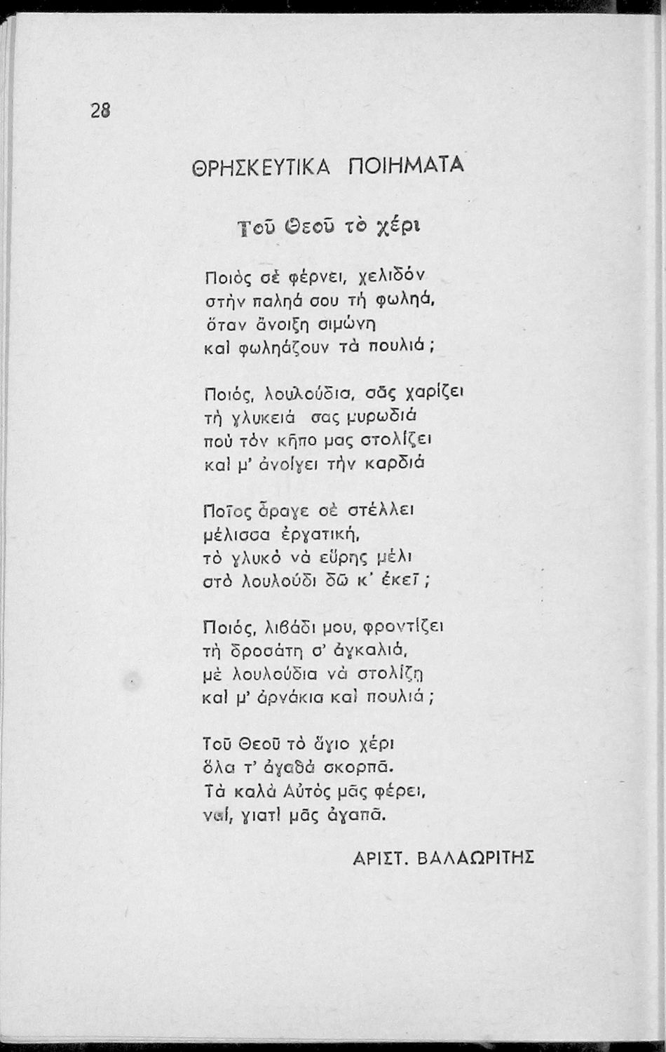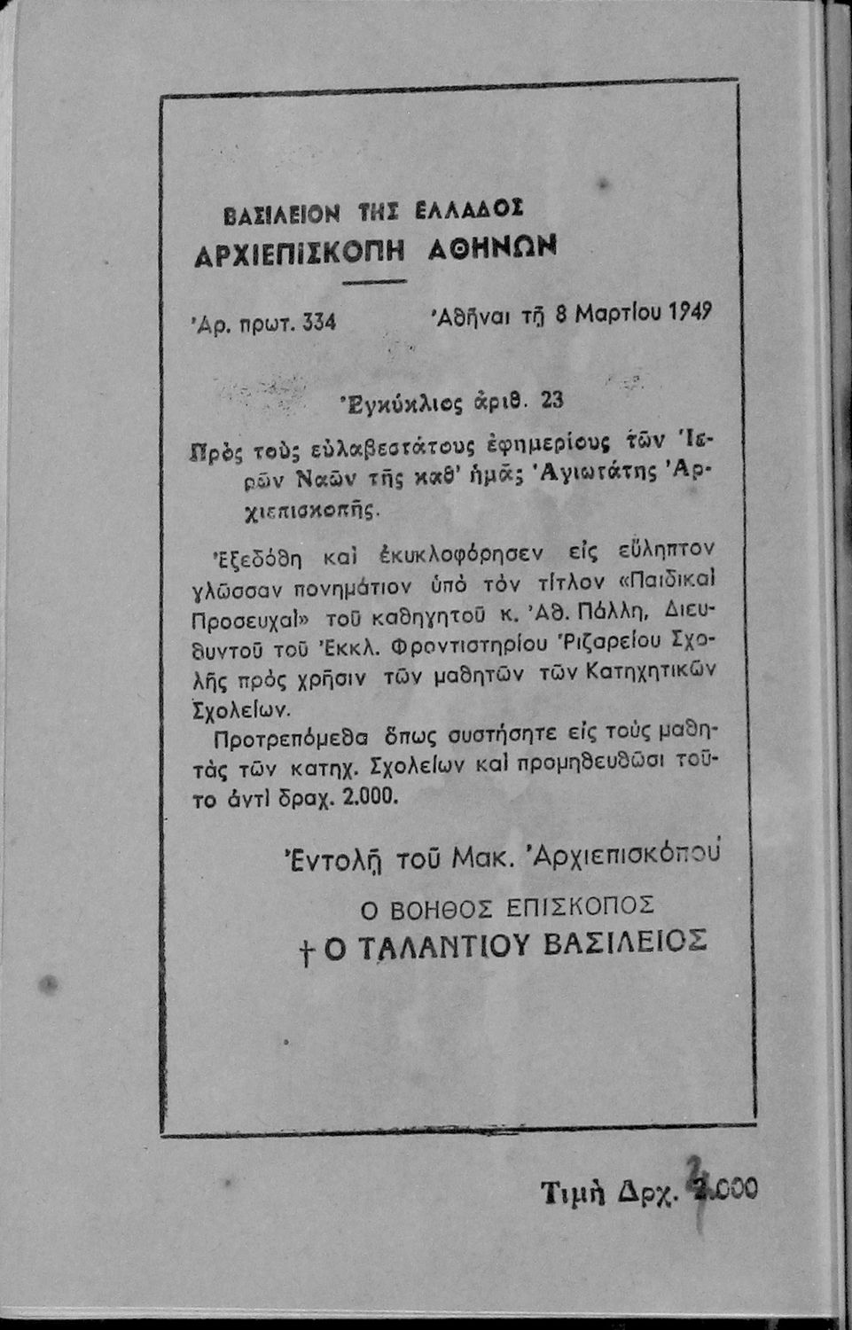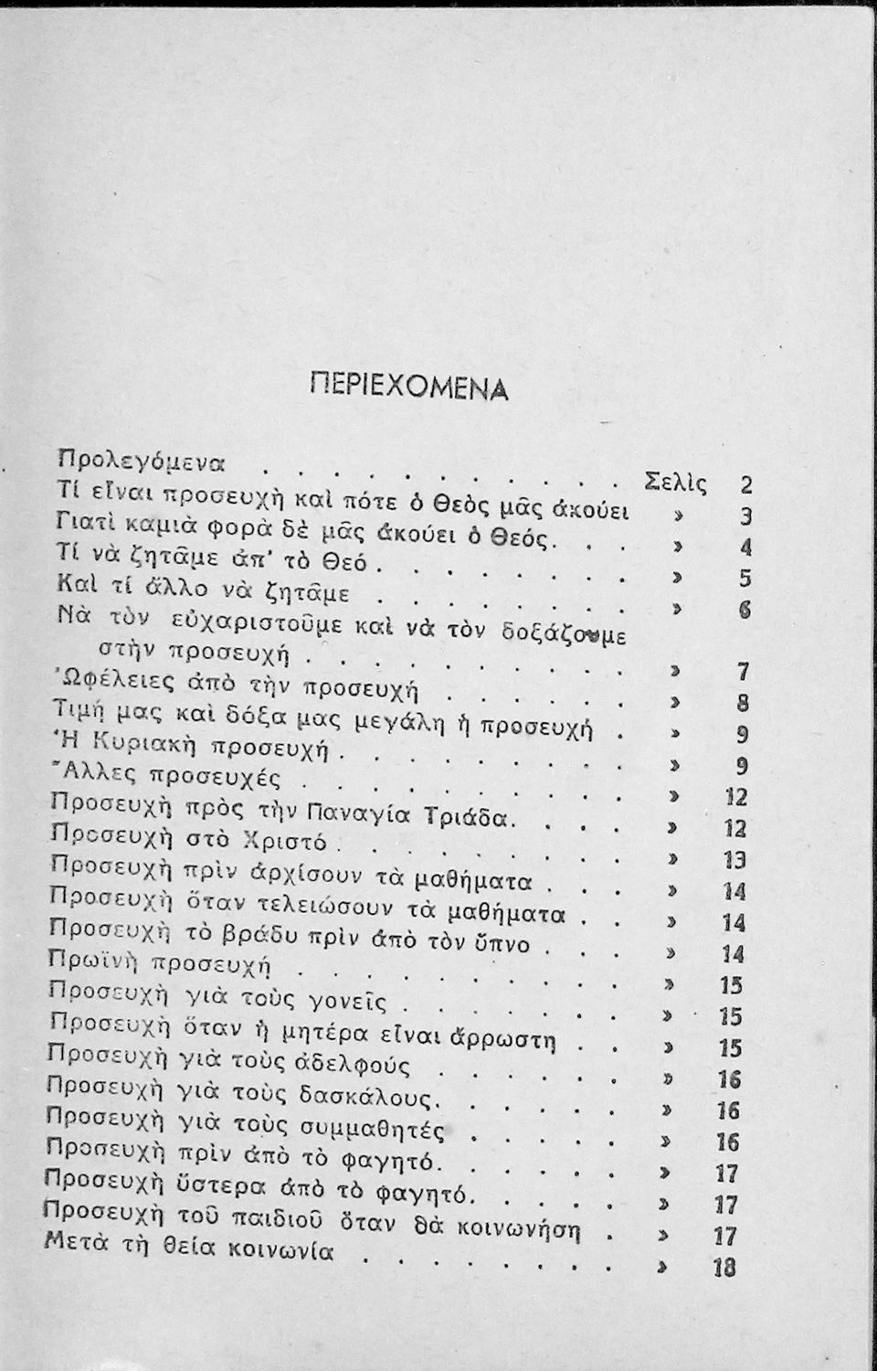 Μαθητικό βοήθημα που εστιάζει στην παιδαγωγική και θρησκευτική σπουδαιότητα της προσευχής και των διαφόρων ειδών προσευχής στην Ορθόδοξη Χριστιανική Εκκλησία. Εγκρίθηκε από την Αρχιεπισκοπή Αθηνών (Αρ. Πρωτ. 334/8-3-1949).