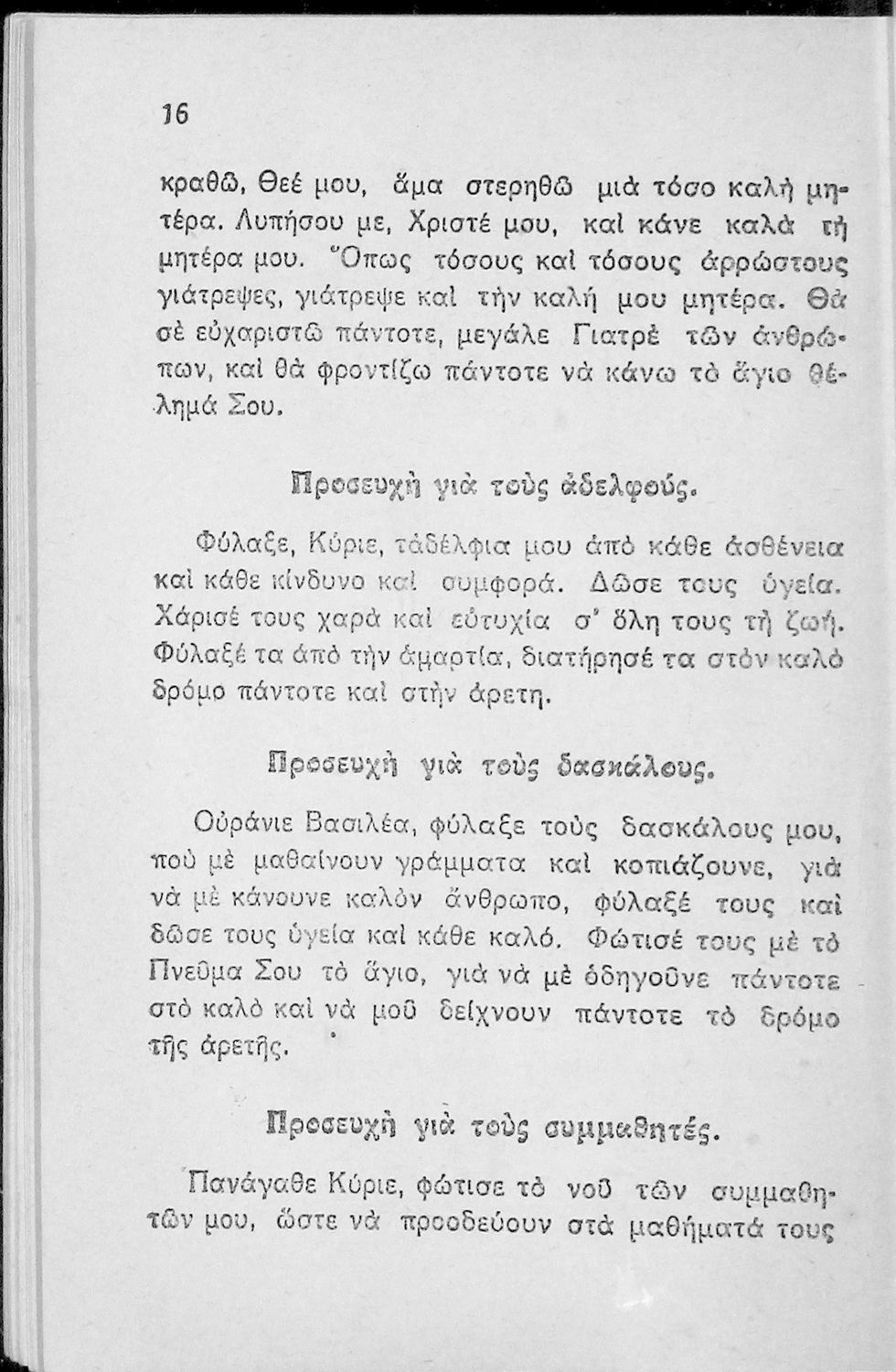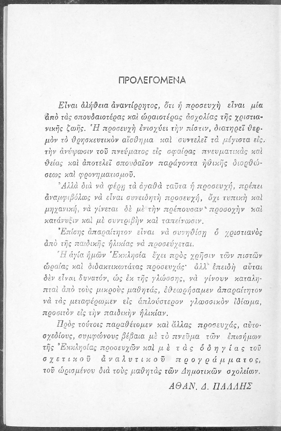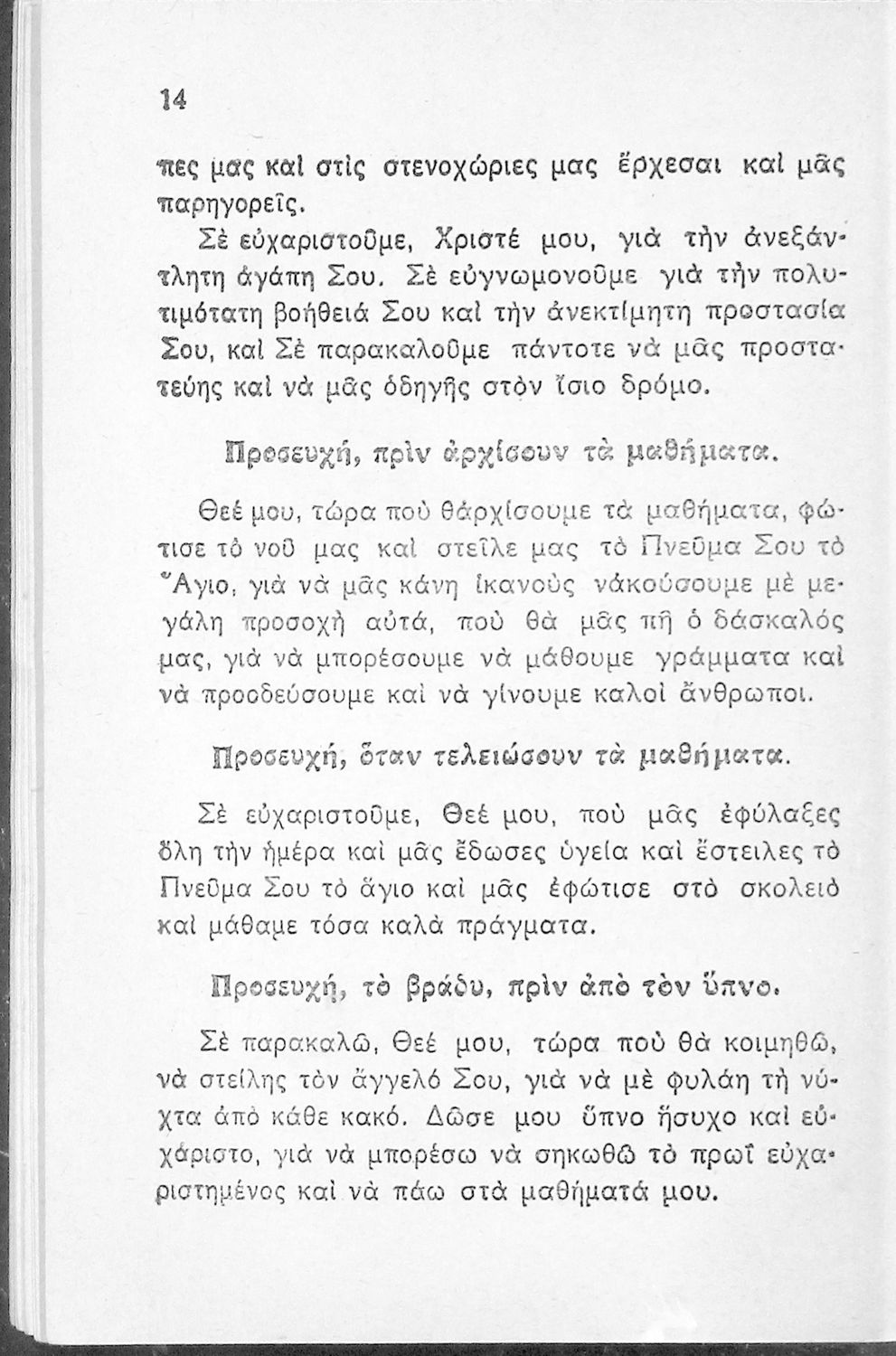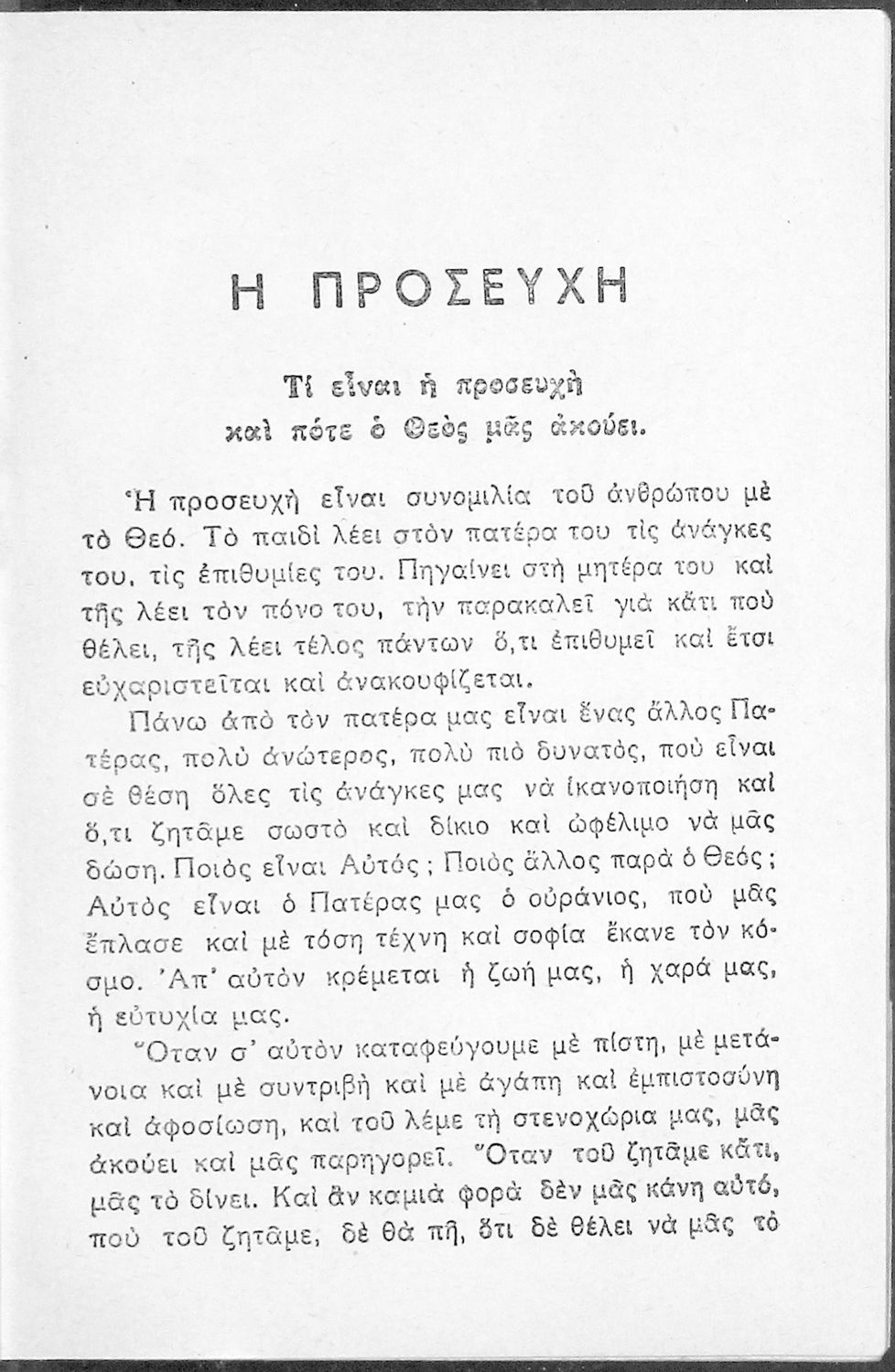 Μαθητικό βοήθημα που εστιάζει στην παιδαγωγική και θρησκευτική σπουδαιότητα της προσευχής και των διαφόρων ειδών προσευχής στην Ορθόδοξη Χριστιανική Εκκλησία. Εγκρίθηκε από την Αρχιεπισκοπή Αθηνών (Αρ. Πρωτ. 334/8-3-1949).
