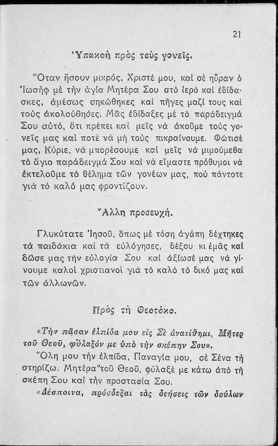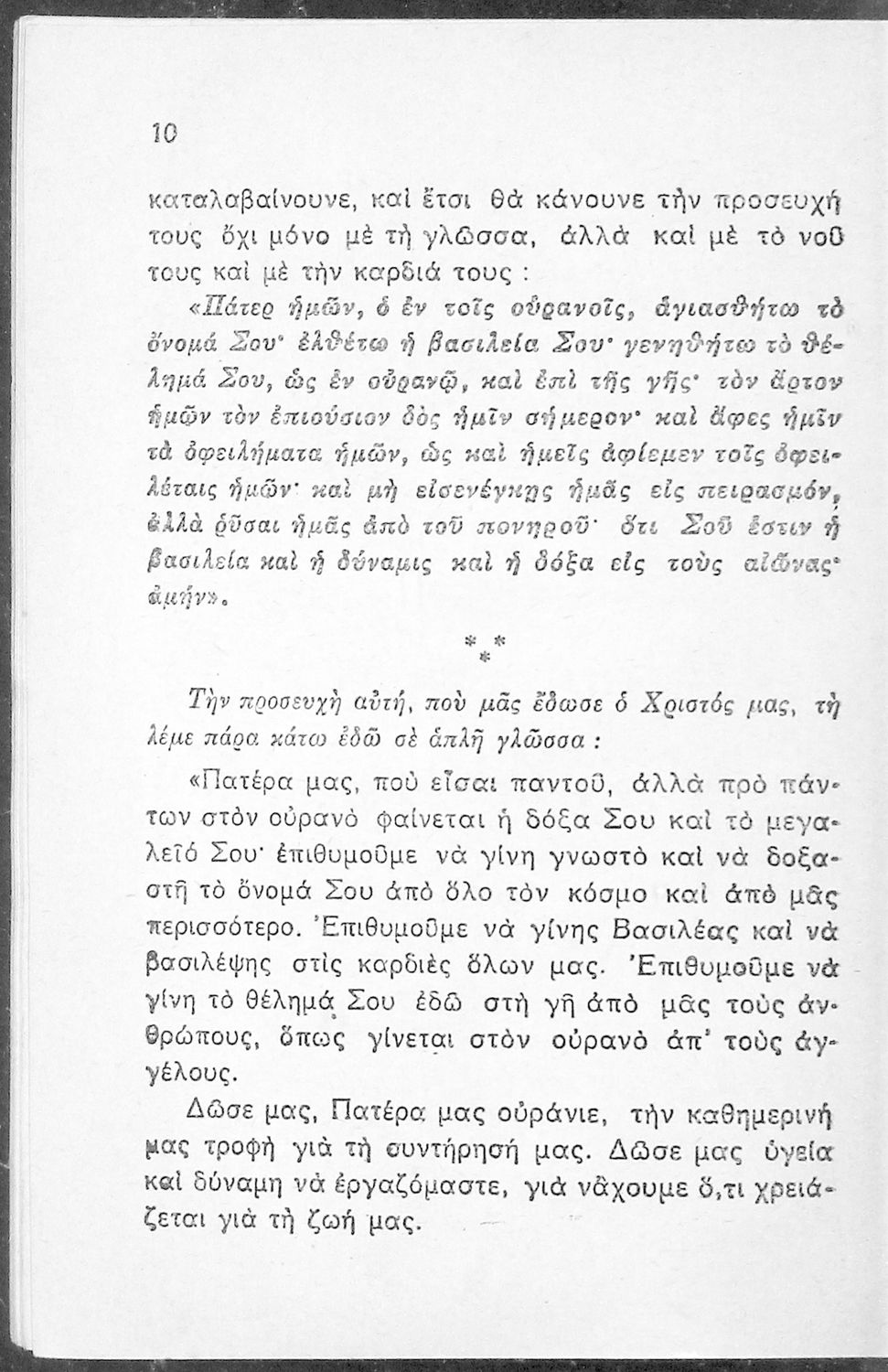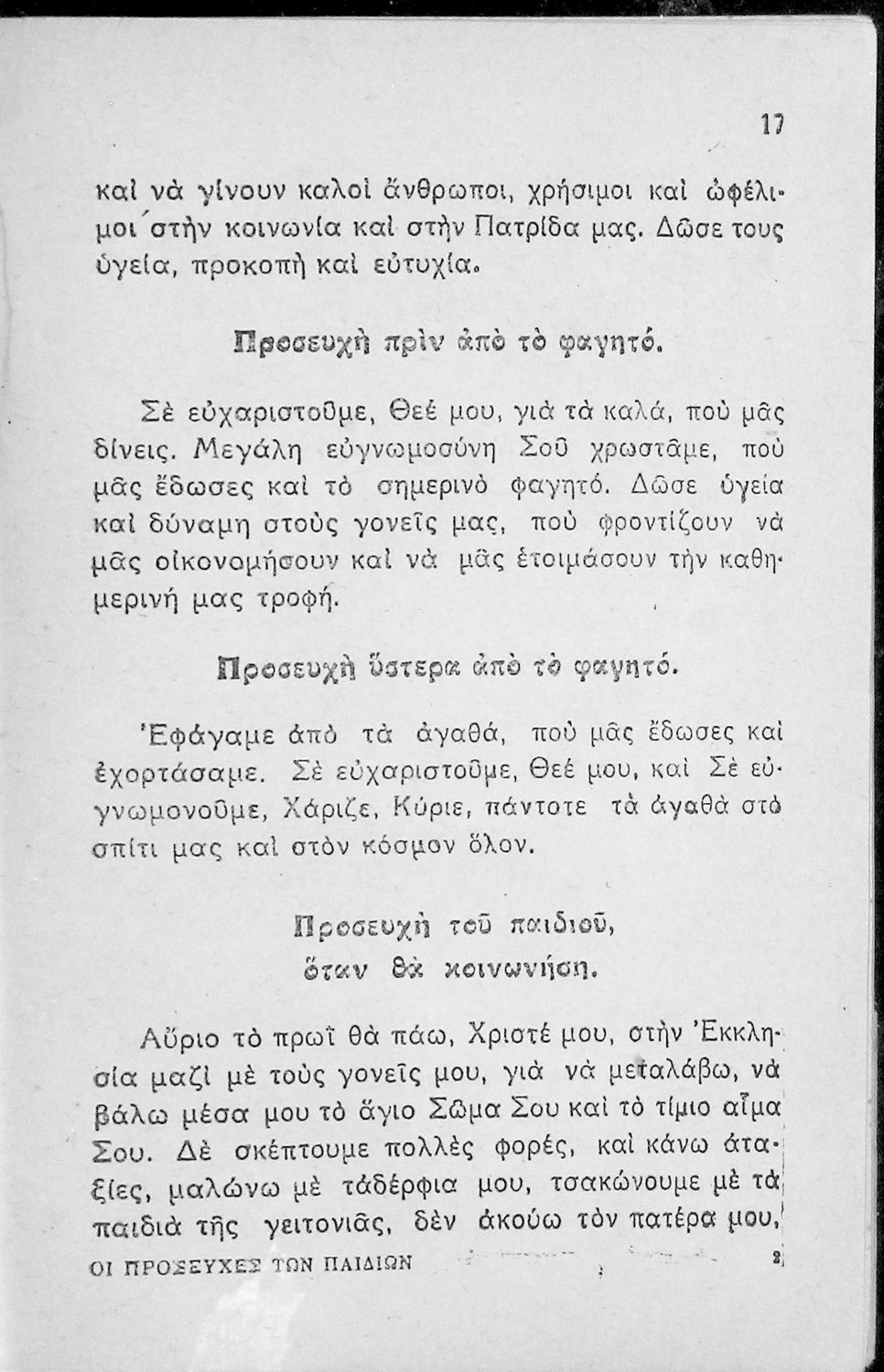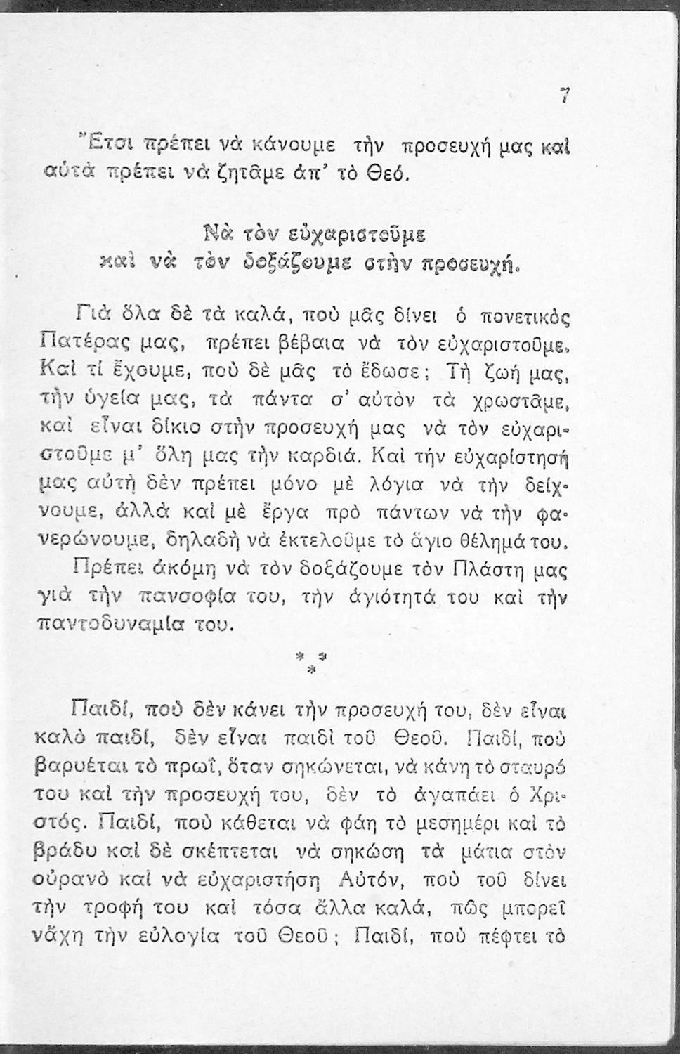 Μαθητικό βοήθημα που εστιάζει στην παιδαγωγική και θρησκευτική σπουδαιότητα της προσευχής και των διαφόρων ειδών προσευχής στην Ορθόδοξη Χριστιανική Εκκλησία. Εγκρίθηκε από την Αρχιεπισκοπή Αθηνών (Αρ. Πρωτ. 334/8-3-1949).