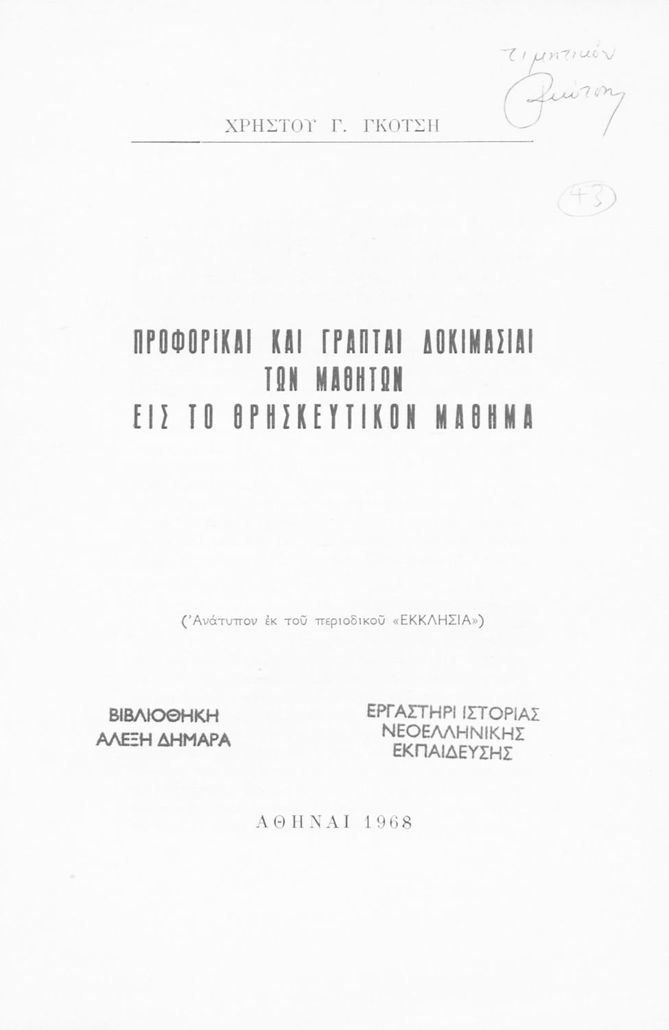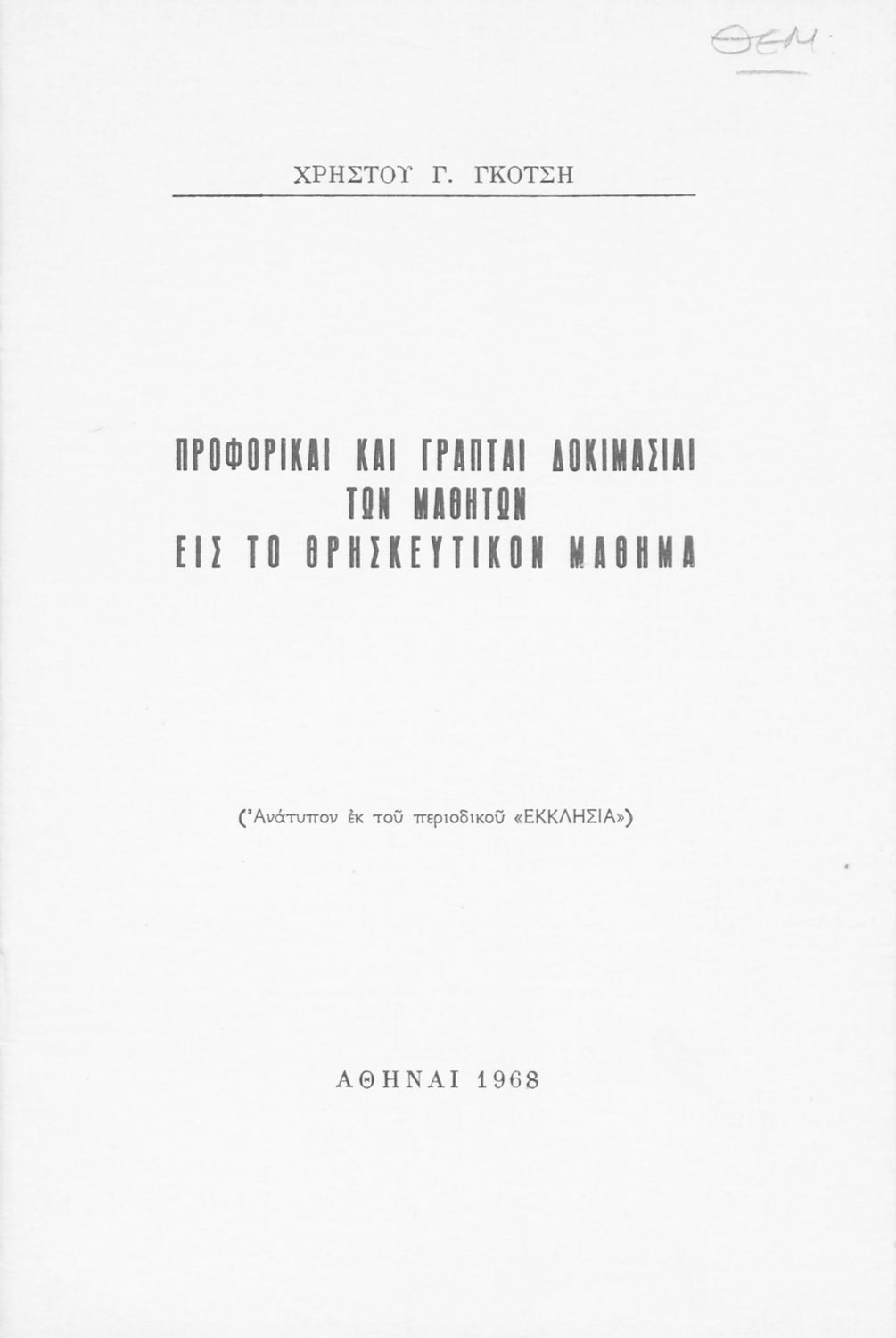 Κωδικός αναγνώρισης: 05-00043 Τίτλος: Προφορικαί και γραπταί δοκιμασίαι των μαθητών εις το Θρησκευτικόν μάθημα Συγγραφέας: Χρήστος Γ. Γκότσης Μέγεθος και υπόστρωμα: Παιδαγωγικό βοήθημα, μαλακό εξώφυλλο, 16 σελίδες. |