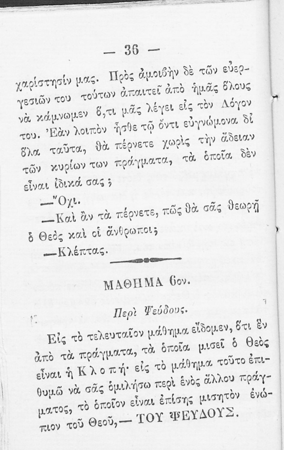 Μάθημα: Θρησκευτικά Γλώσσα: Καθαρεύουσα Παρουσίαση περιεχομένου: Παιδαγωγικό βοήθημα με έντονο θρησκευτικό προσανατολισμό που απευθύνεται σε δασκάλους και γονείς και αποσκοπεί στην ηθική διαπαιδαγώγηση των παιδιών. Είναι γραμμένο με τη μορφή ερωταποκρίσεων και περιλαμβάνει ερωτήσεις κατανόησης. |