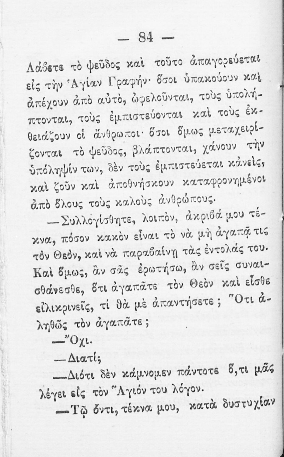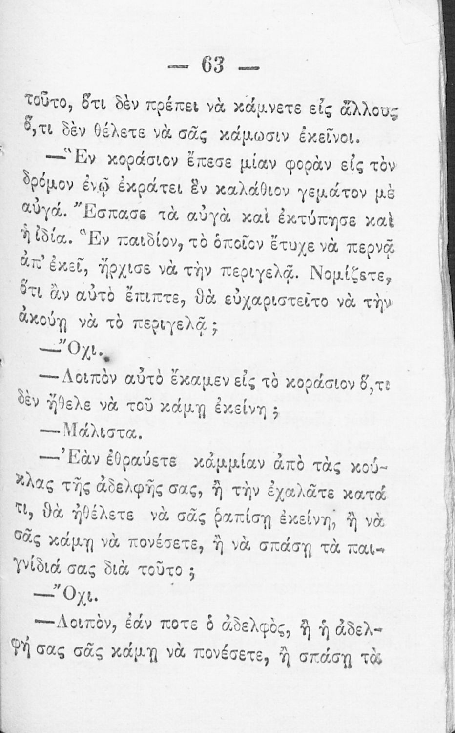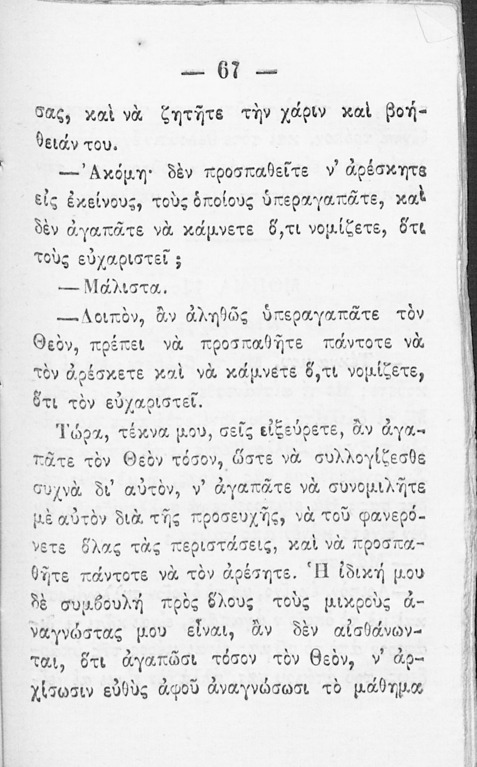 Παρουσίαση περιεχομένου: Παιδαγωγικό βοήθημα με έντονο θρησκευτικό προσανατολισμό που απευθύνεται σε δασκάλους και γονείς και αποσκοπεί στην ηθική διαπαιδαγώγηση των παιδιών. Είναι γραμμένο με τη μορφή ερωταποκρίσεων και περιλαμβάνει ερωτήσεις κατανόησης.
