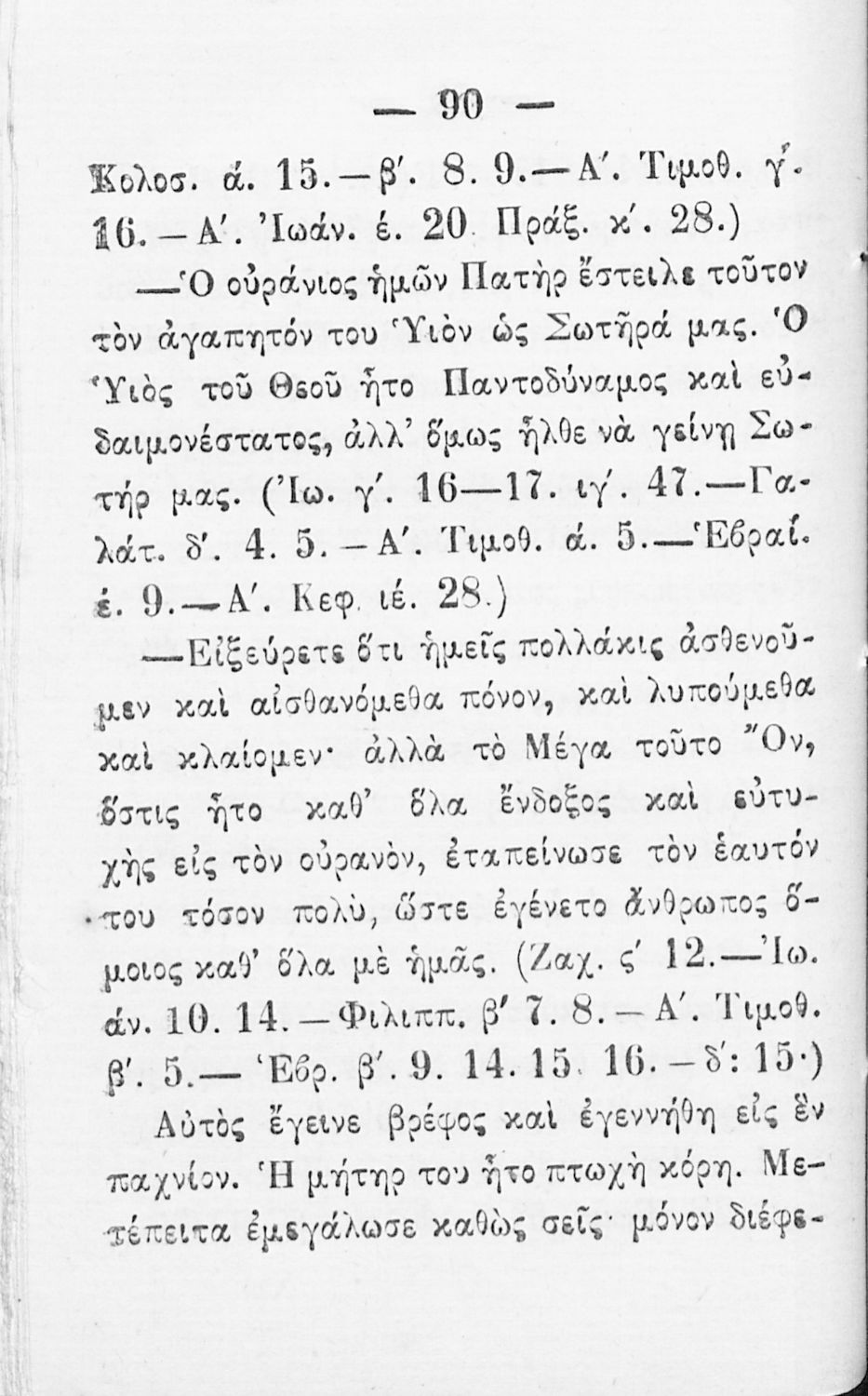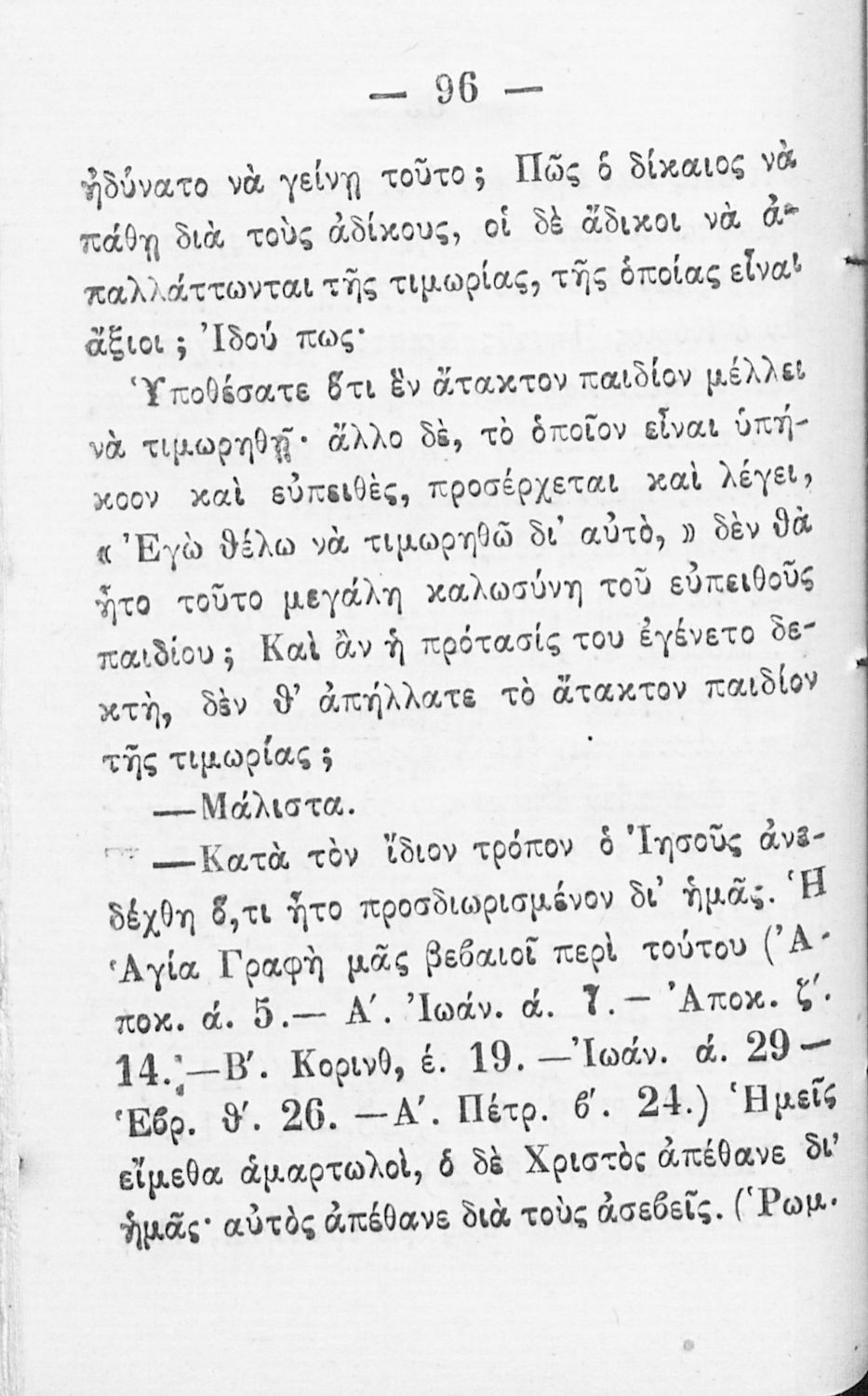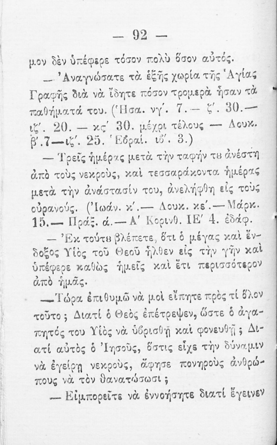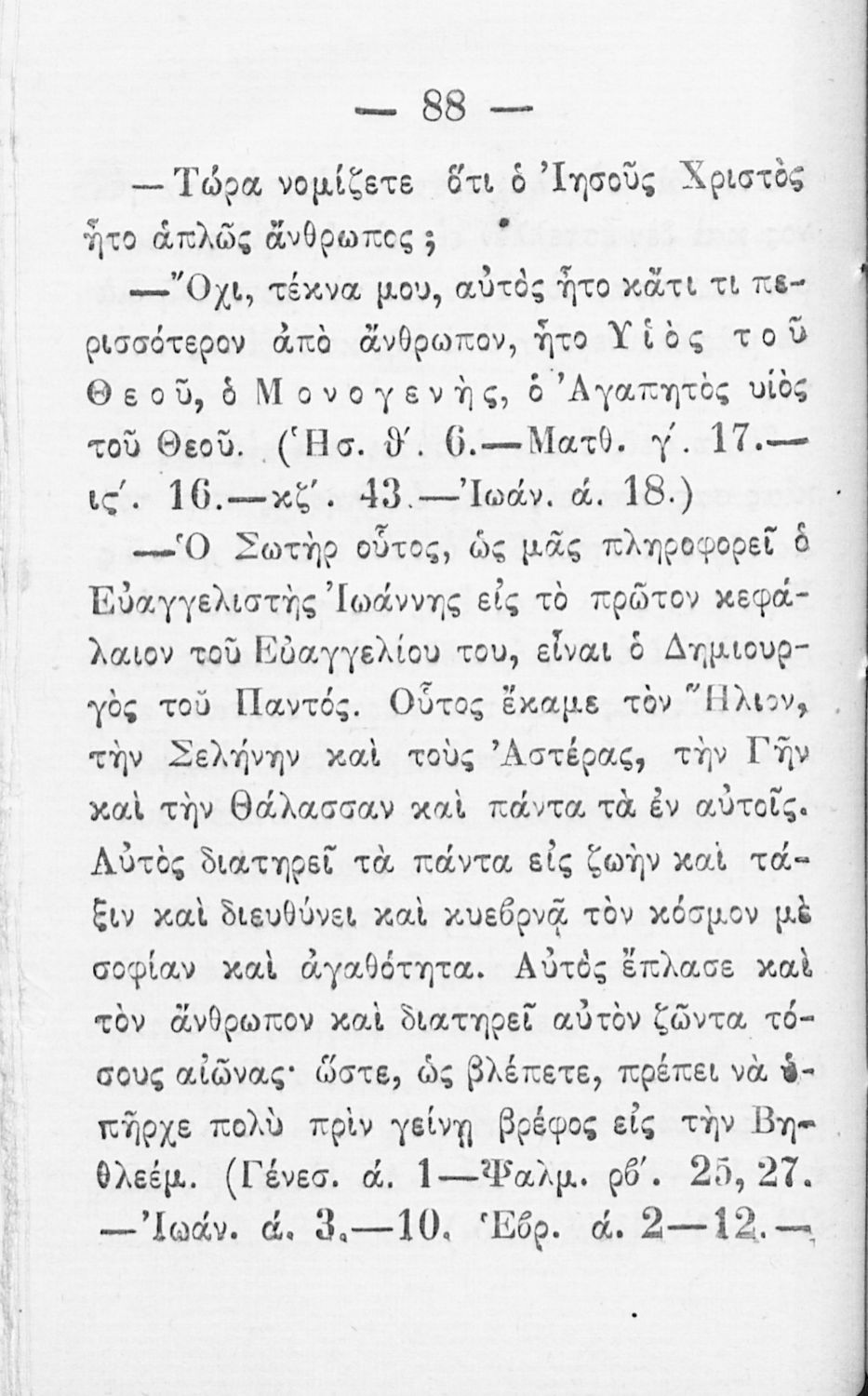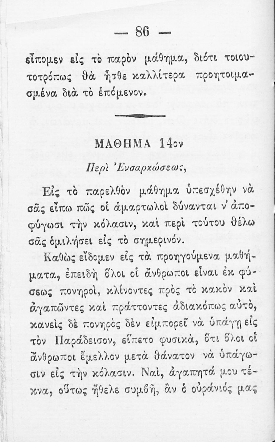 Μάθημα: Θρησκευτικά Γλώσσα: Καθαρεύουσα Παρουσίαση περιεχομένου: Παιδαγωγικό βοήθημα με έντονο θρησκευτικό προσανατολισμό που απευθύνεται σε δασκάλους και γονείς και αποσκοπεί στην ηθική διαπαιδαγώγηση των παιδιών. Είναι γραμμένο με τη μορφή ερωταποκρίσεων και περιλαμβάνει ερωτήσεις κατανόησης. |