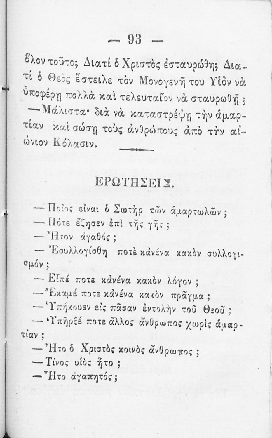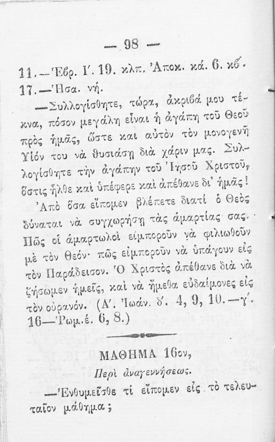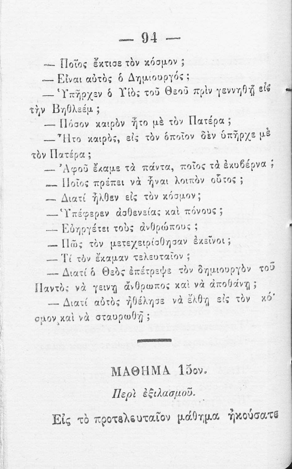 Παιδαγωγικό βοήθημα με έντονο θρησκευτικό προσανατολισμό που απευθύνεται σε δασκάλους και γονείς και αποσκοπεί στην ηθική διαπαιδαγώγηση των παιδιών. Είναι γραμμένο με τη μορφή ερωταποκρίσεων και περιλαμβάνει ερωτήσεις κατανόησης.