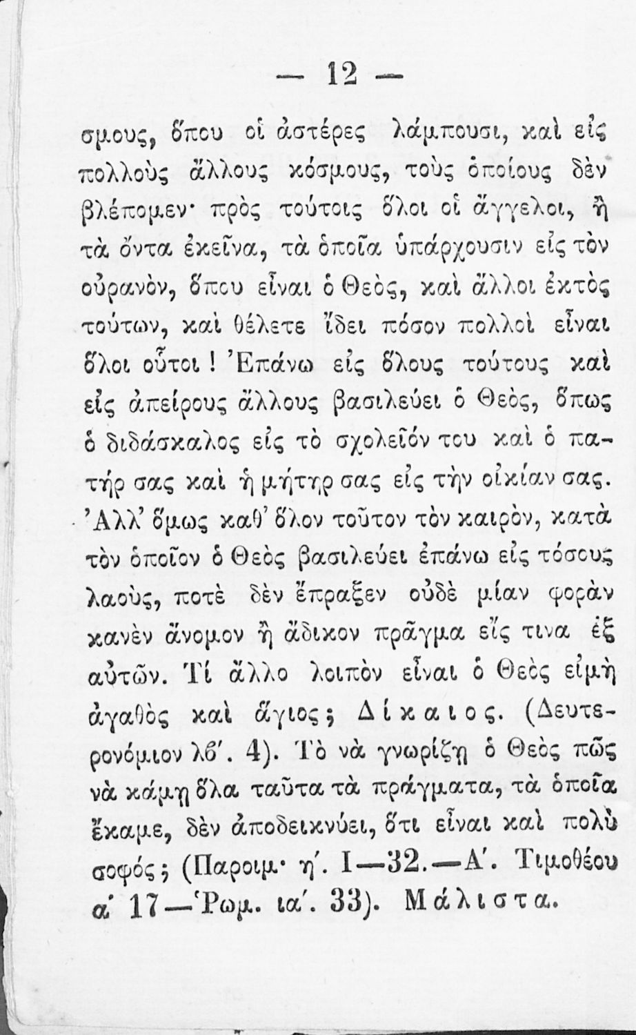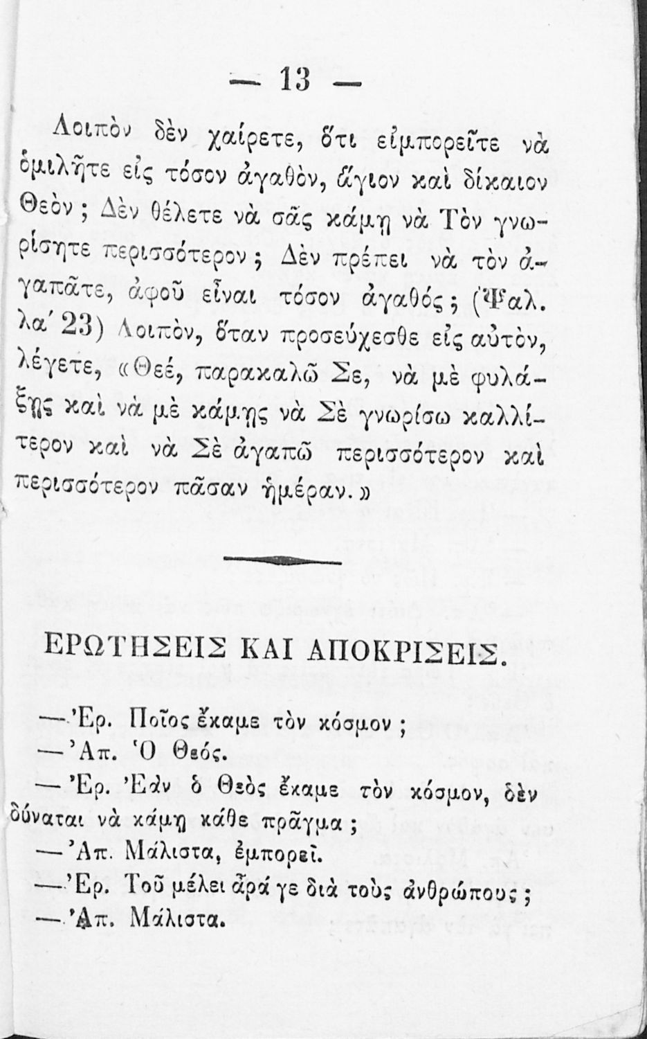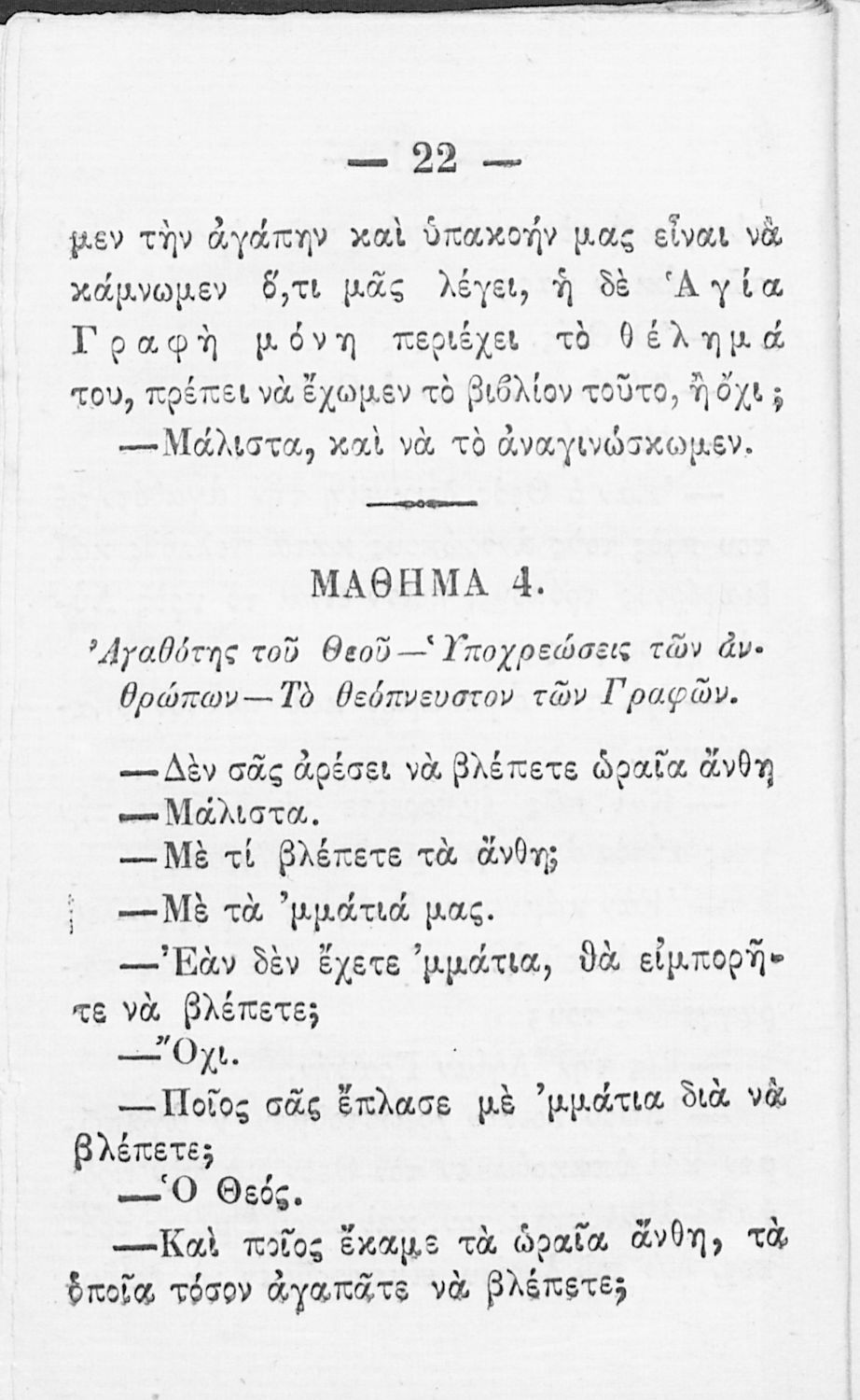 Μάθημα: Θρησκευτικά Γλώσσα: Καθαρεύουσα Παρουσίαση περιεχομένου: Παιδαγωγικό βοήθημα με έντονο θρησκευτικό προσανατολισμό που απευθύνεται σε δασκάλους και γονείς και αποσκοπεί στην ηθική διαπαιδαγώγηση των παιδιών. Είναι γραμμένο με τη μορφή ερωταποκρίσεων και περιλαμβάνει ερωτήσεις κατανόησης. |
