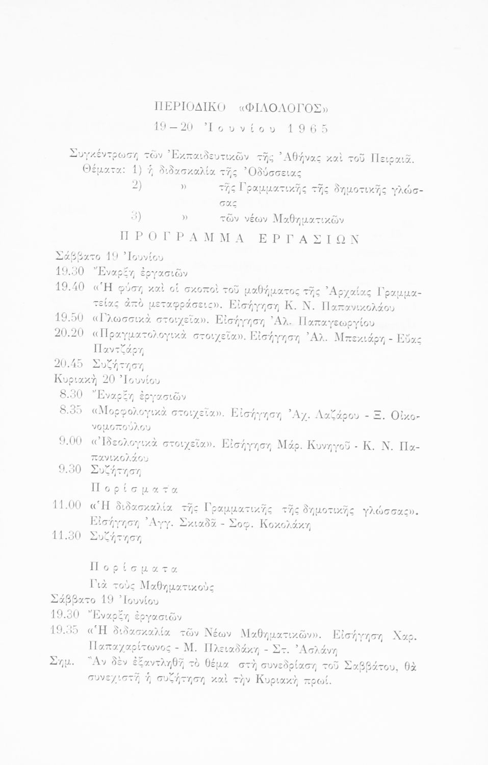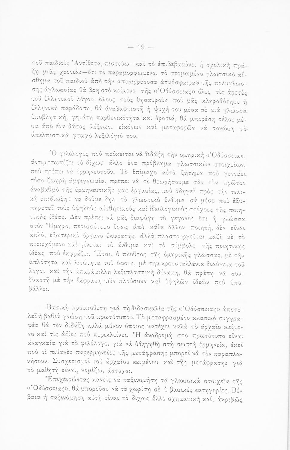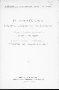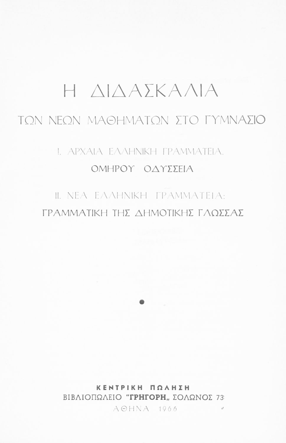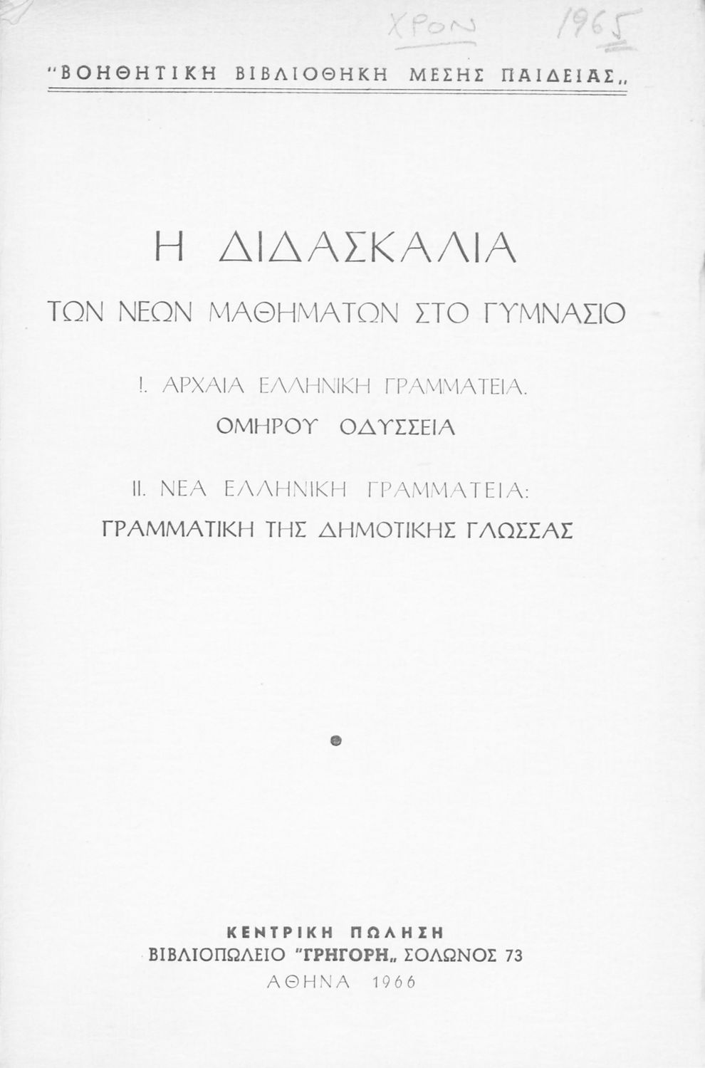Έκδοση που περιέχει τα πρακτικά συνεδρίου που πραγματοποιήθηκε στις 19-20 Ιουνίου 1966 υπό την αιγίδα του περιοδικού Φιλόλογος. Οι εισηγήσεις εστιάζουν στους τρόπους διδασκαλίας της αρχαίας ελληνικής γραμματείας από μετάφραση και συγκεκριμένα της Οδύσσειας καθώς και την διδασκαλία της γραμματικής της δημοτικής.