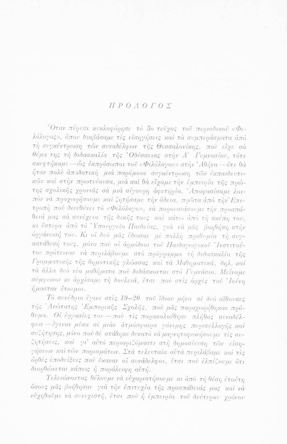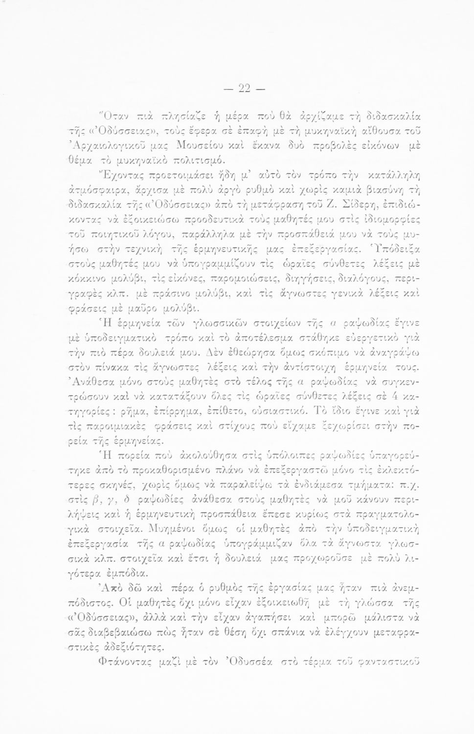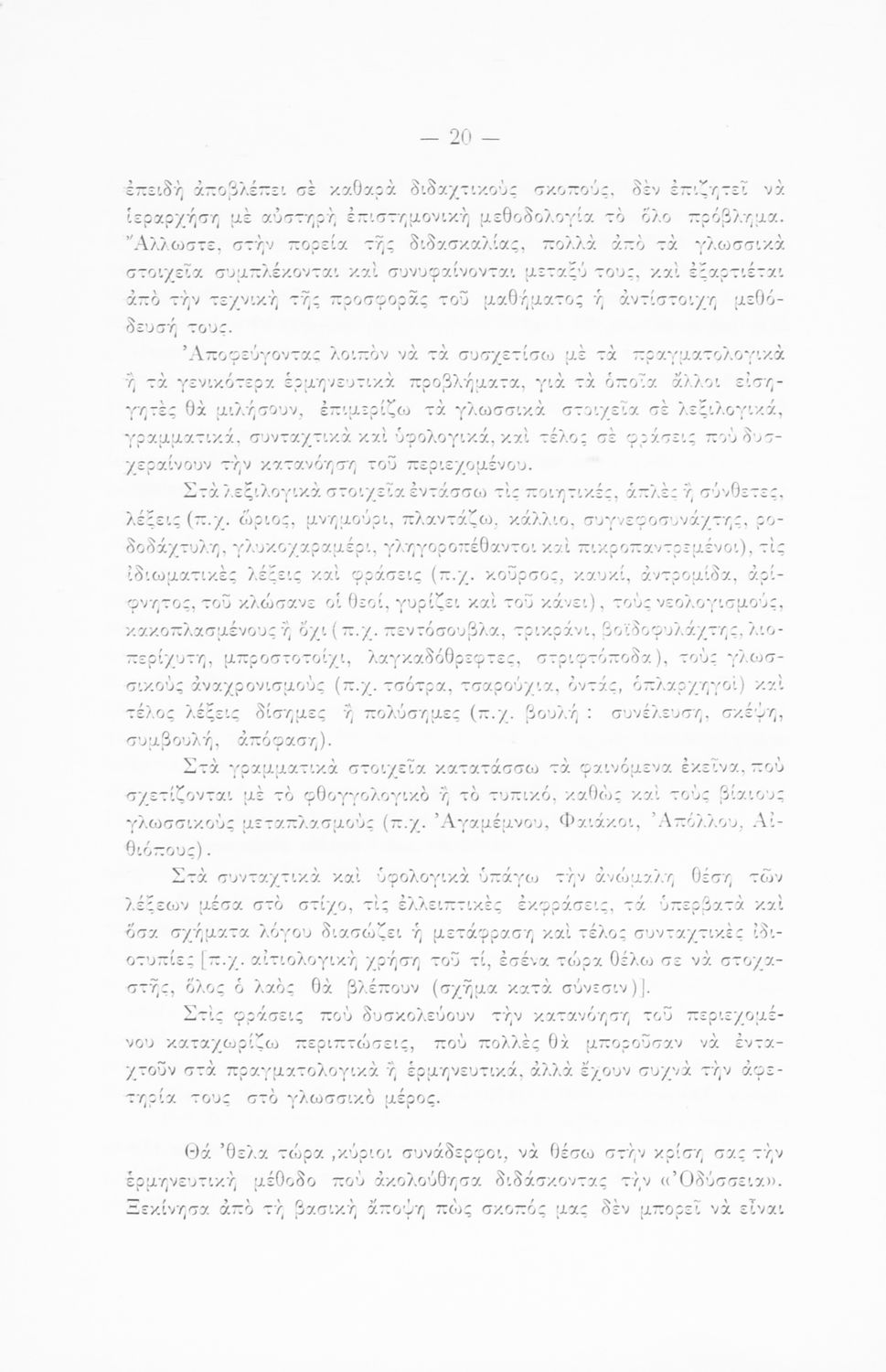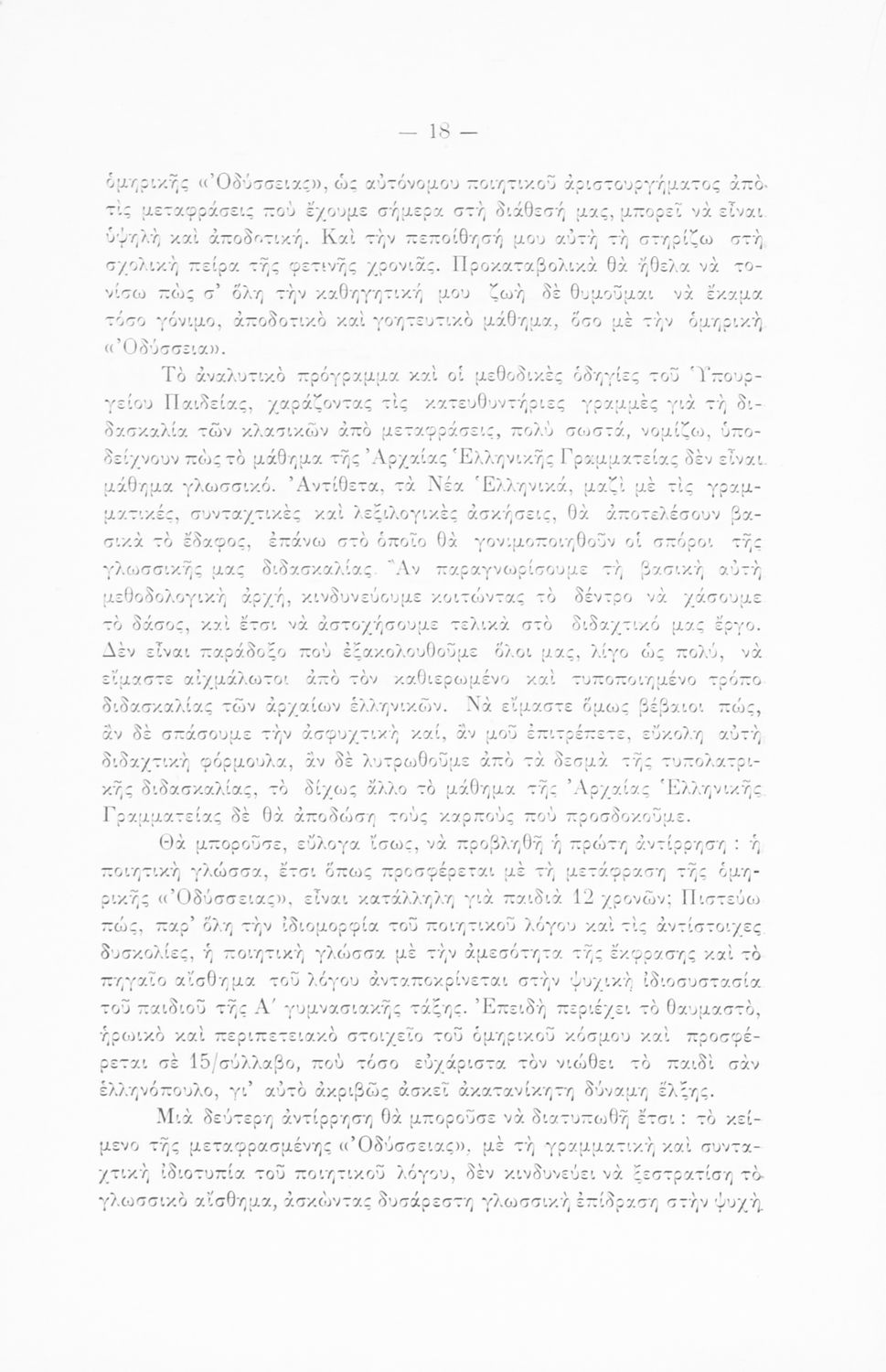 Έκδοση που περιέχει τα πρακτικά συνεδρίου που πραγματοποιήθηκε στις 19-20 Ιουνίου 1966 υπό την αιγίδα του περιοδικού Φιλόλογος. Οι εισηγήσεις εστιάζουν στους τρόπους διδασκαλίας της αρχαίας ελληνικής γραμματείας από μετάφραση και συγκεκριμένα της Οδύσσειας καθώς και την διδασκαλία της γραμματικής της δημοτικής.