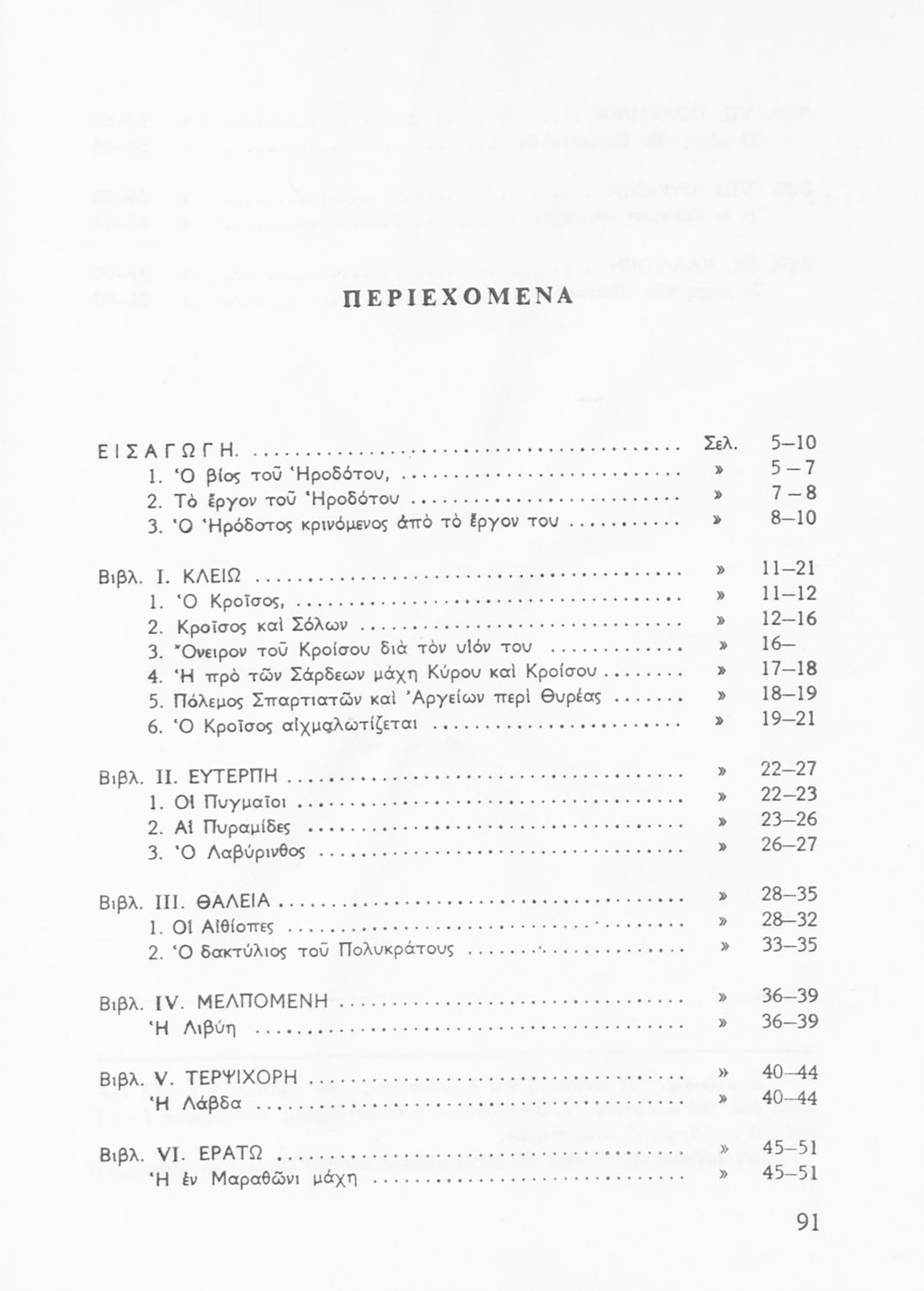 Σχολικό εγχειρίδιο Αρχαίων Ελληνικών Α΄ Γυμνασίου που περιλαμβάνει εισαγωγή στη ζωή και το έργο του Ηρόδοτου, και αποσπάσματα από τα 9 βιβλία της Ιστορίας του σε μετάφραση. Φέρει το σύμβολο της δικτατορίας.