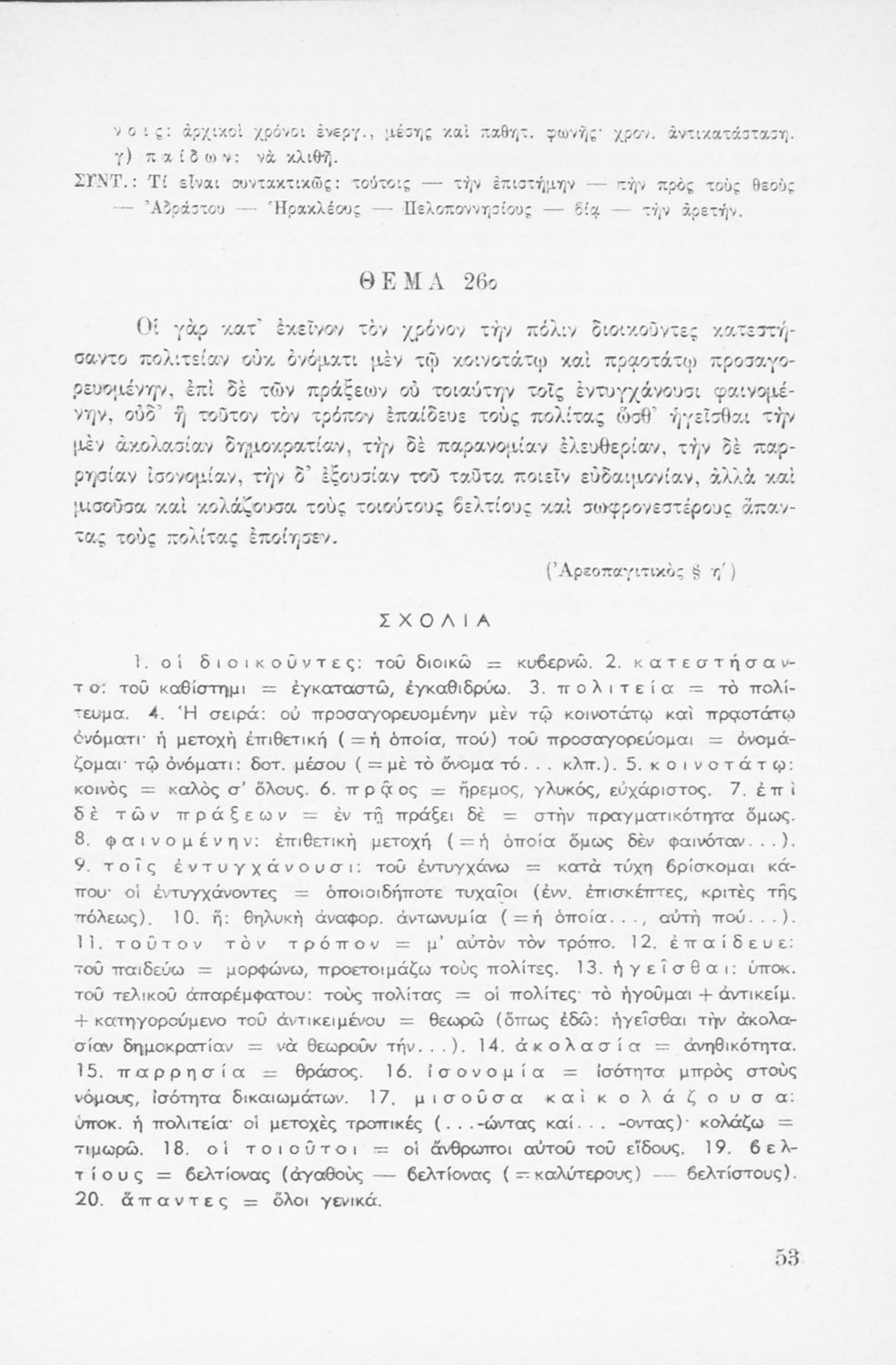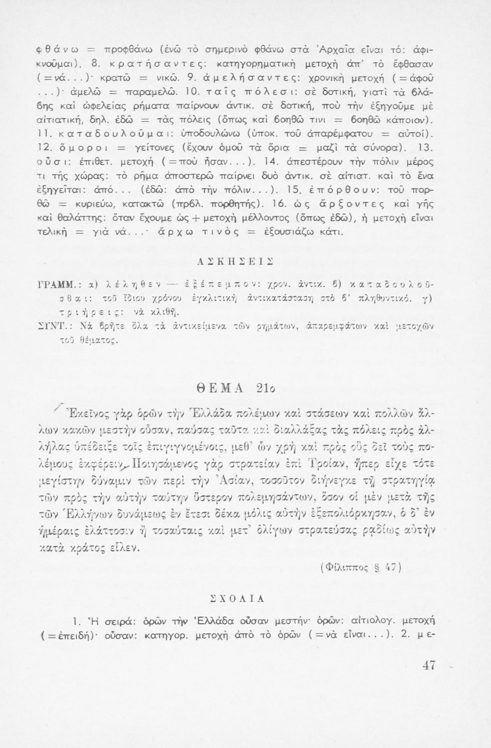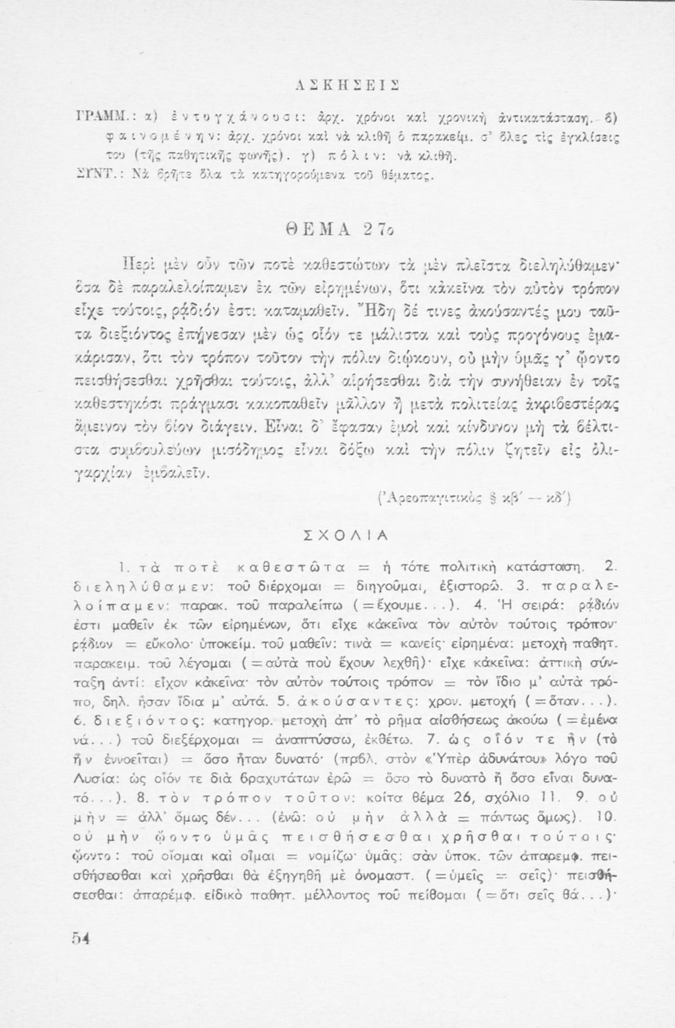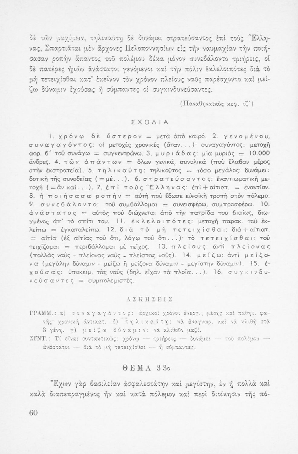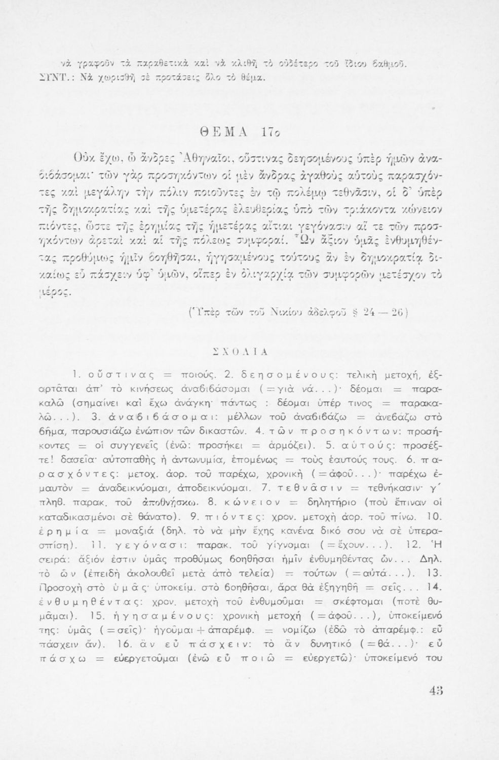 Μαθητικό βοήθημα Αρχαίων Ελληνικών Ε΄ Εξαταξίου Γυμνασίου που περιλαμβάνει μετάφραση των Α΄ και Β΄ Ολυνθιακών Λόγων του Δημοσθένη, και γραμματικές, ερμηνευτικές και συντακτικές παρατηρήσεις.