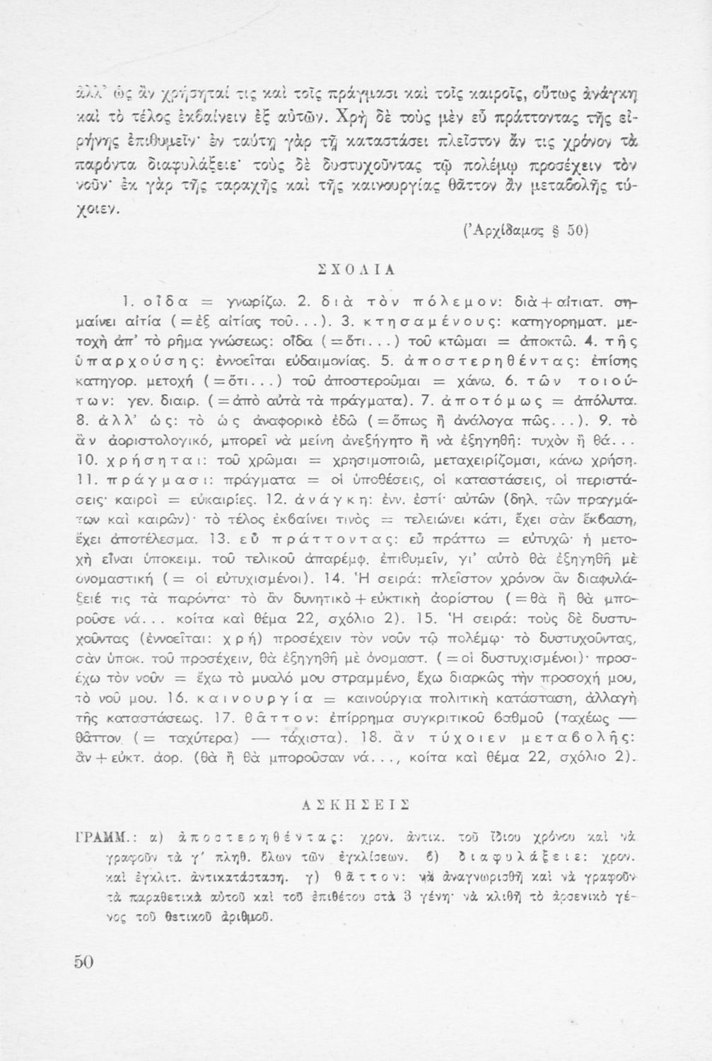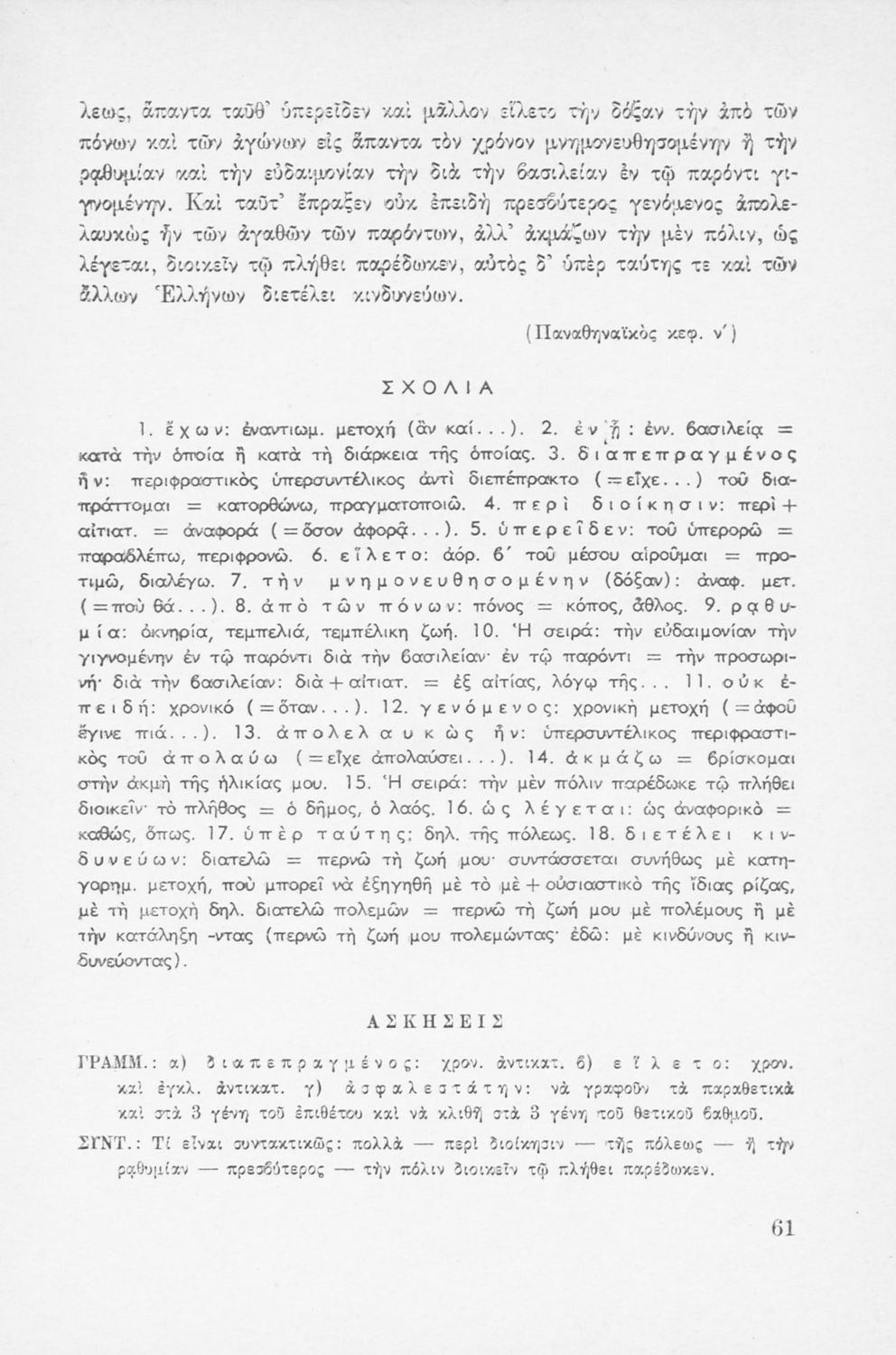 Σχολικό εγχειρίδιο Αρχαίων Ελληνικών Α' Λυκείου που περιλαμβάνει αποσπάσματα από κείμενα αρχαίων Ελλήνων συγγραφέων και γραμματικές, συντακτικές και ερμηνευτικές σημειώσεις. Περιέχει και ασκήσεις γραμματικής.