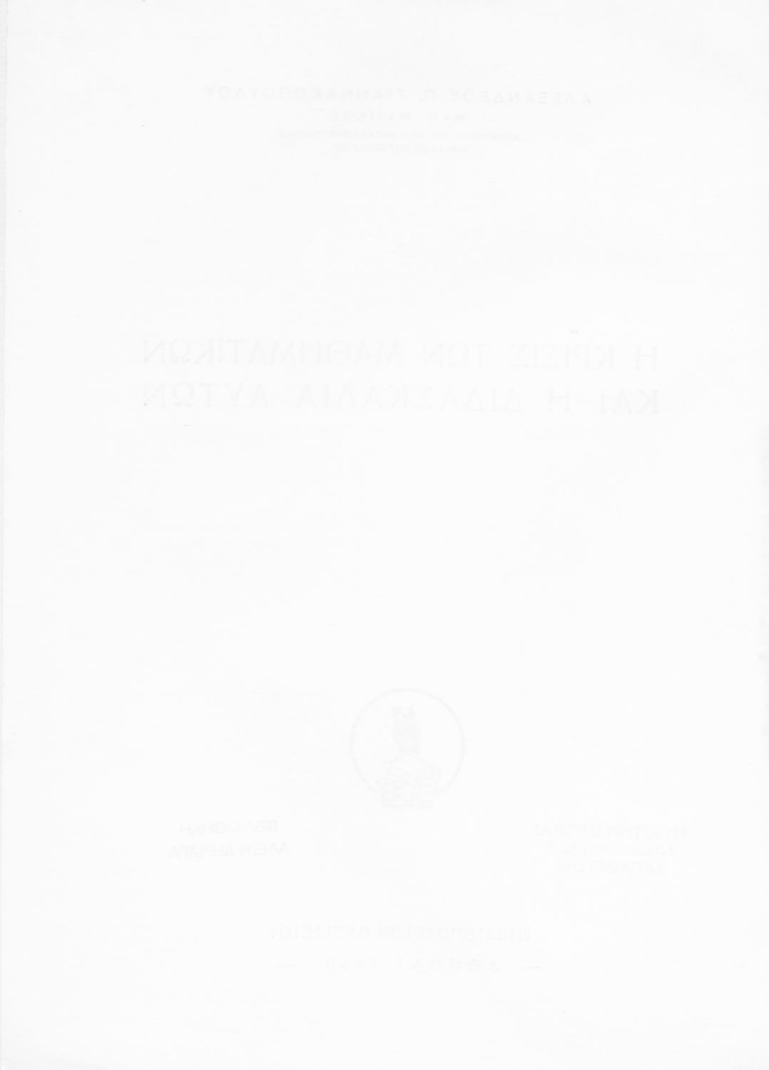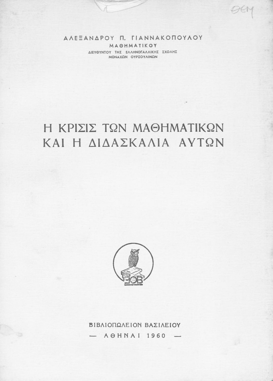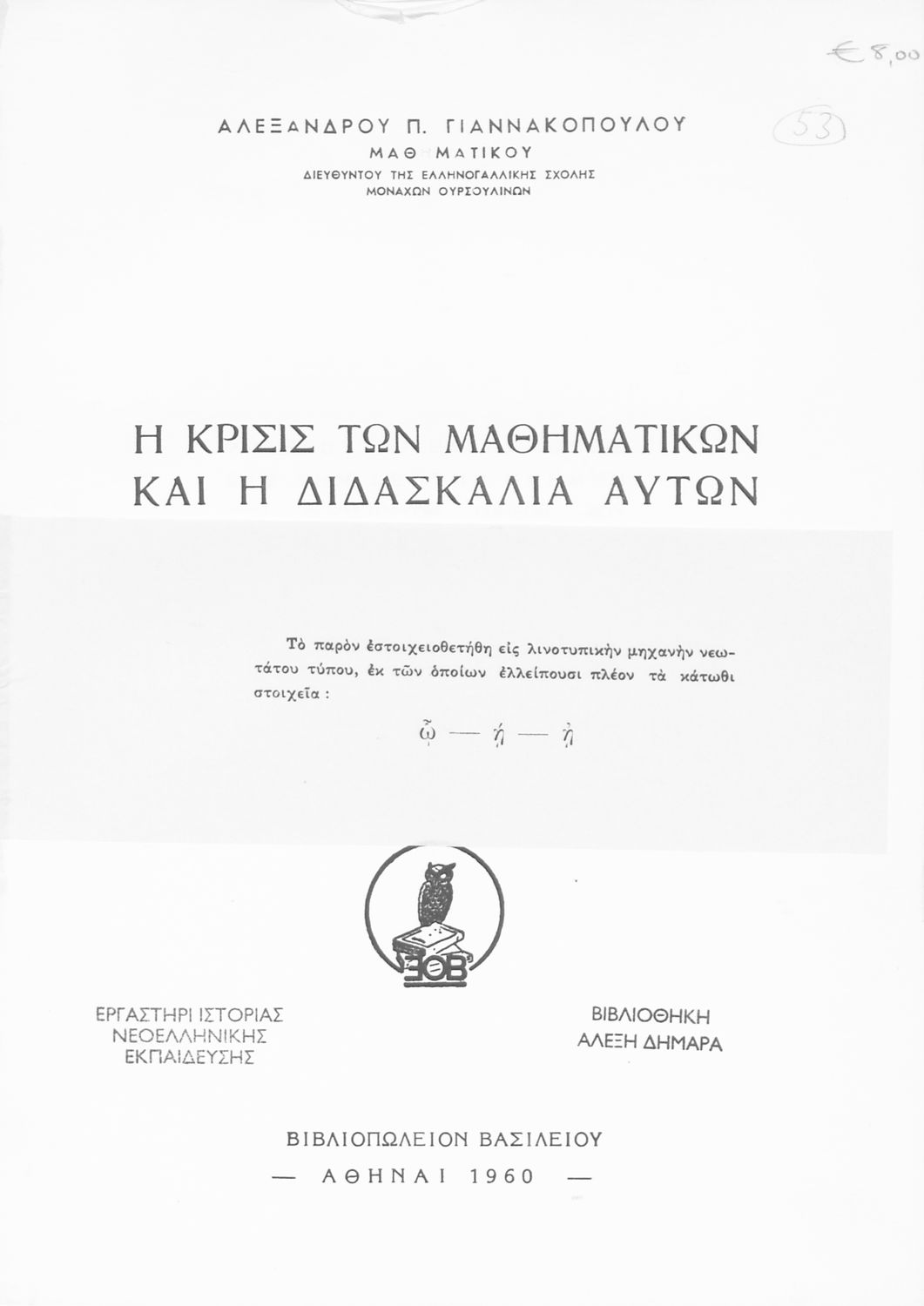 Κωδικός αναγνώρισης: 05-00053 Τίτλος: Η κρίσις των μαθηματικών και η διδασκαλία αυτών Συγγραφέας: Αλέξανδρος Π. Γιαννακόπουλος Μέγεθος και υπόστρωμα: Παιδαγωγικό βοήθημα, μαλακό εξώφυλλο, 119 σελίδες. Σχεδιαγράμματα (ασπρόμαυρα). |