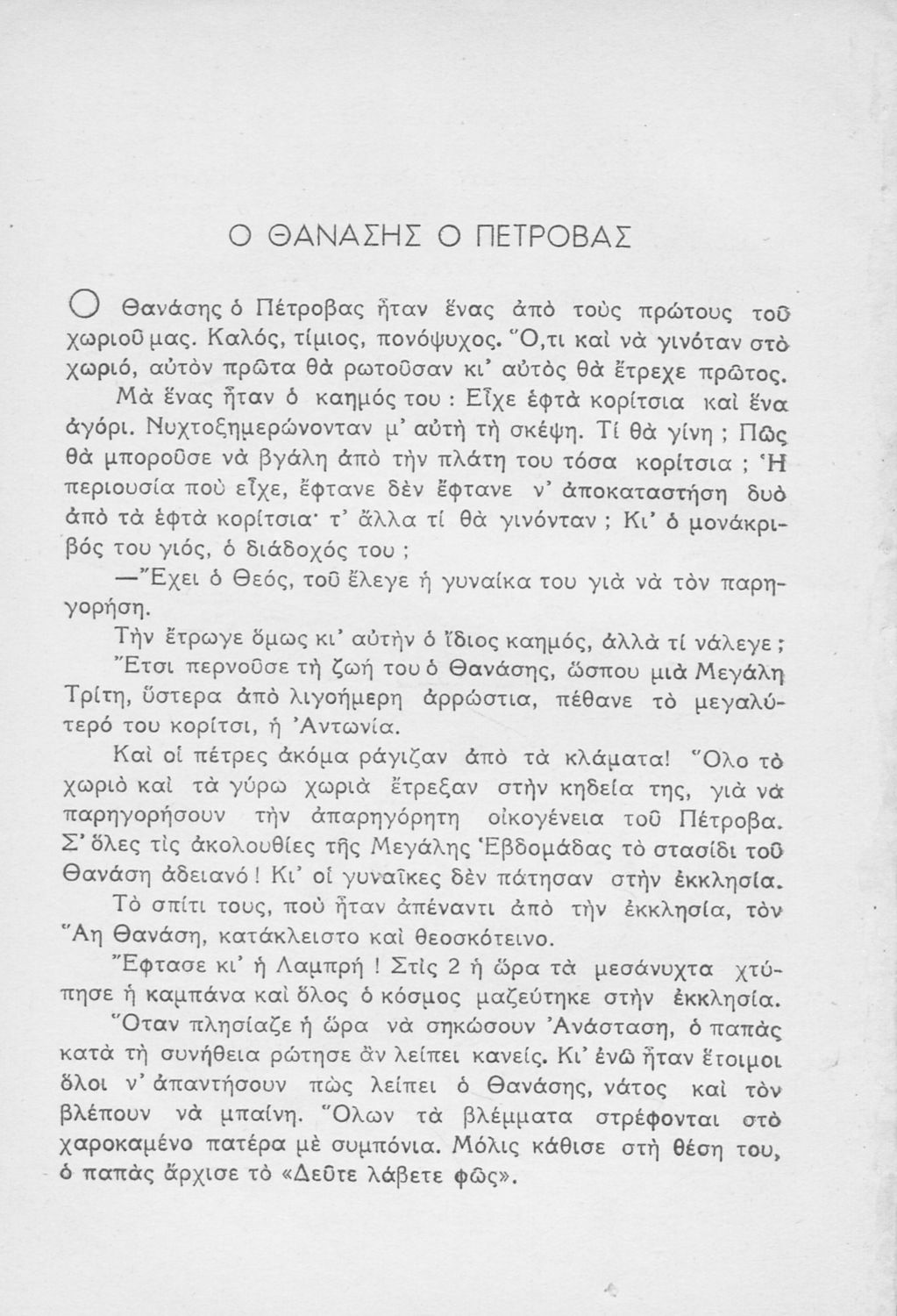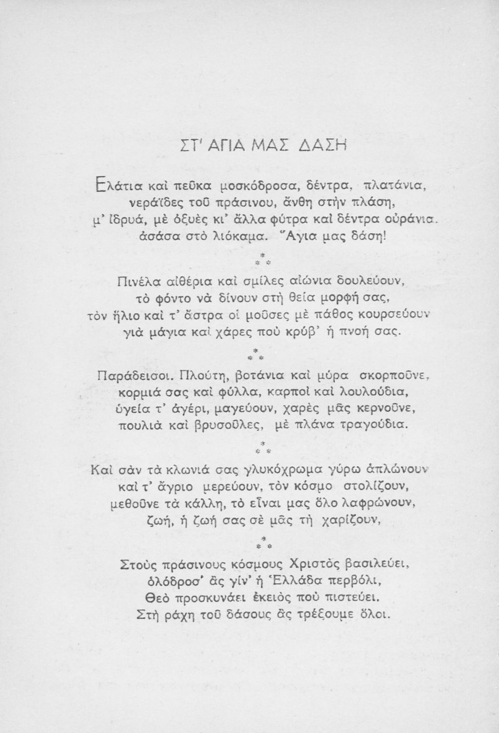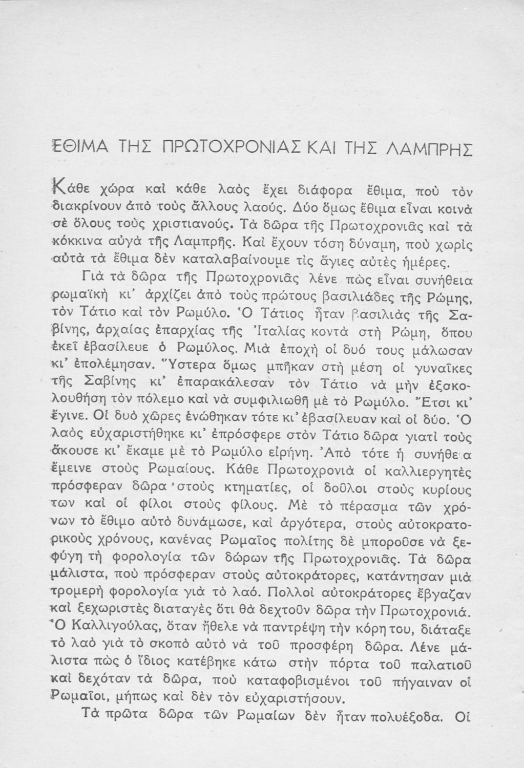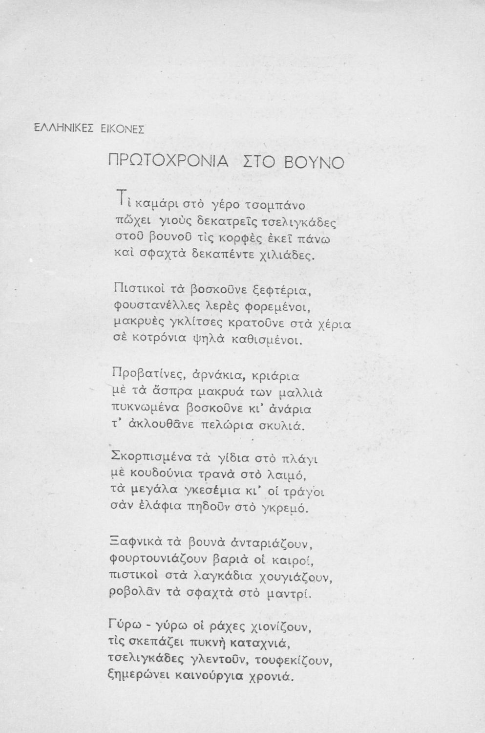 Αναγνωστικό που περιλαμβάνει πεζογραφήματα και ποιήματα εμπνευσμένα από την οικογενειακή και κοινωνική ζωή των παιδιών και των οικογενειών τους, την ελληνική ύπαιθρο, τις ελληνικές γιορτές και τις 4 εποχές του χρόνου. Διαφοροποιείται αισθητά από τα βιβλία της επόμενης αλλά και της προηγούμενης περιόδου που εμμένουν αρκετά στο ιδεολογικό τρίπτυχο "Πατρίς-θρησκεία-οικογένεια".