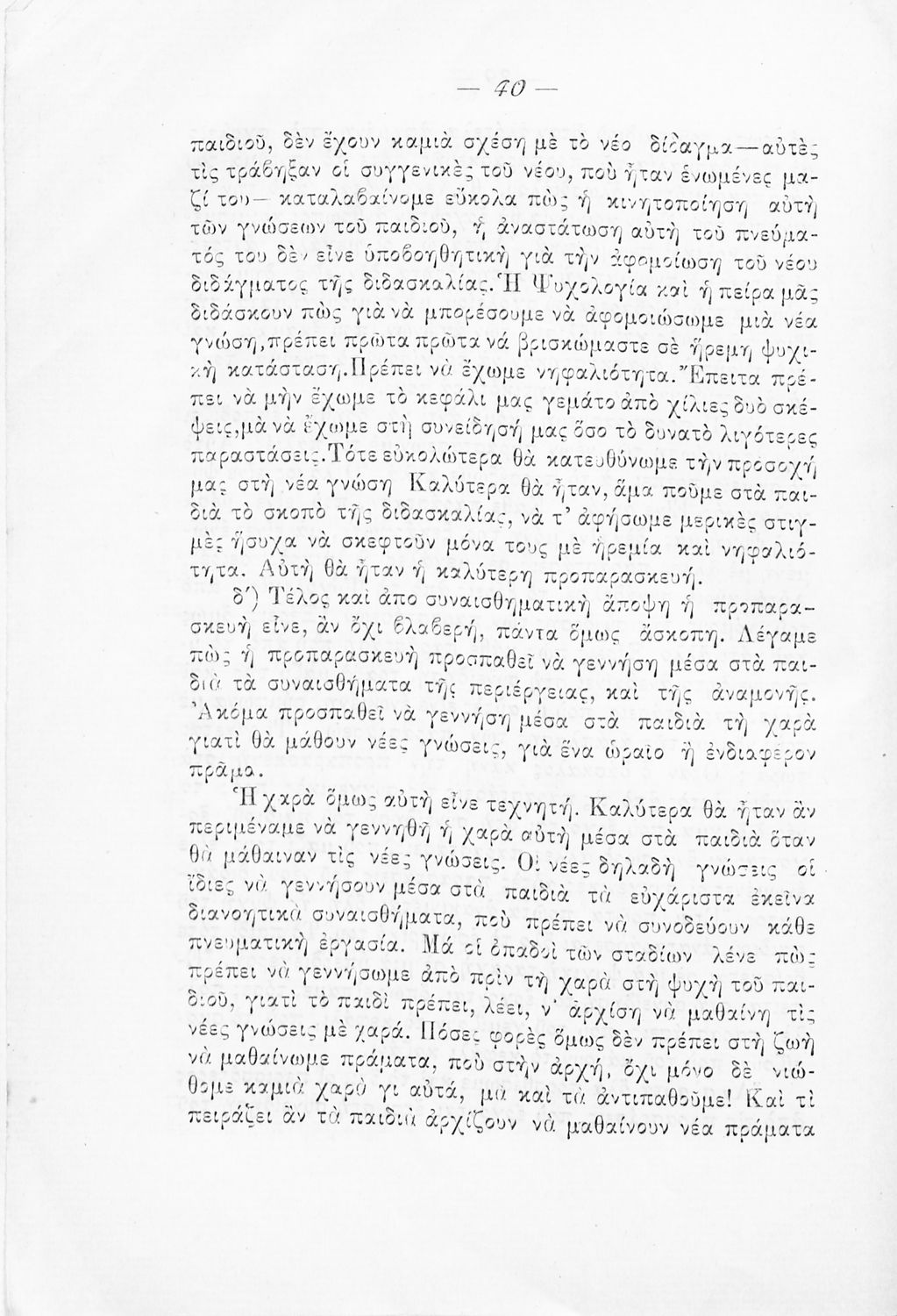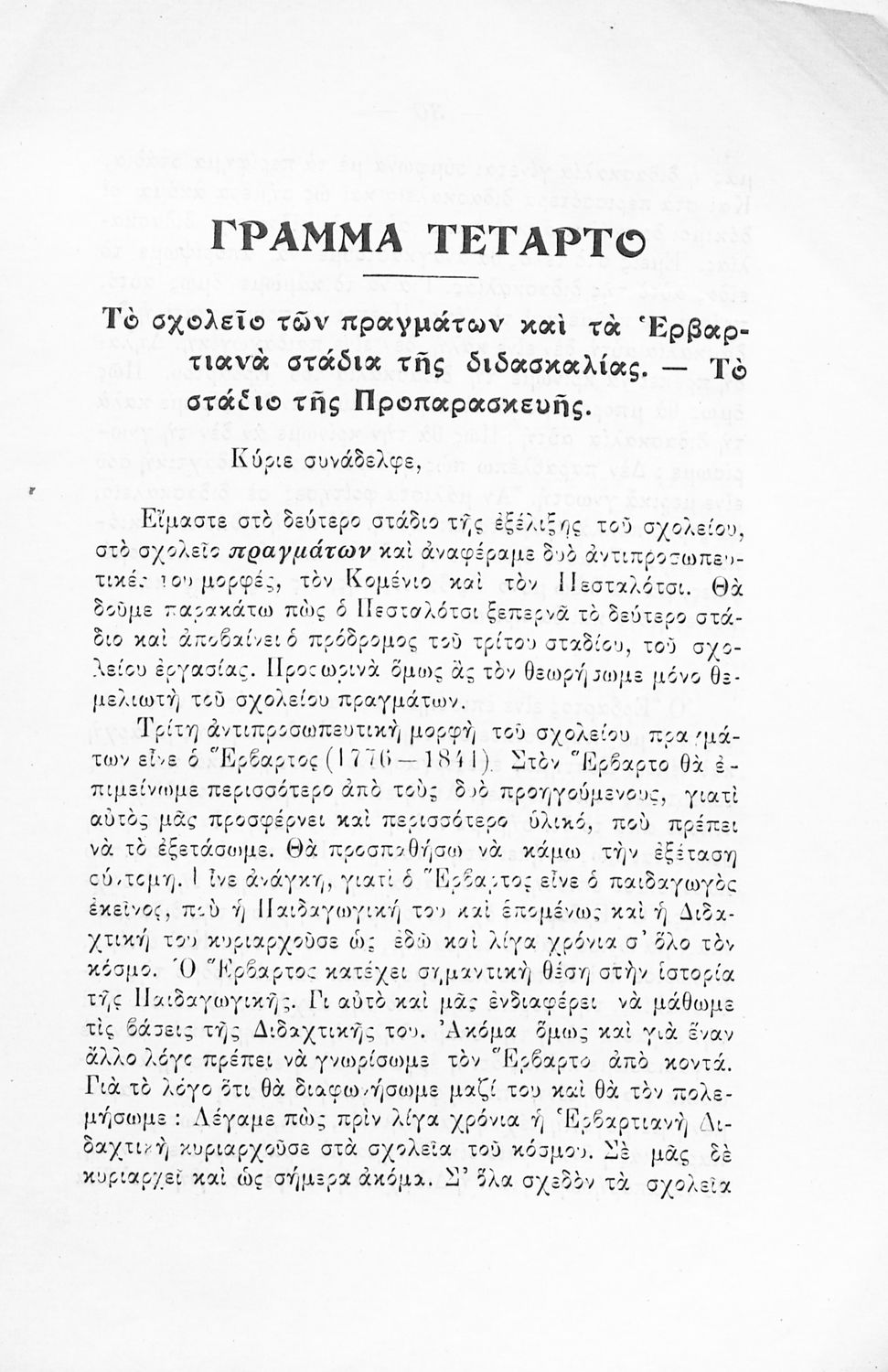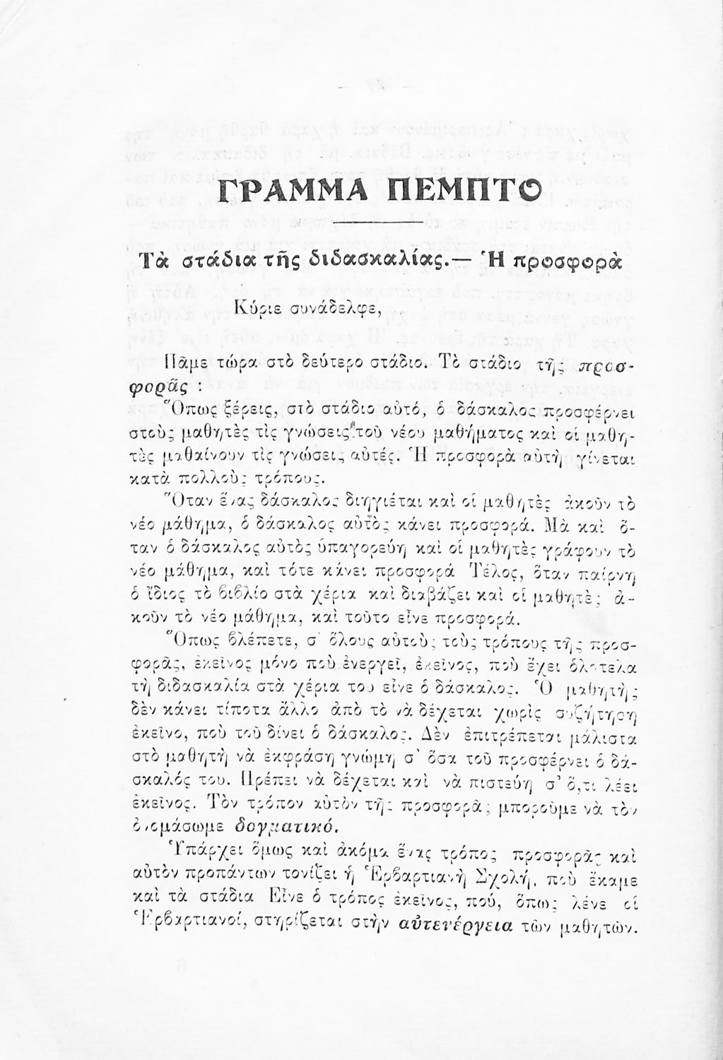 Παρουσίαση περιεχομένου: Παιδαγωγικό βοήθημα που περιλαμβάνει σε μορφή γραμμάτων απόψεις περί της ερβαρτιανής προσέγγισης, περί της παιδαγωγικής θεώρησης του Σχολείου Εργασίας, της διαδικασίας της διδασκαλίας και άλλων παιδαγωγικών αρχών.