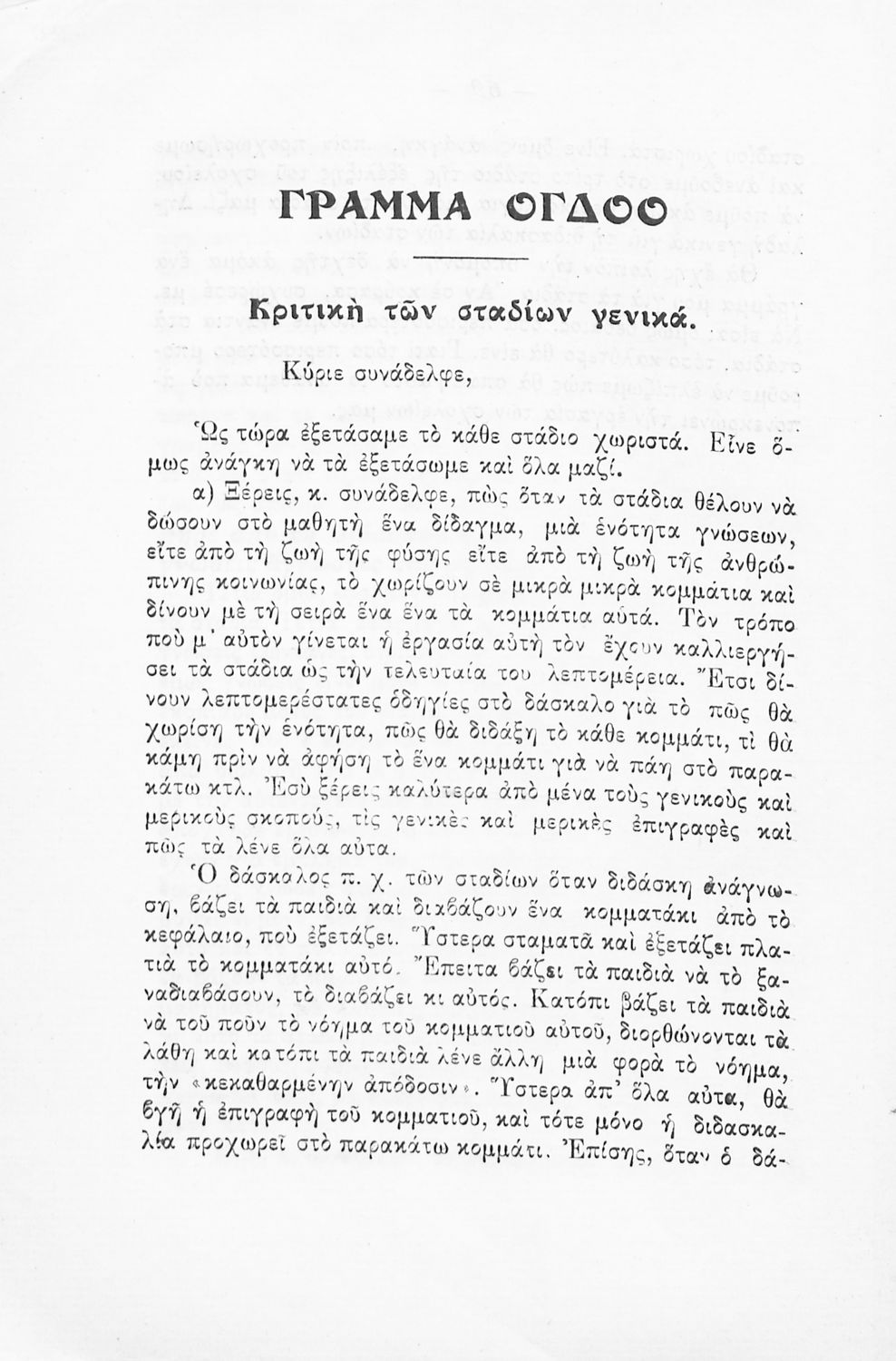 Γλώσσα: Δημοτική Παρουσίαση περιεχομένου: Παιδαγωγικό βοήθημα που περιλαμβάνει σε μορφή γραμμάτων απόψεις περί της ερβαρτιανής προσέγγισης, περί της παιδαγωγικής θεώρησης του Σχολείου Εργασίας, της διαδικασίας της διδασκαλίας και άλλων παιδαγωγικών αρχών. |