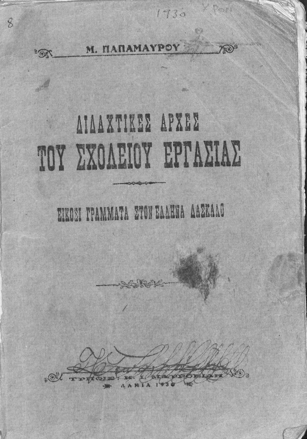Κωδικός αναγνώρισης: 05-00059 Τίτλος: Διδαχτικές αρχές του Σχολείου Εργασίας. Είκοσι γράμματα στον Έλληνα δάσκαλο Συγγραφέας: Μ. Παπαμαύρος Μέγεθος και υπόστρωμα: Παιδαγωγικό βοήθημα, μαλακό εξώφυλλο, 165 σελίδες. |