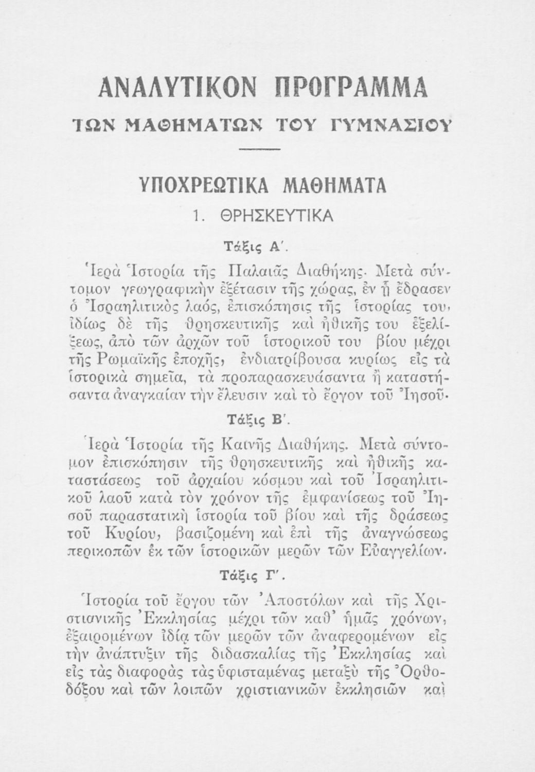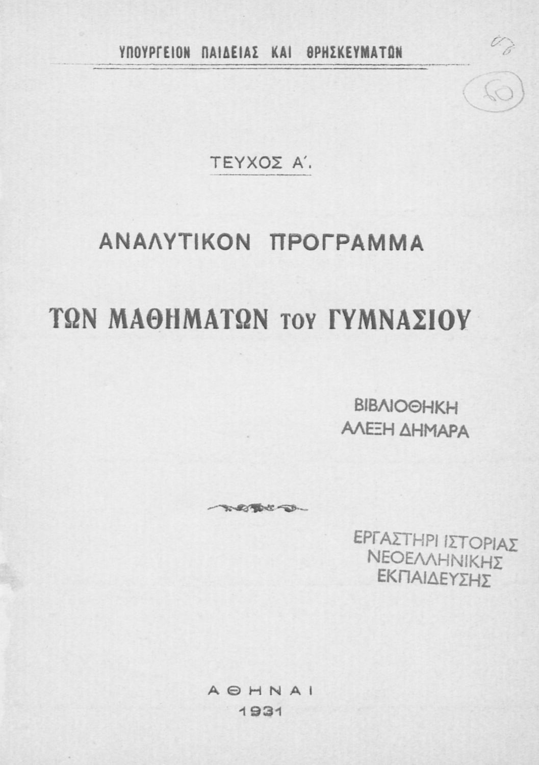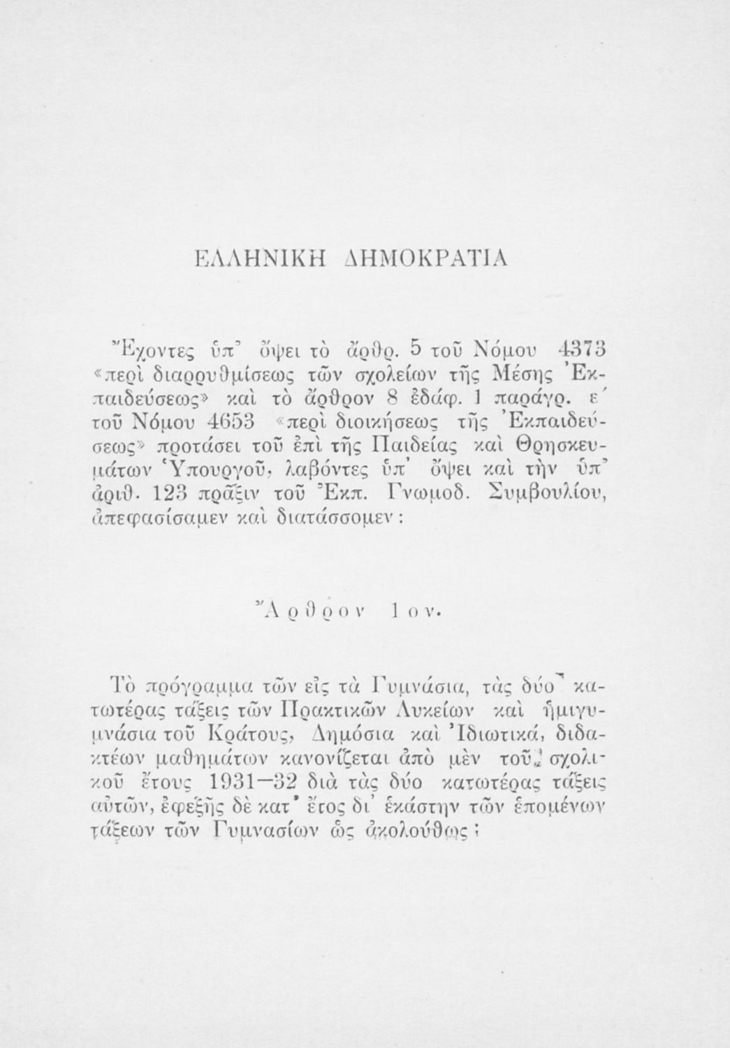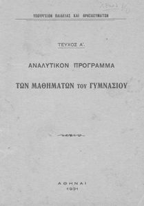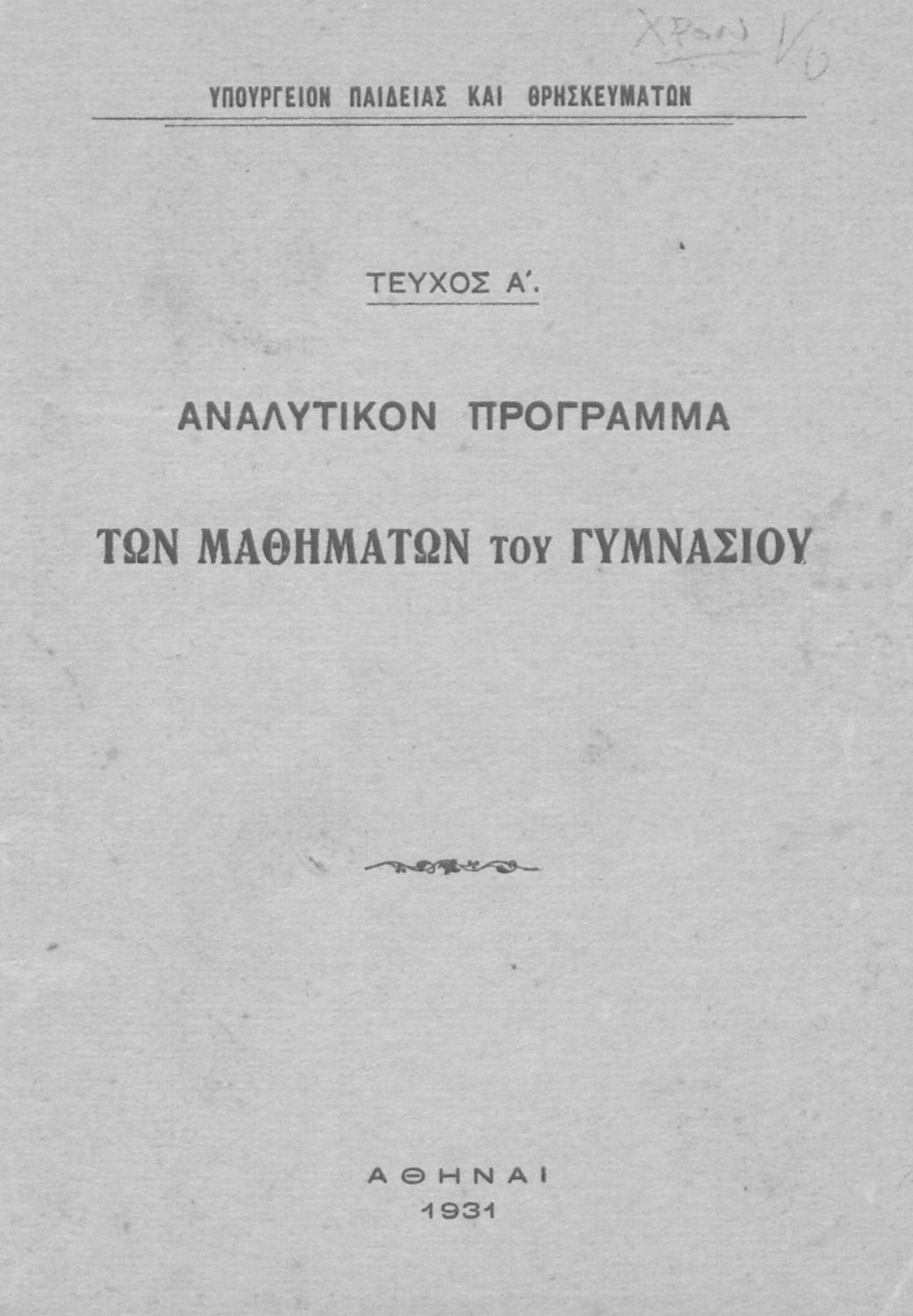 Έκδοση του Υπουργείου Παιδείας και Θρησκευμάτων που περιέχει τις κατευθυντήριες γραμμές και αποφάσεις του Υπουργείου Παιδείας για το αναλυτικό πρόγραμμα του Γυμνασίου κατά τα έτη 1931-1932.