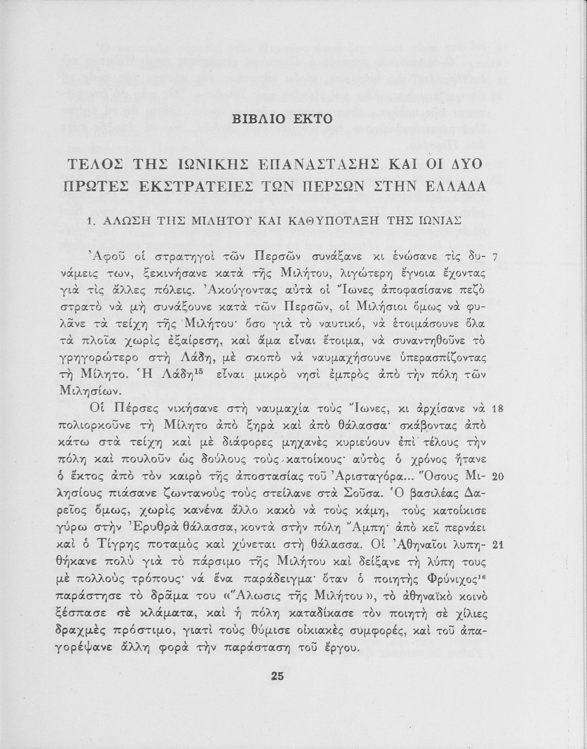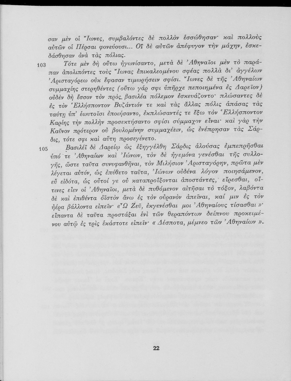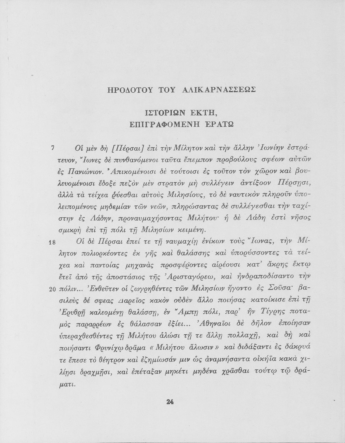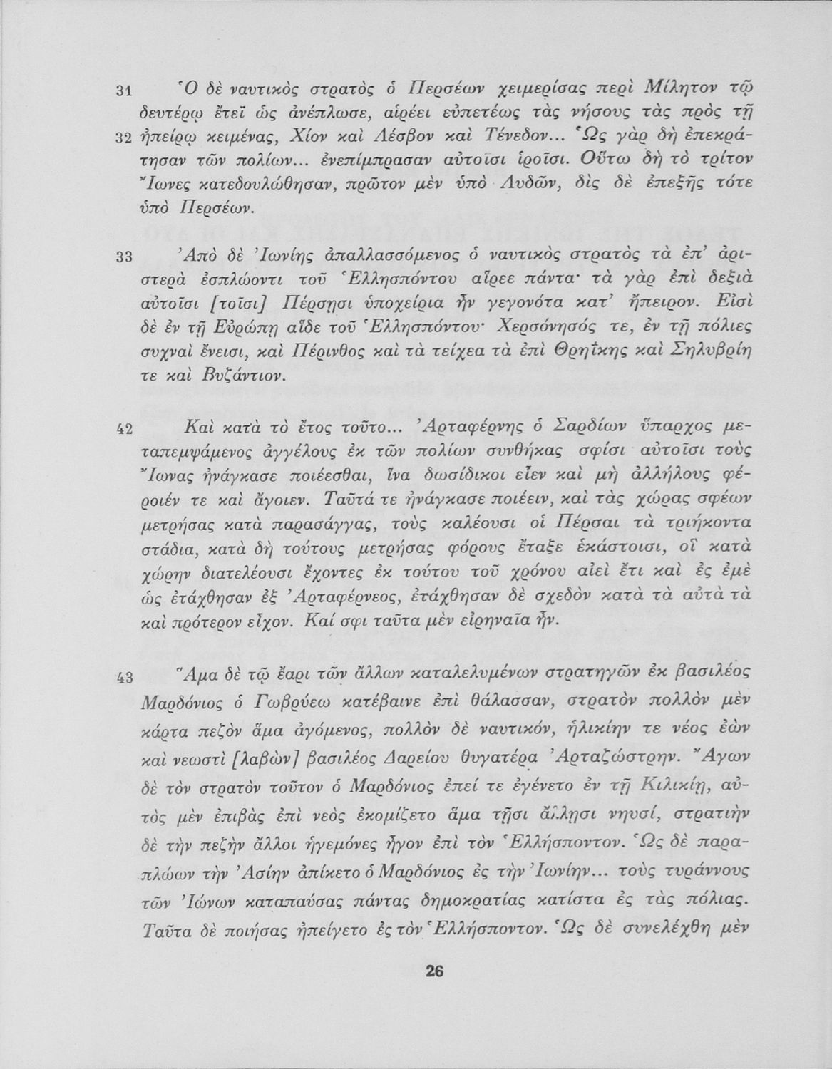 Σχολικό εγχειρίδιο Αρχαίων Ελληνικών Γυμνασίου που περιέχει αποσπάσματα από το έργο του Ηρόδοτου Περσικοί Πόλεμοι, μετάφραση, εισαγωγή στη ζωή και το έργο του, και ερμηνευτικά σχόλια. Περιλαμβάνει παράρτημα με χάρτες και σχεδιαγράμματα.