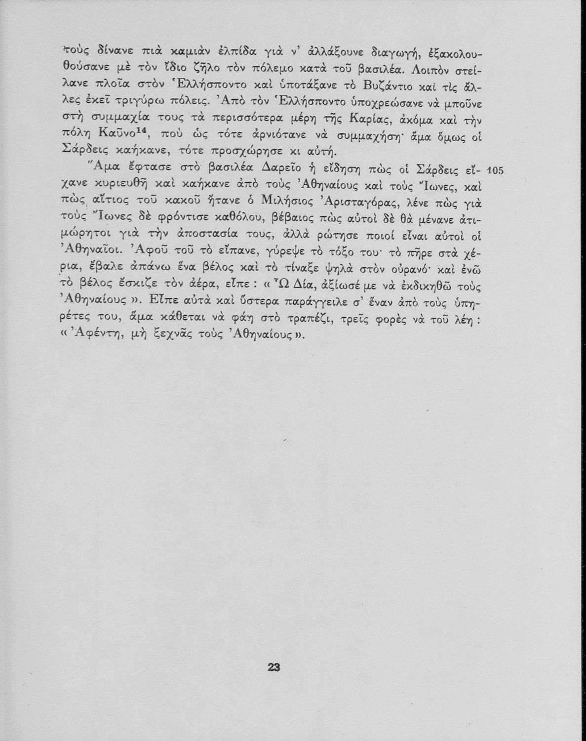 Κωδικός αναγνώρισης: 05-00063 Τίτλος: Ηροδότου Οι Περσικοί Πόλεμοι Συγγραφέας: Ηρόδοτος, Γ. Βλαχογιάννης, Κ. Κοσμάς (μετάφραση, σχόλια) Εικονογράφος: Φρόσω Παντελίδη (εξώφυλλο) Μέγεθος και υπόστρωμα: Σχολικό εγχειρίδιο, 212 σελίδες. Σχεδιαγράμματα και σκίτσα (ασπρόμαυρα), εξώφυλλο (έγχρωμο). |