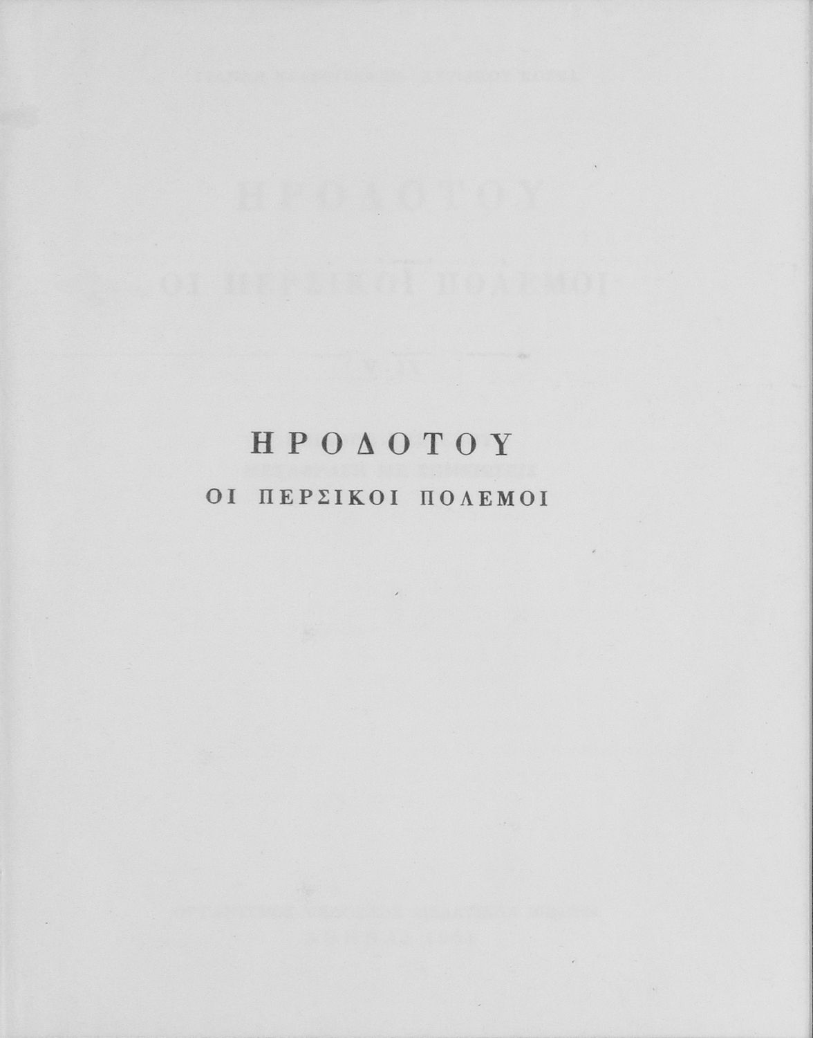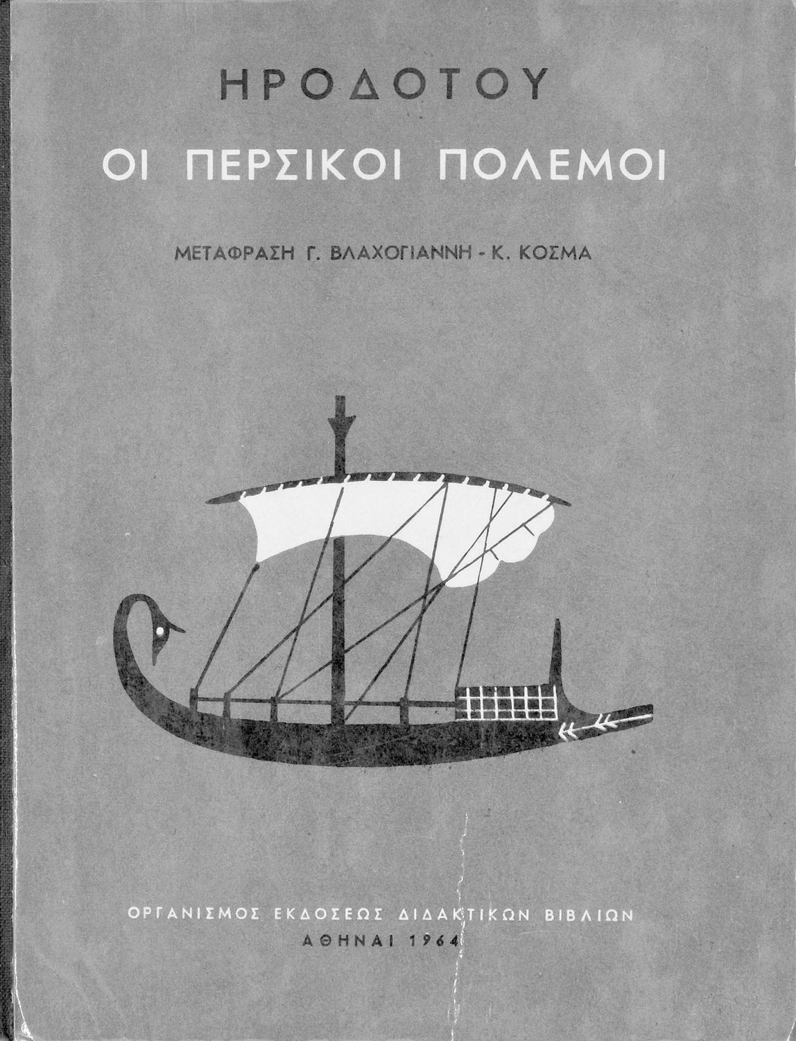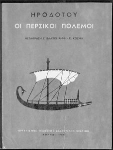 Κωδικός αναγνώρισης: 05-00063 Τίτλος: Ηροδότου Οι Περσικοί Πόλεμοι Συγγραφέας: Ηρόδοτος, Γ. Βλαχογιάννης, Κ. Κοσμάς (μετάφραση, σχόλια) Εικονογράφος: Φρόσω Παντελίδη (εξώφυλλο) Μέγεθος και υπόστρωμα: Σχολικό εγχειρίδιο, 212 σελίδες. Σχεδιαγράμματα και σκίτσα (ασπρόμαυρα), εξώφυλλο (έγχρωμο). |