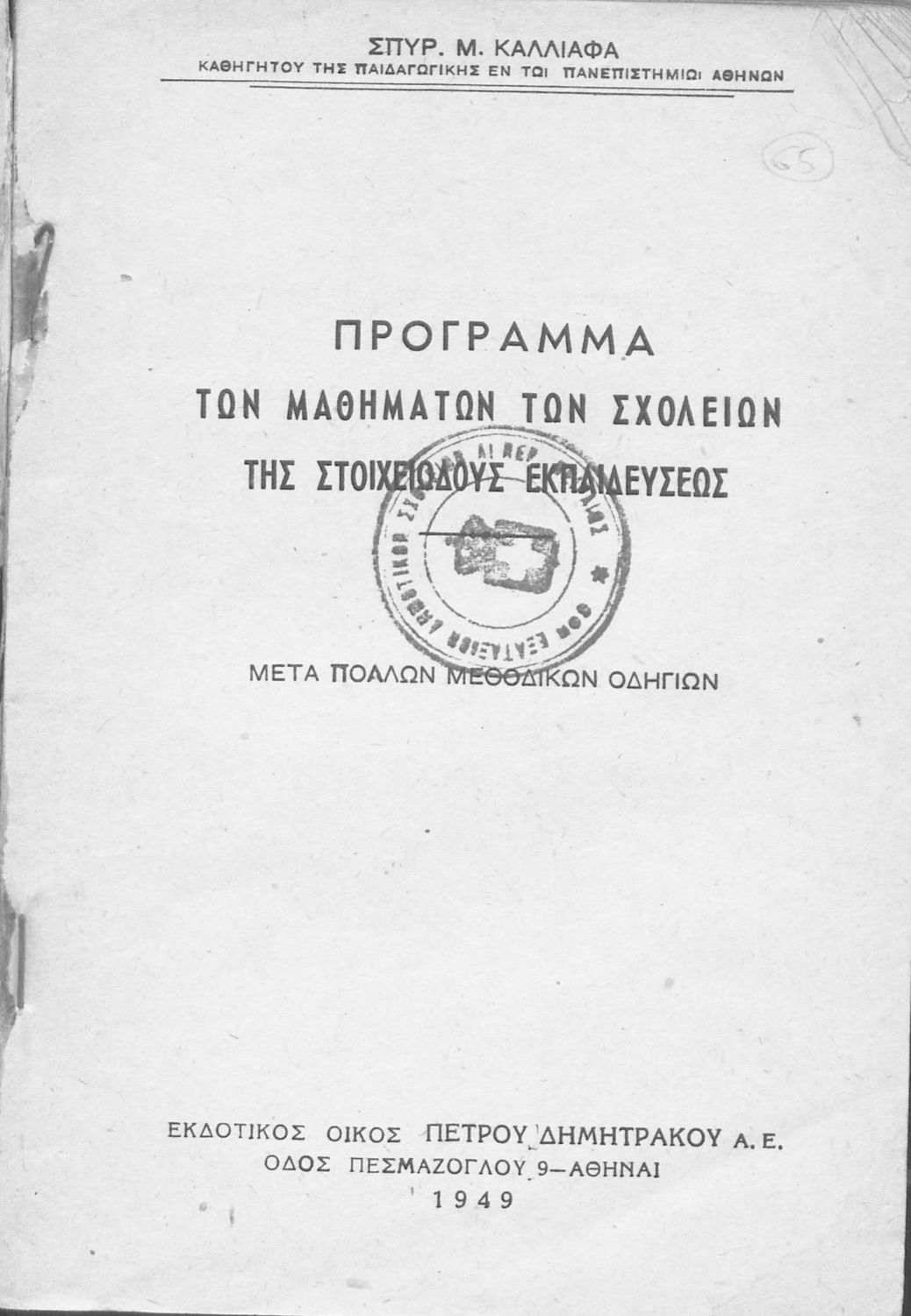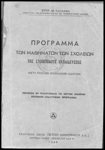 Κωδικός αναγνώρισης: 05-00065 Τίτλος: Πρόγραμμα των μαθημάτων των σχολείων της Στοιχειώδους Εκπαιδεύσεως Συγγραφέας: Σπύρος Μ. Καλλιάφας Μέγεθος και υπόστρωμα: Παιδαγωγικό βοήθημα, 160 σελίδες. |