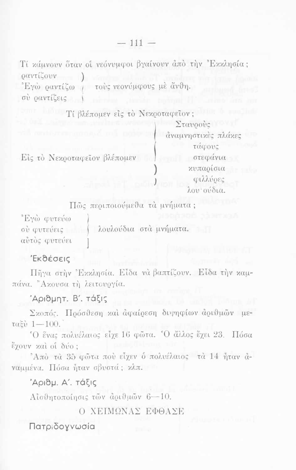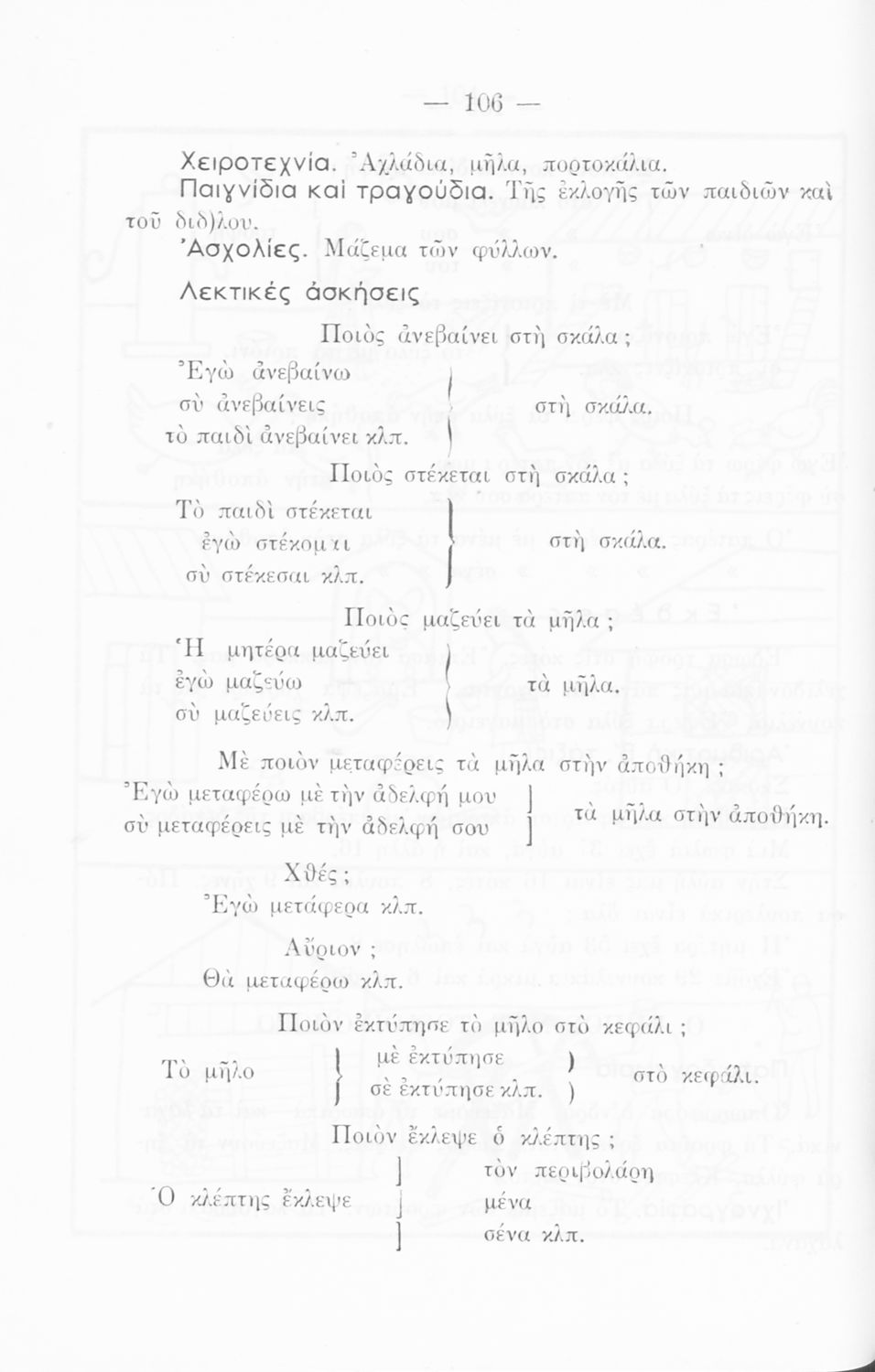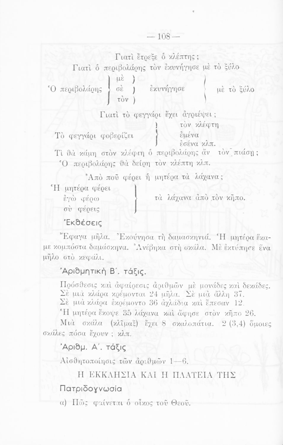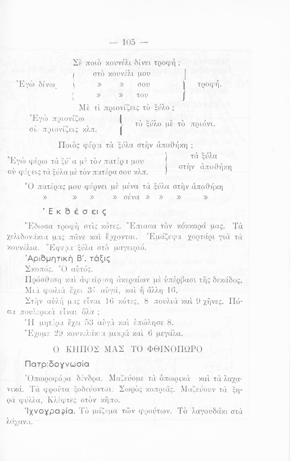 Παιδαγωγικό βοήθημα που εμφορείται από τις αρχές της Νέας Αγωγής και απευθύνεται στους δασκάλους των Μονοταξίων Δημοτικών. Αποσκοπεί στην παροχή θεωρητικών κατευθύνσεων και πρακτικών οδηγιών για τη διδασκαλία της Γλώσσας και της Πατριδογνωσίας σε μονοτάξια σχολεία και συνδιδασκόμενες τάξεις.