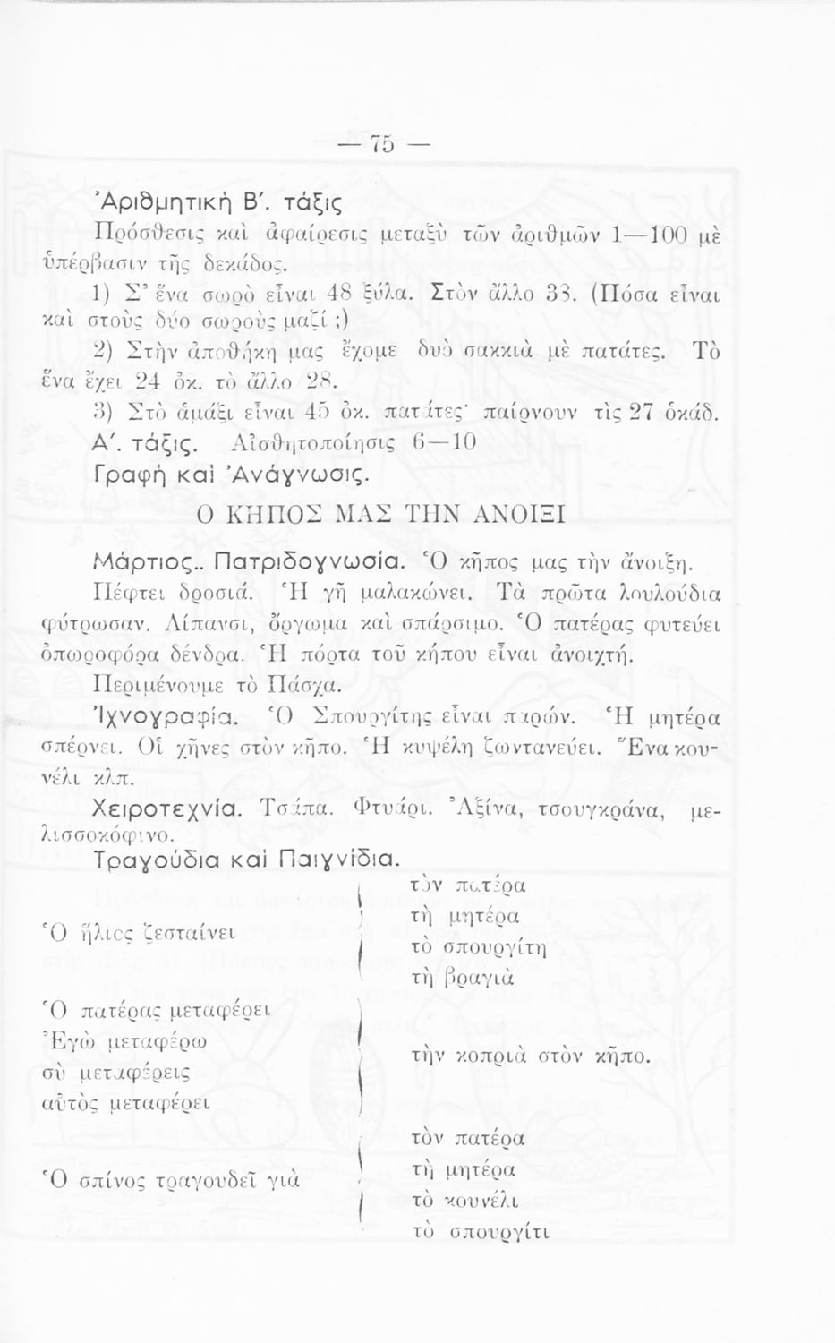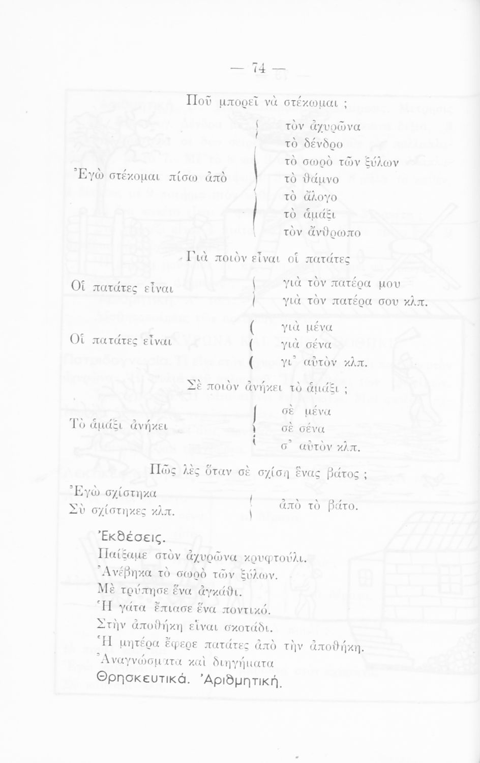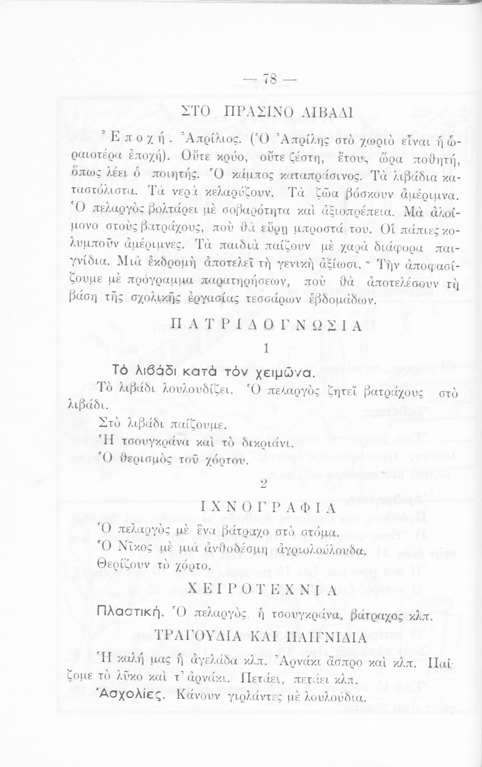 Παιδαγωγικό βοήθημα που εμφορείται από τις αρχές της Νέας Αγωγής και απευθύνεται στους δασκάλους των Μονοταξίων Δημοτικών. Αποσκοπεί στην παροχή θεωρητικών κατευθύνσεων και πρακτικών οδηγιών για τη διδασκαλία της Γλώσσας και της Πατριδογνωσίας σε μονοτάξια σχολεία και συνδιδασκόμενες τάξεις.