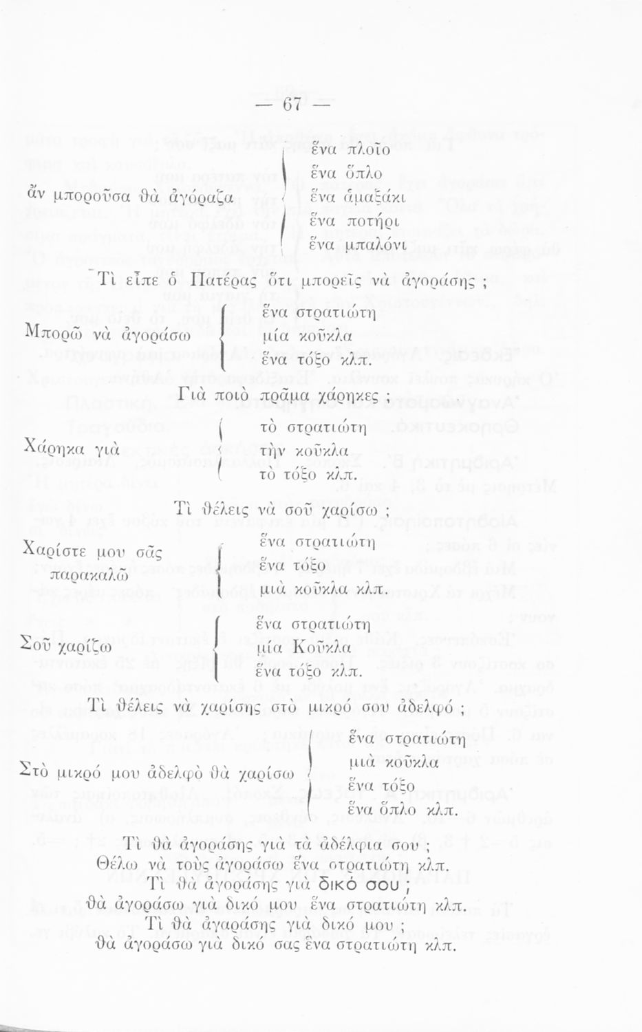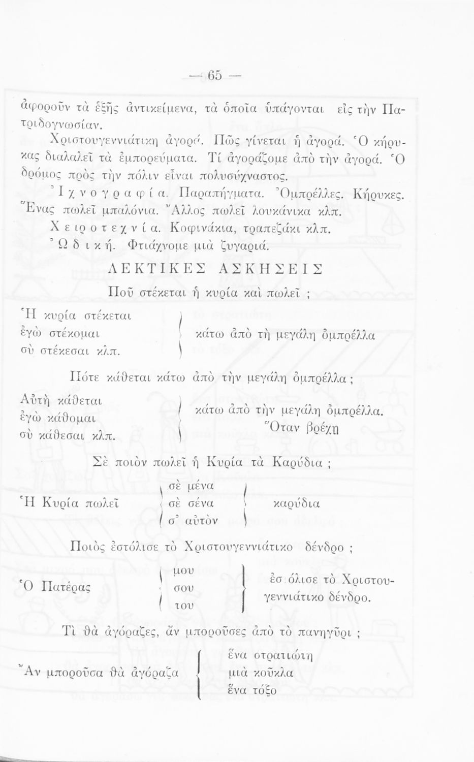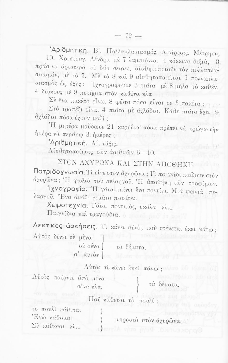 Βαθμίδα εκπαίδευσης: Πρωτοβάθμια Τάξη: Α' Δημοτικού / Β' Δημοτικού Γλώσσα: Απλή καθαρεύουσα Παρουσίαση περιεχομένου: Παιδαγωγικό βοήθημα που εμφορείται από τις αρχές της Νέας Αγωγής και απευθύνεται στους δασκάλους των Μονοταξίων Δημοτικών. Αποσκοπεί στην παροχή θεωρητικών κατευθύνσεων και πρακτικών οδηγιών για τη διδασκαλία της Γλώσσας και της Πατριδογνωσίας σε μονοτάξια σχολεία και συνδιδασκόμενες τάξεις. |