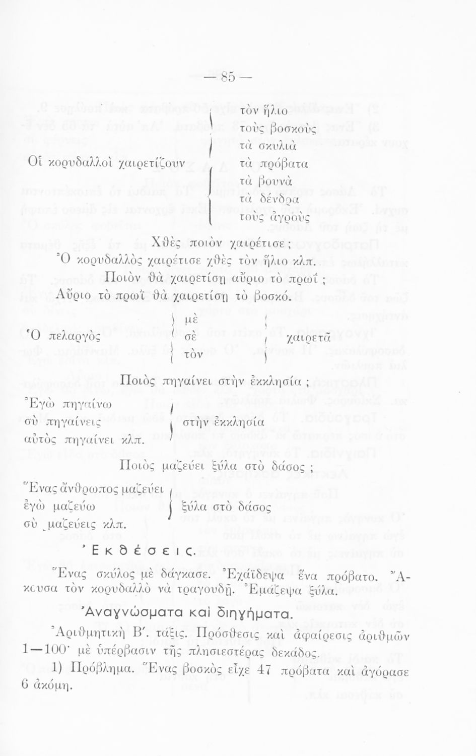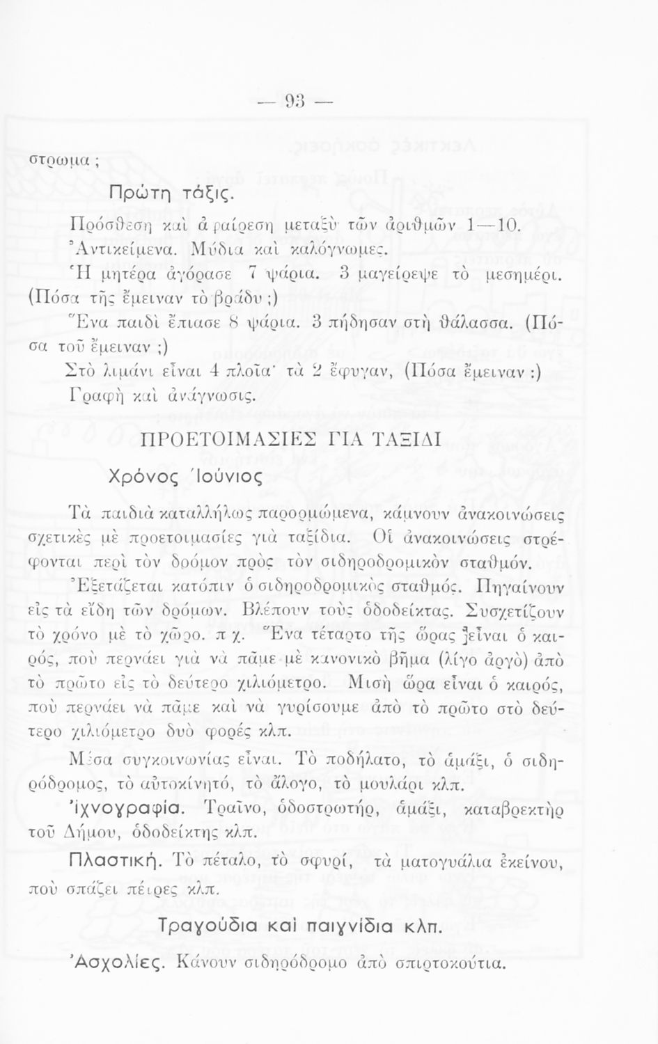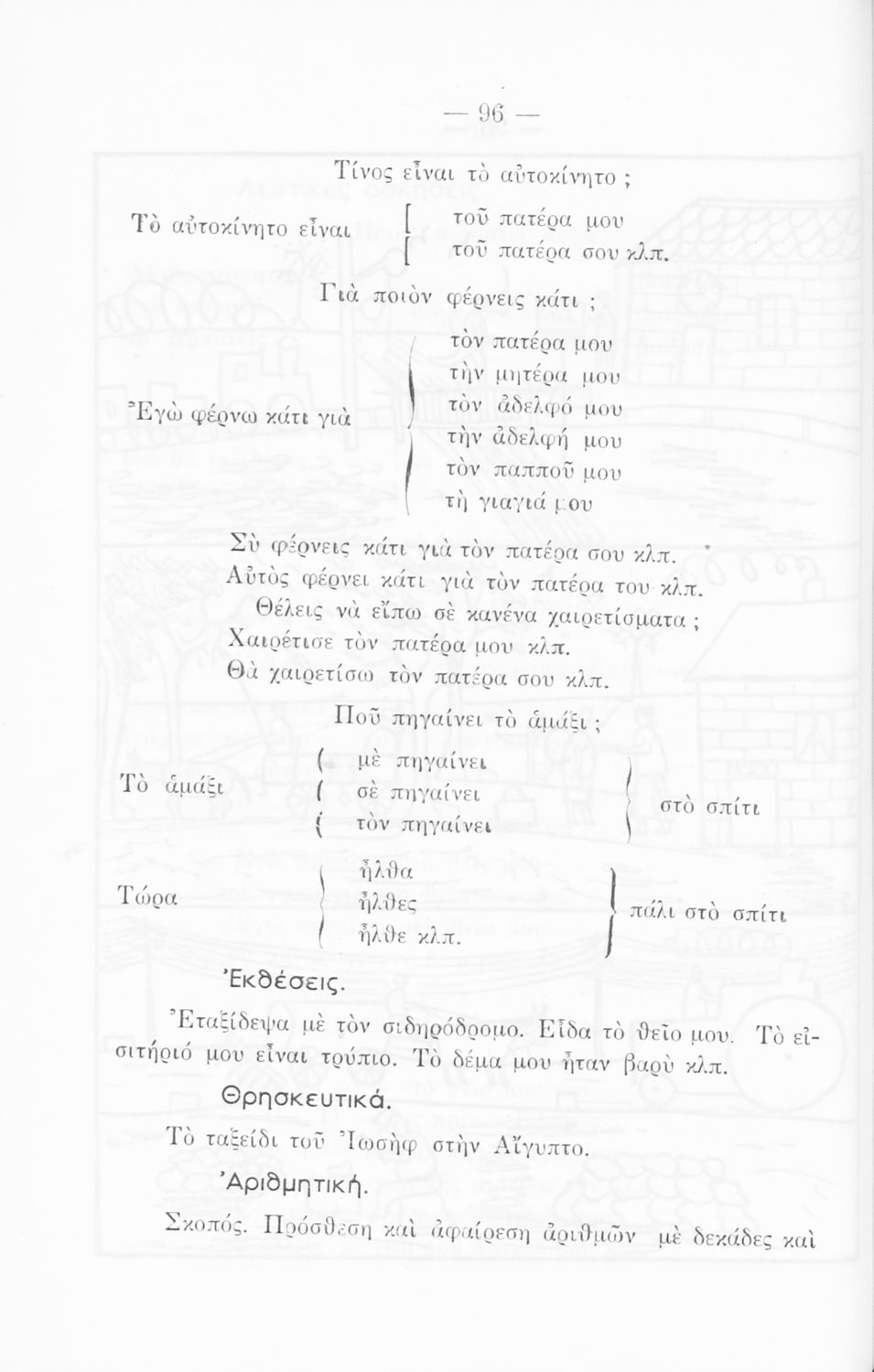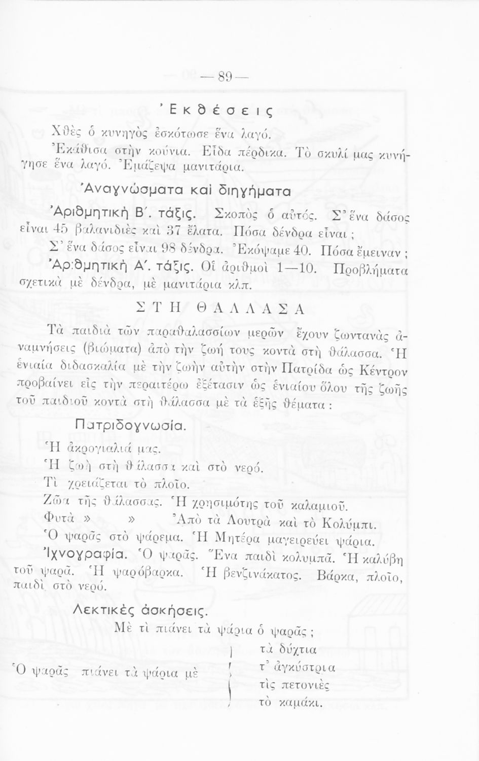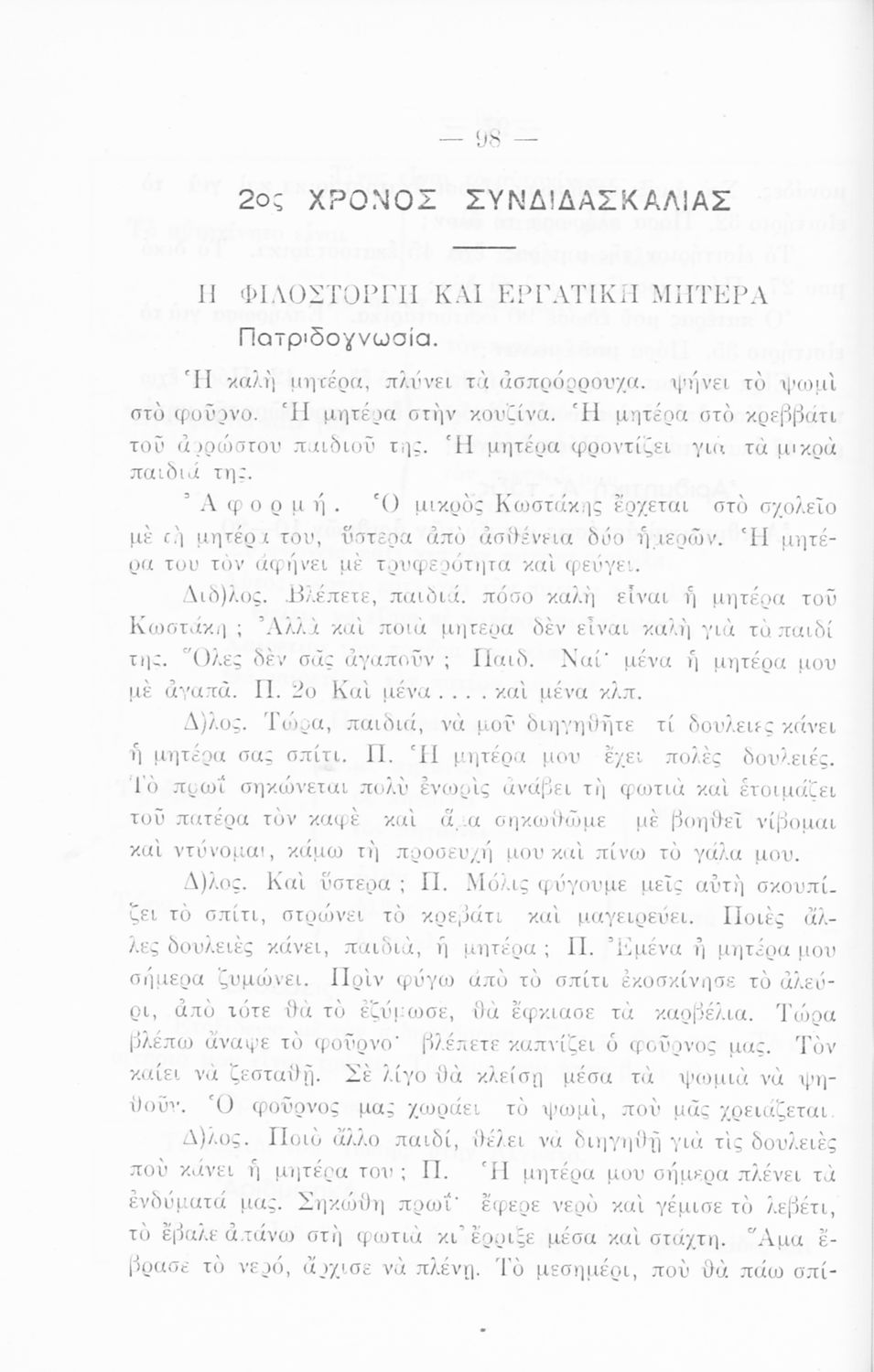 Παιδαγωγικό βοήθημα που εμφορείται από τις αρχές της Νέας Αγωγής και απευθύνεται στους δασκάλους των Μονοταξίων Δημοτικών. Αποσκοπεί στην παροχή θεωρητικών κατευθύνσεων και πρακτικών οδηγιών για τη διδασκαλία της Γλώσσας και της Πατριδογνωσίας σε μονοτάξια σχολεία και συνδιδασκόμενες τάξεις.