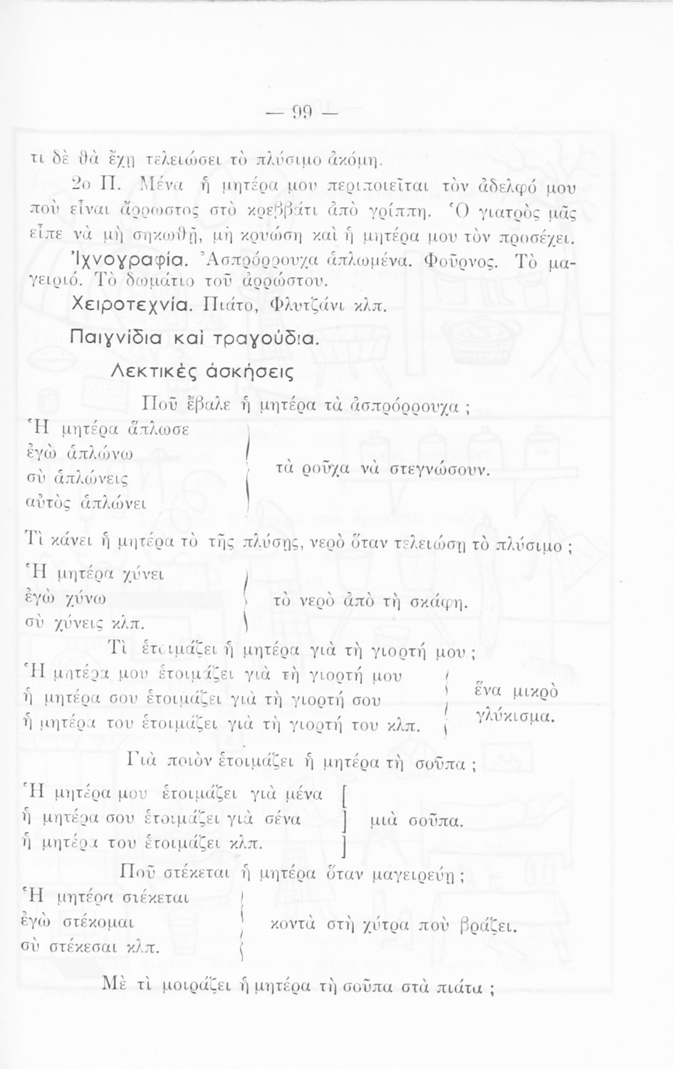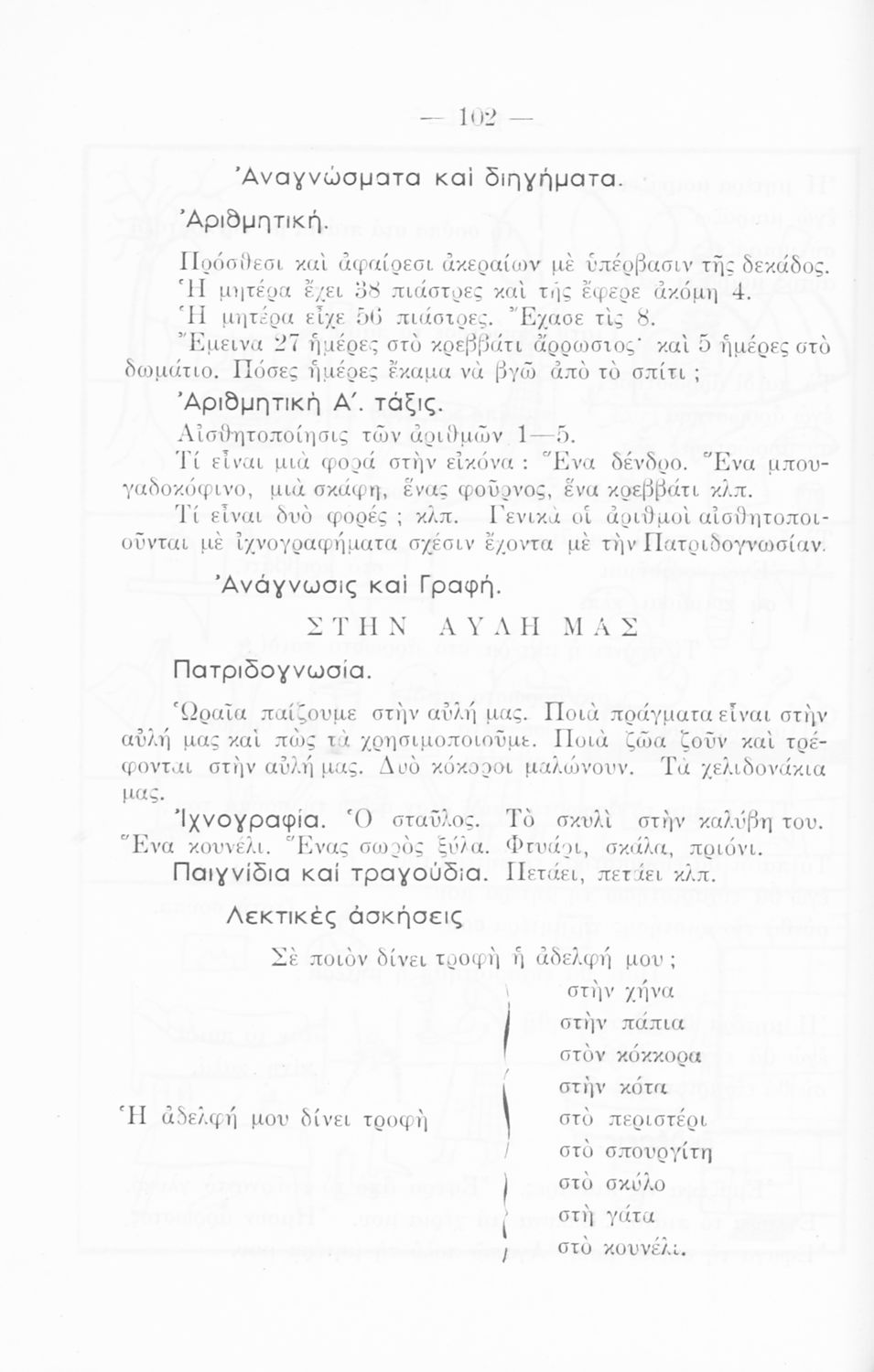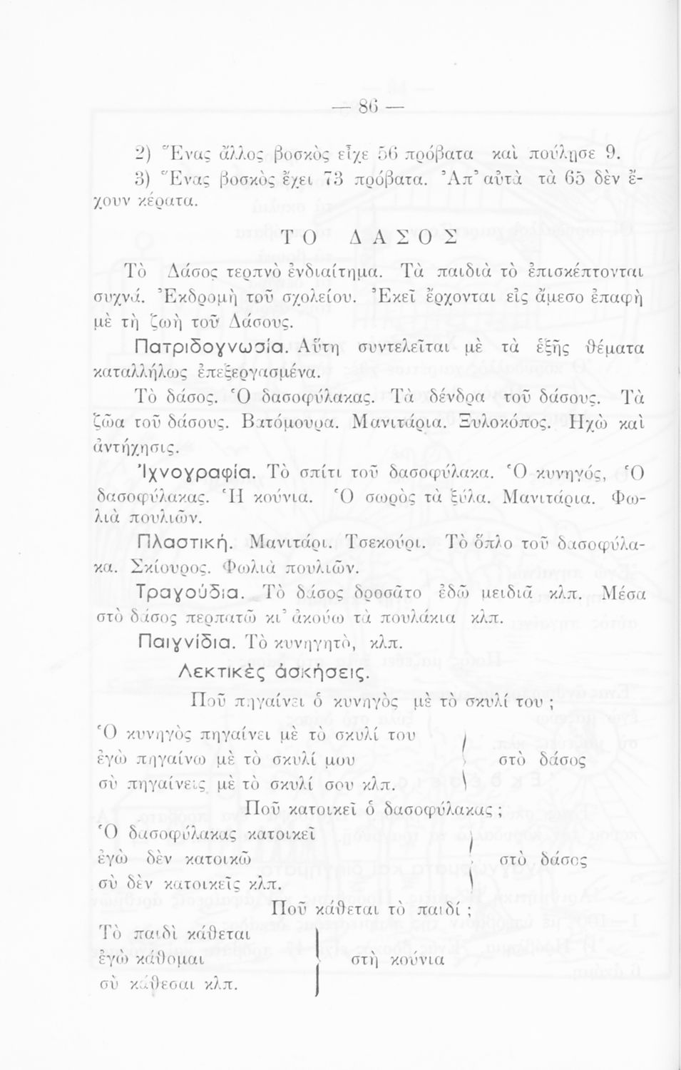 Βαθμίδα εκπαίδευσης: Πρωτοβάθμια Τάξη: Α' Δημοτικού / Β' Δημοτικού Γλώσσα: Απλή καθαρεύουσα Παρουσίαση περιεχομένου: Παιδαγωγικό βοήθημα που εμφορείται από τις αρχές της Νέας Αγωγής και απευθύνεται στους δασκάλους των Μονοταξίων Δημοτικών. Αποσκοπεί στην παροχή θεωρητικών κατευθύνσεων και πρακτικών οδηγιών για τη διδασκαλία της Γλώσσας και της Πατριδογνωσίας σε μονοτάξια σχολεία και συνδιδασκόμενες τάξεις. |