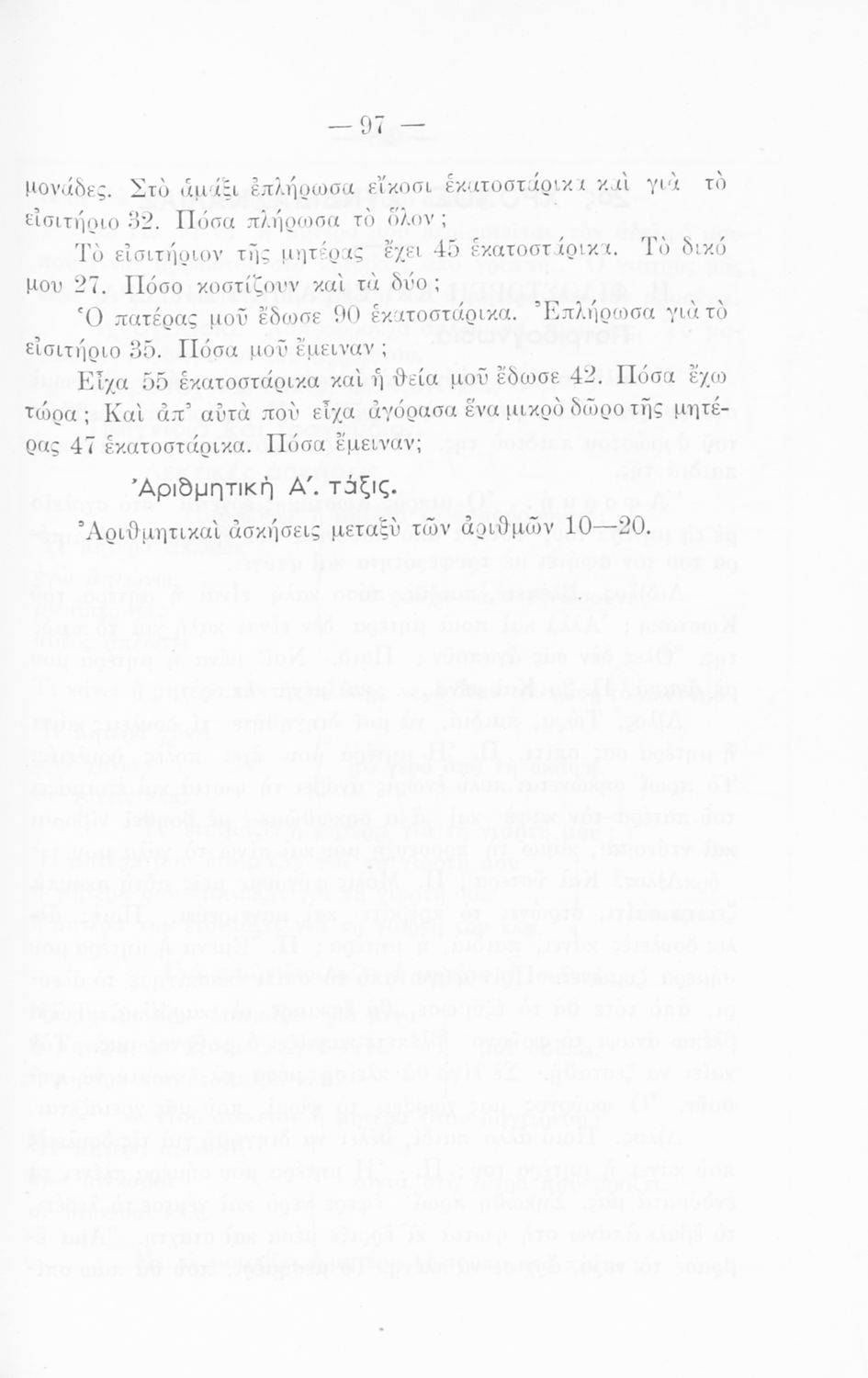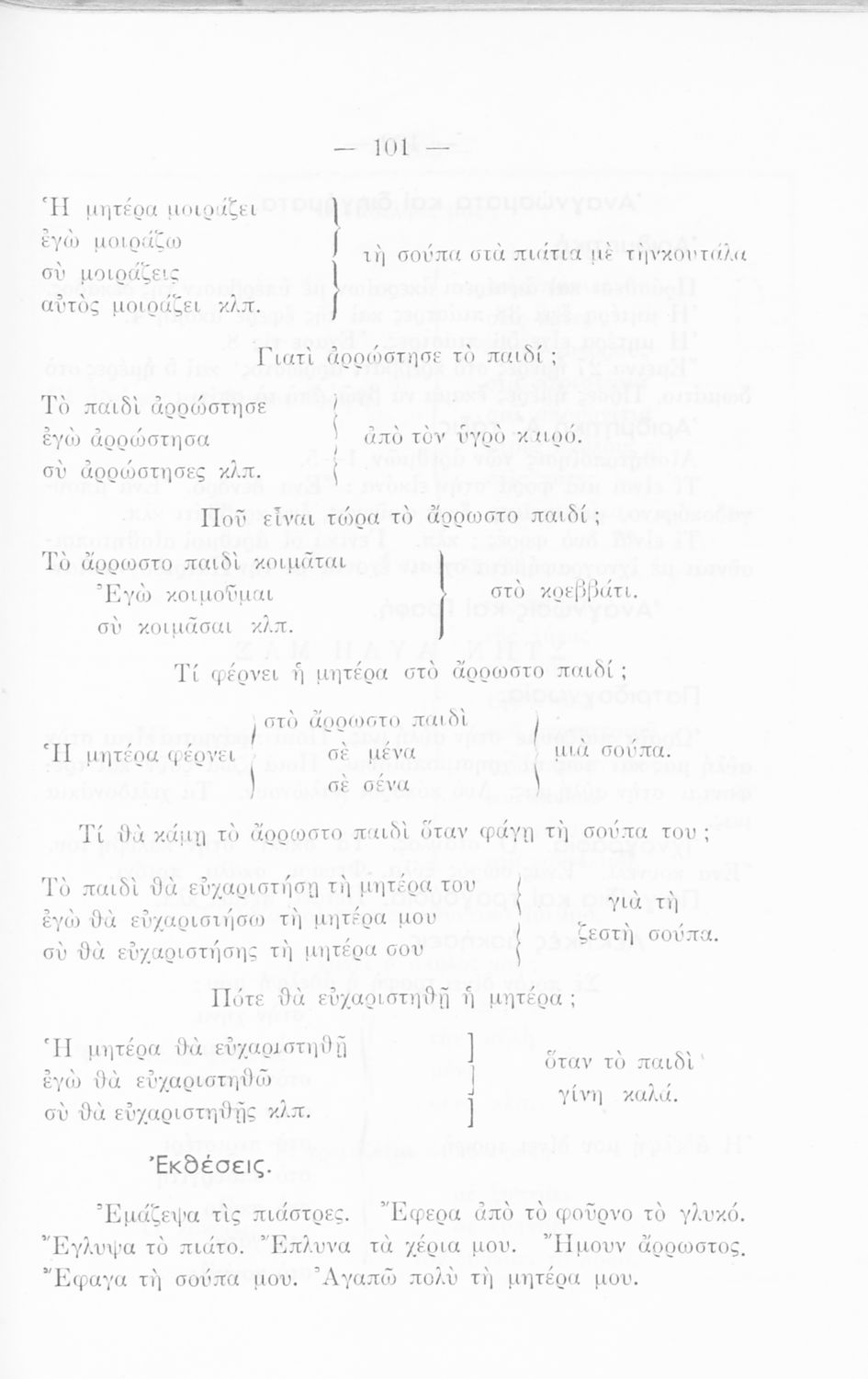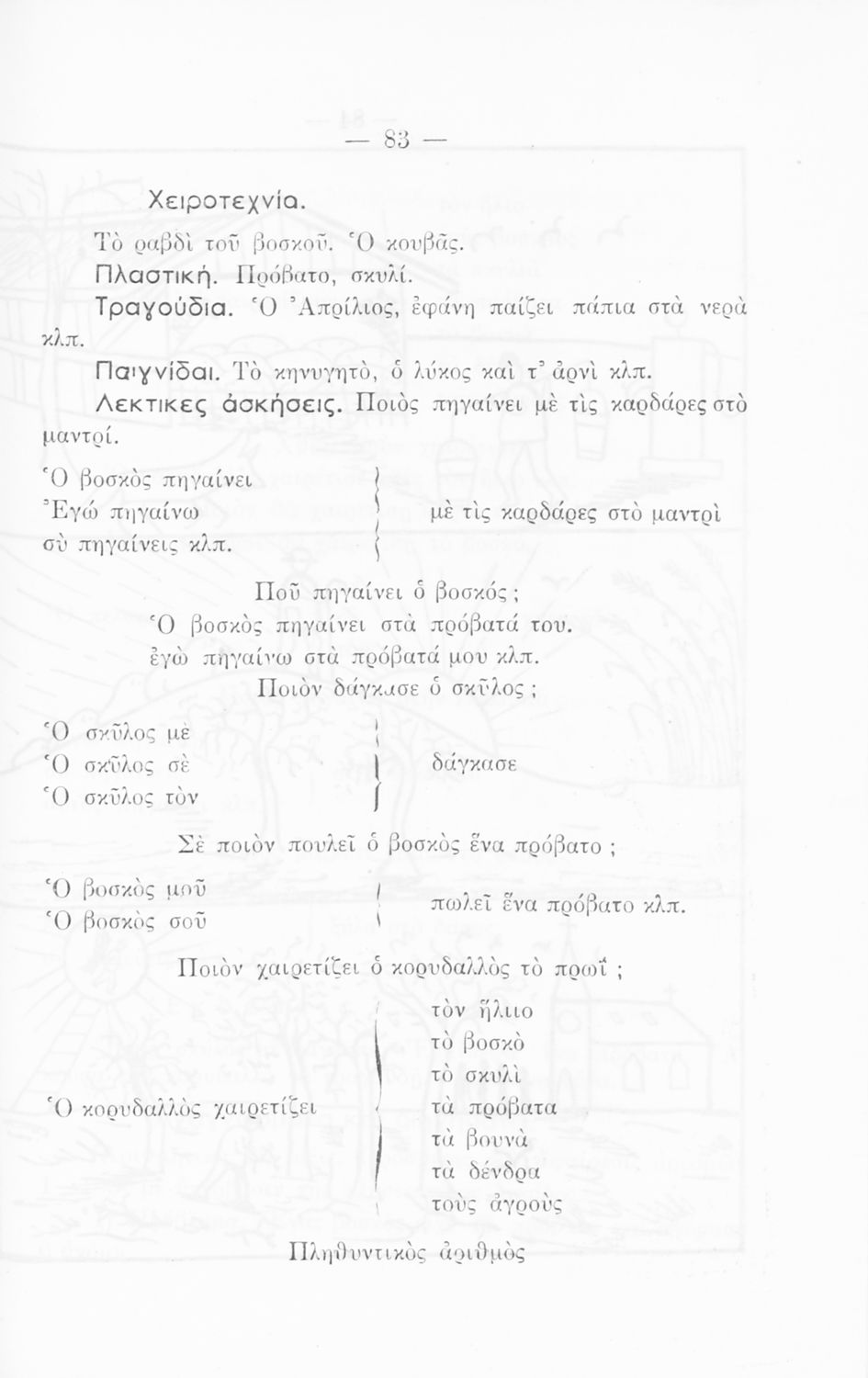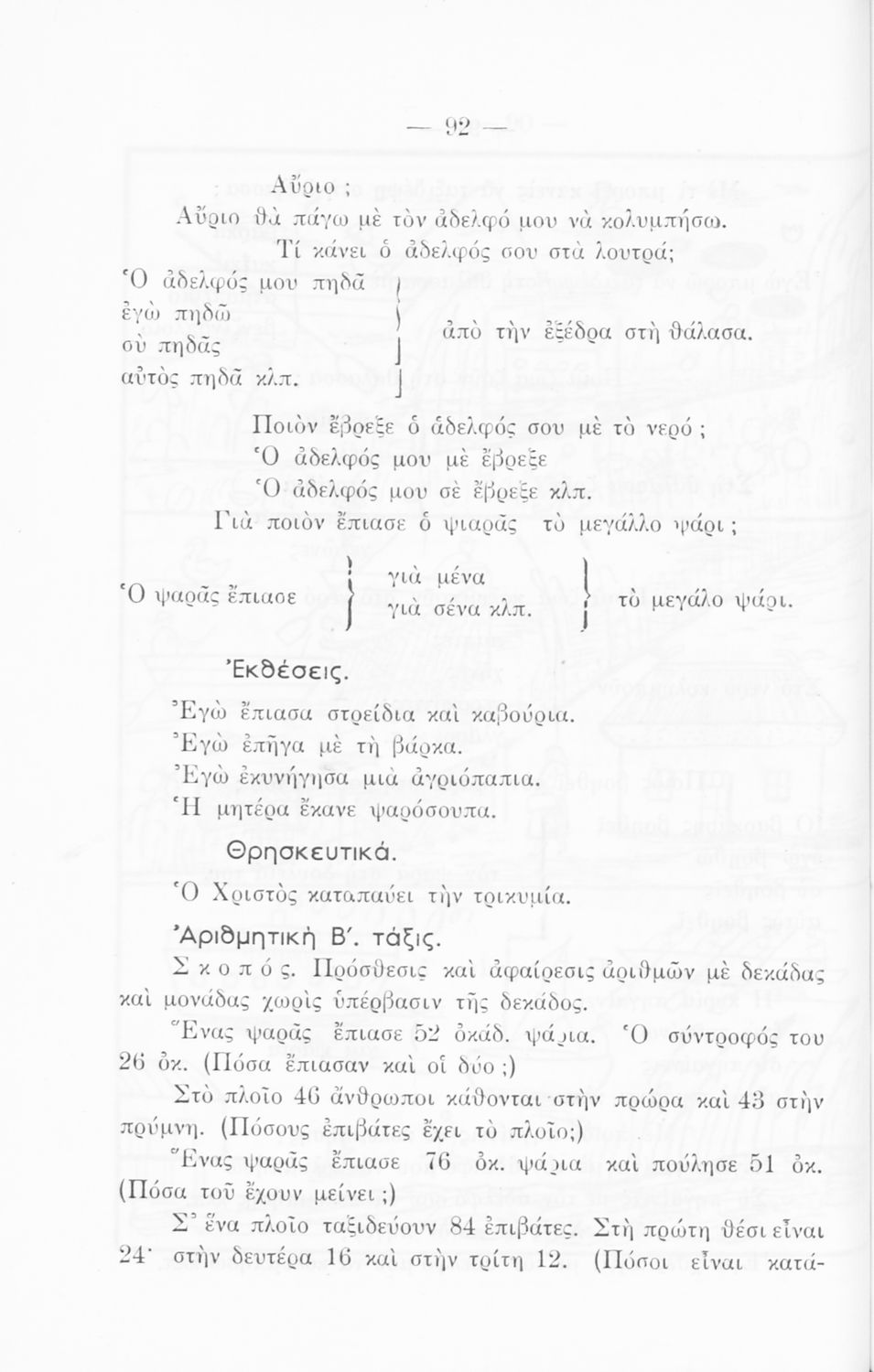 Βαθμίδα εκπαίδευσης: Πρωτοβάθμια Τάξη: Α' Δημοτικού / Β' Δημοτικού Γλώσσα: Απλή καθαρεύουσα Παρουσίαση περιεχομένου: Παιδαγωγικό βοήθημα που εμφορείται από τις αρχές της Νέας Αγωγής και απευθύνεται στους δασκάλους των Μονοταξίων Δημοτικών. Αποσκοπεί στην παροχή θεωρητικών κατευθύνσεων και πρακτικών οδηγιών για τη διδασκαλία της Γλώσσας και της Πατριδογνωσίας σε μονοτάξια σχολεία και συνδιδασκόμενες τάξεις. |