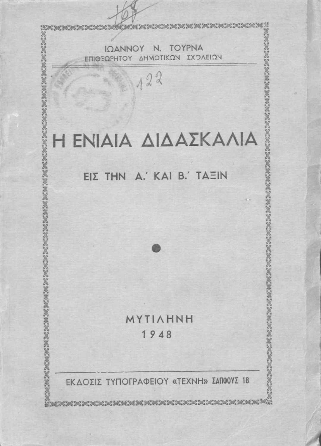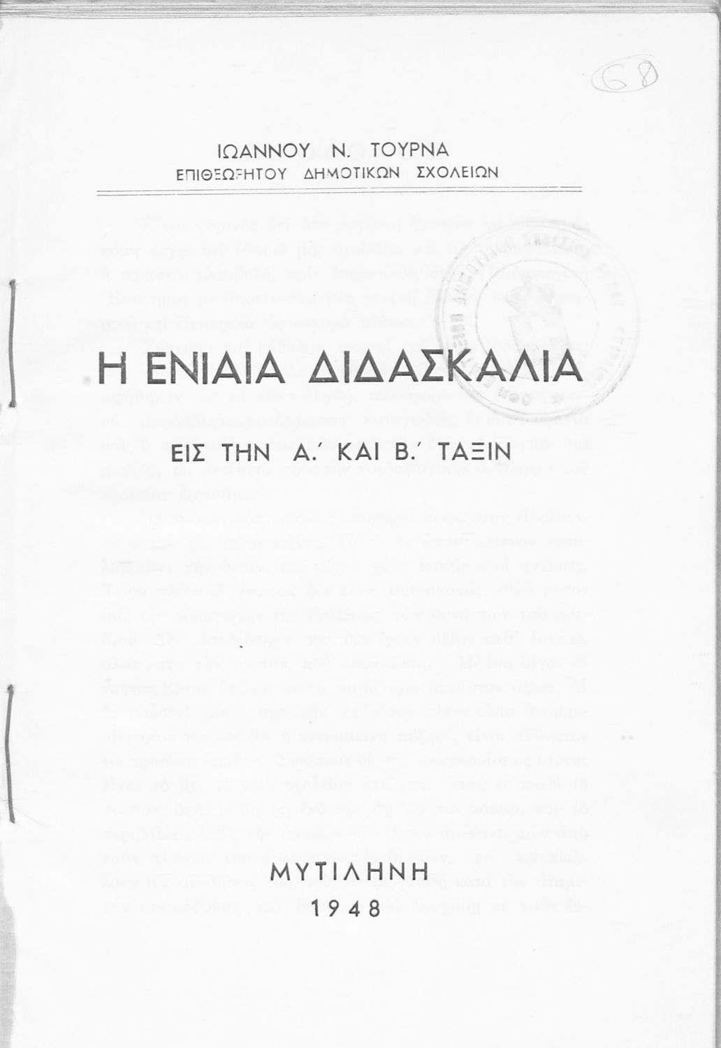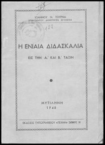 Κωδικός αναγνώρισης: 05-00068 Τίτλος: Η ενιαία διδασκαλία εις την Α΄ και Β΄ τάξιν Συγγραφέας: Ιωάννης Ν. Τουρνάς Μέγεθος και υπόστρωμα: Παιδαγωγικό βοήθημα, 144 σελίδες. Σκίτσα (ασπρόμαυρα). |