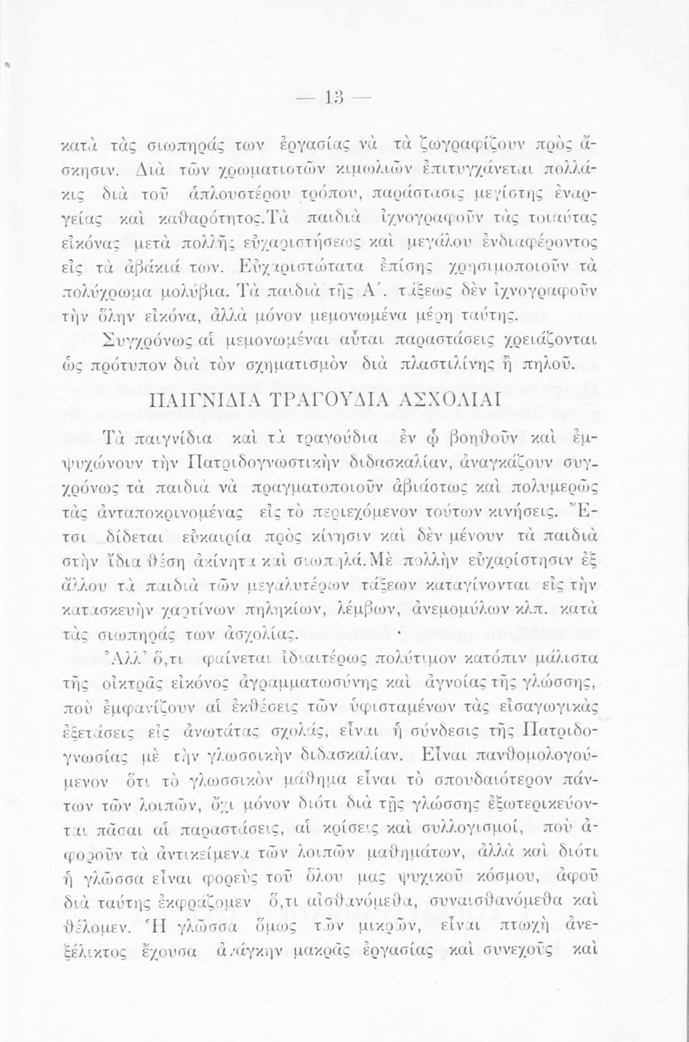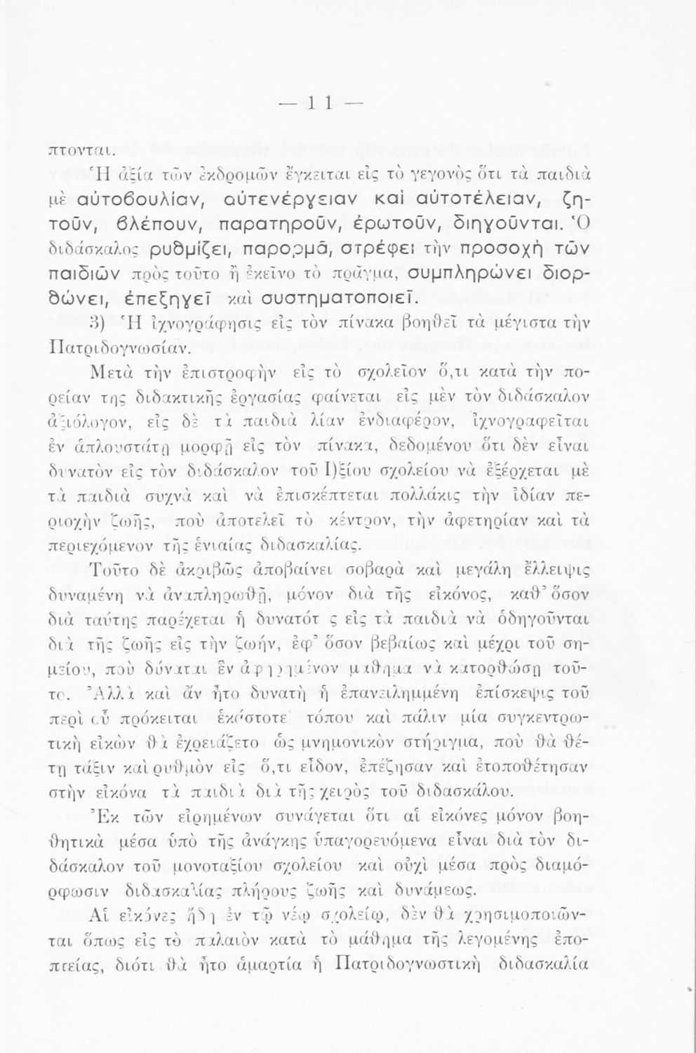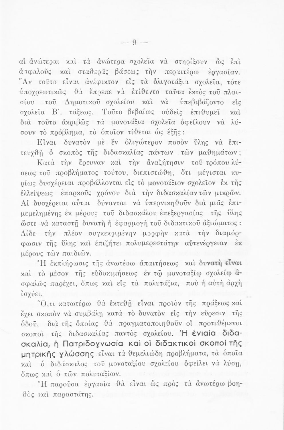 Παιδαγωγικό βοήθημα που εμφορείται από τις αρχές της Νέας Αγωγής και απευθύνεται στους δασκάλους των Μονοταξίων Δημοτικών. Αποσκοπεί στην παροχή θεωρητικών κατευθύνσεων και πρακτικών οδηγιών για τη διδασκαλία της Γλώσσας και της Πατριδογνωσίας σε μονοτάξια σχολεία και συνδιδασκόμενες τάξεις.