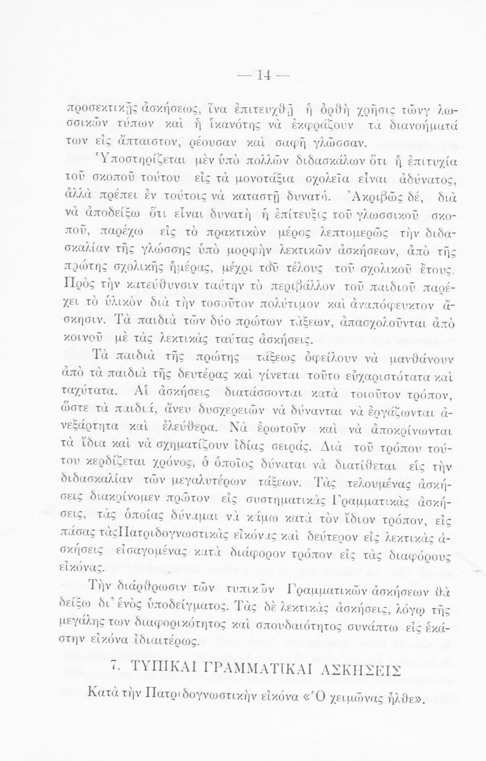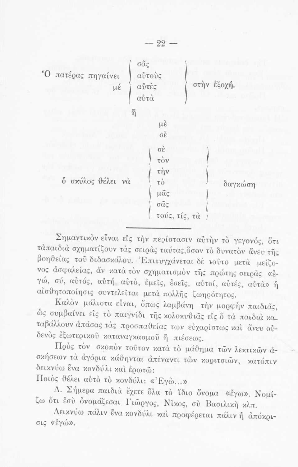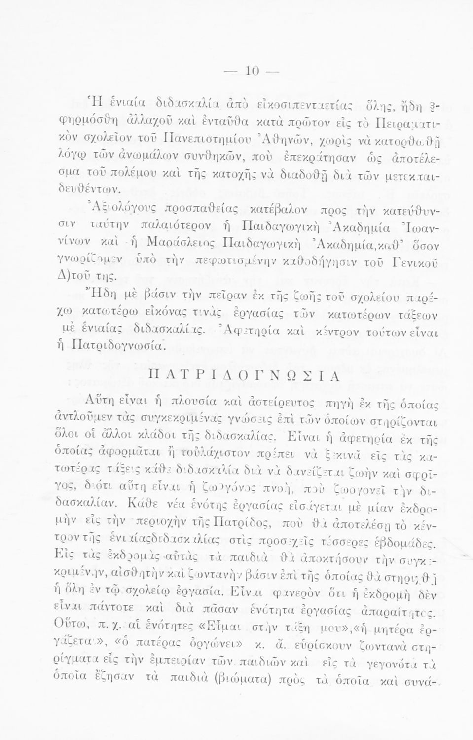 Παιδαγωγικό βοήθημα που εμφορείται από τις αρχές της Νέας Αγωγής και απευθύνεται στους δασκάλους των Μονοταξίων Δημοτικών. Αποσκοπεί στην παροχή θεωρητικών κατευθύνσεων και πρακτικών οδηγιών για τη διδασκαλία της Γλώσσας και της Πατριδογνωσίας σε μονοτάξια σχολεία και συνδιδασκόμενες τάξεις.