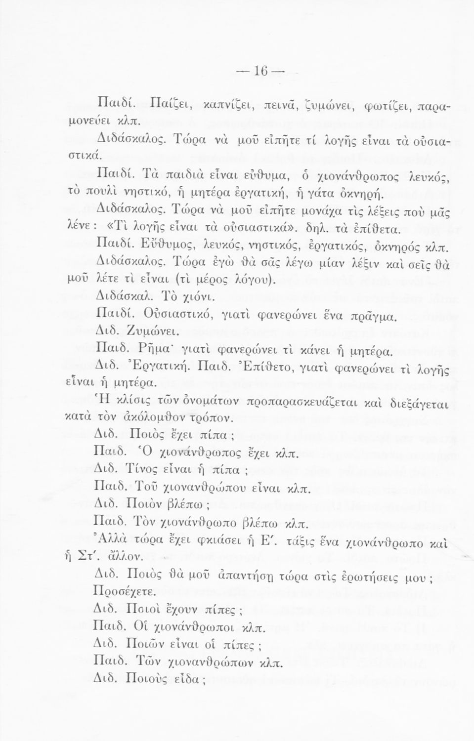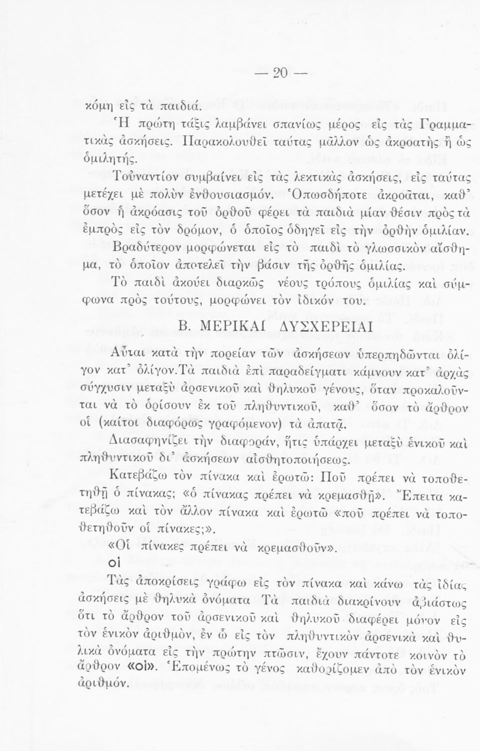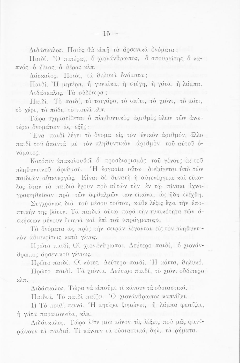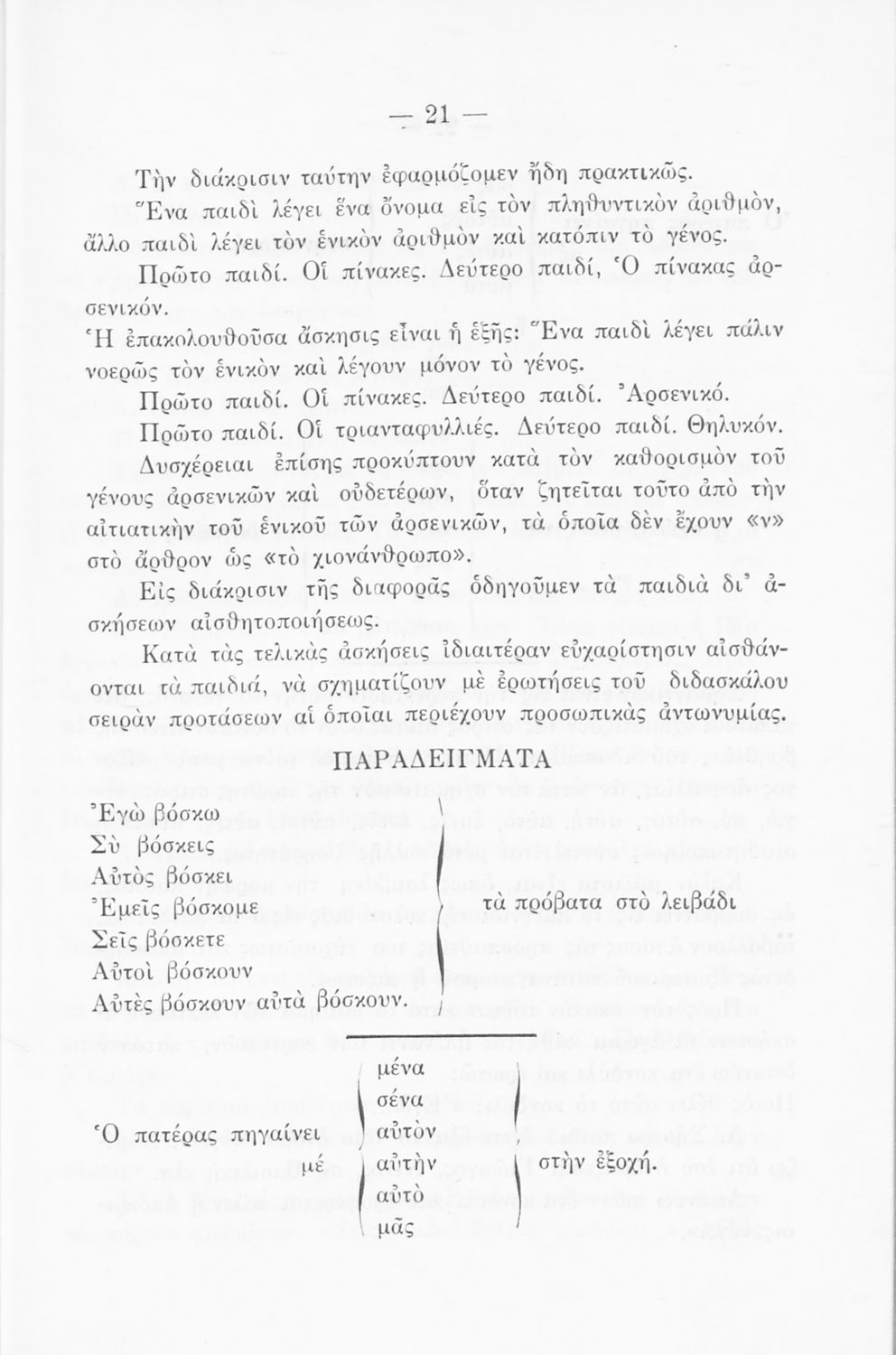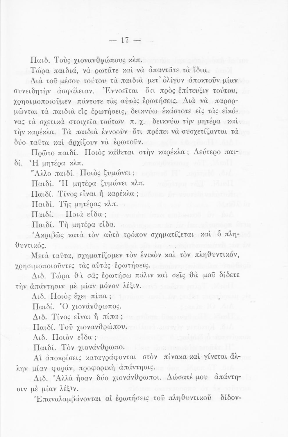 Βαθμίδα εκπαίδευσης: Πρωτοβάθμια Τάξη: Α' Δημοτικού / Β' Δημοτικού Γλώσσα: Απλή καθαρεύουσα Παρουσίαση περιεχομένου: Παιδαγωγικό βοήθημα που εμφορείται από τις αρχές της Νέας Αγωγής και απευθύνεται στους δασκάλους των Μονοταξίων Δημοτικών. Αποσκοπεί στην παροχή θεωρητικών κατευθύνσεων και πρακτικών οδηγιών για τη διδασκαλία της Γλώσσας και της Πατριδογνωσίας σε μονοτάξια σχολεία και συνδιδασκόμενες τάξεις. |