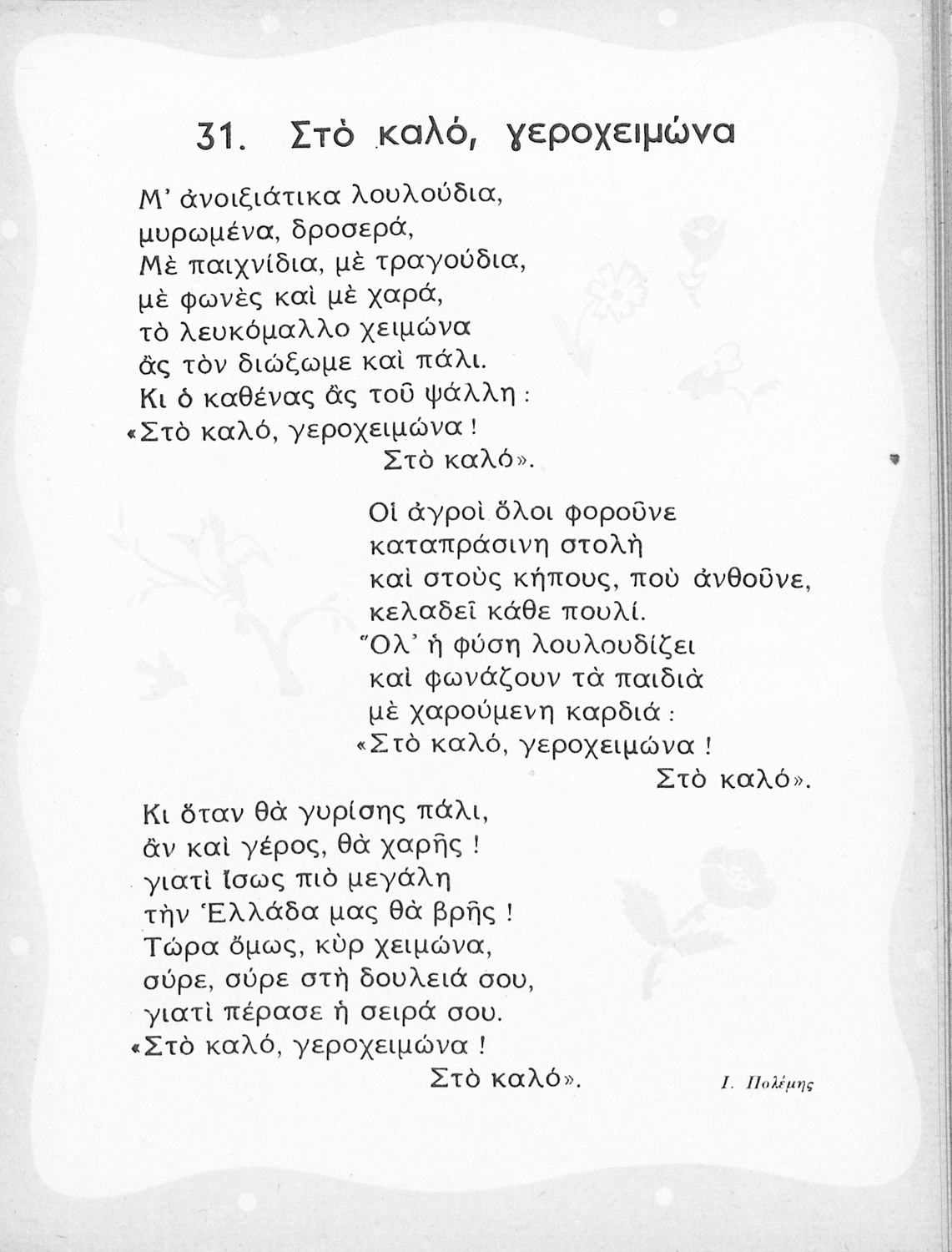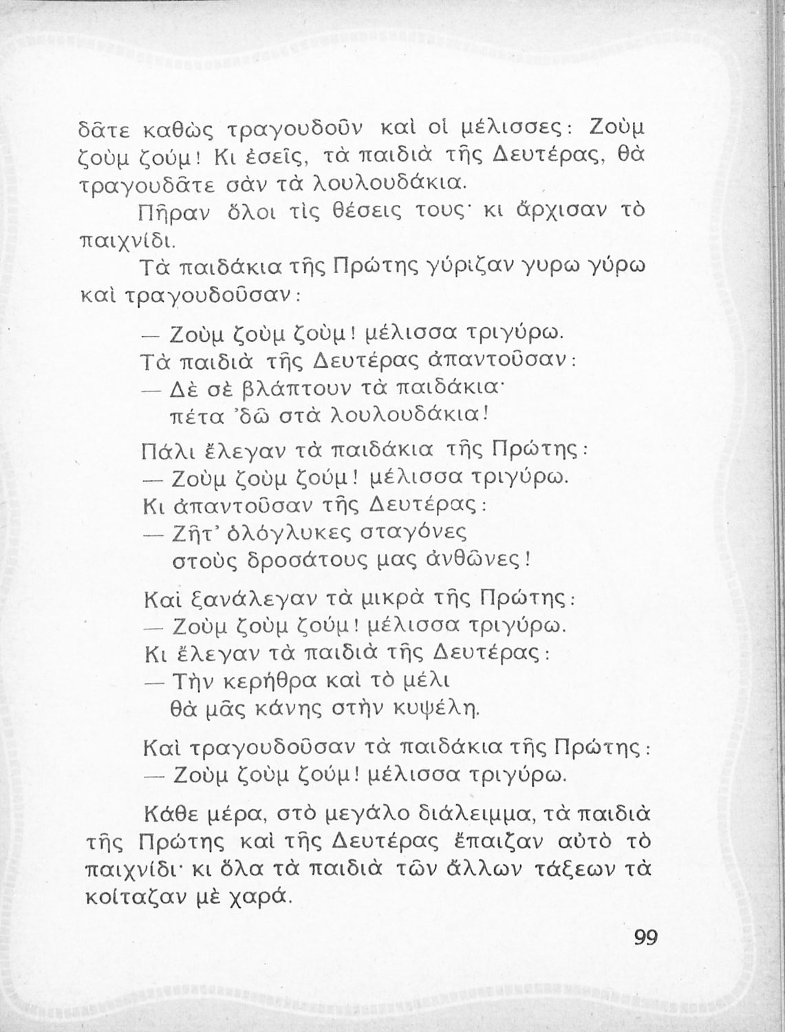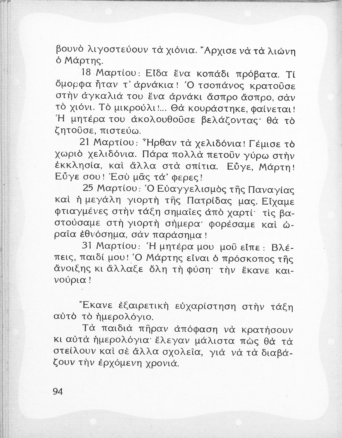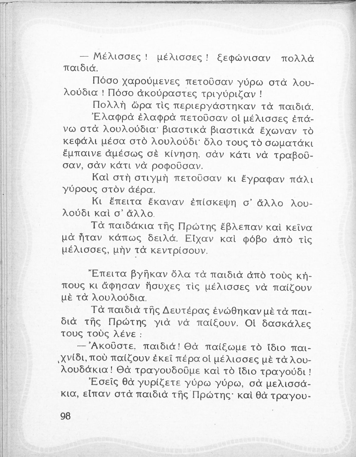 Αναγνωστικό Β' Δημοτικού που περιλαμβάνει ποιήματα και πεζά εμπνευσμένα από την καθημερινή ζωή, την ελληνική μυθολογία, την ελληνική φύση και τη θρησκευτική παράδοση.