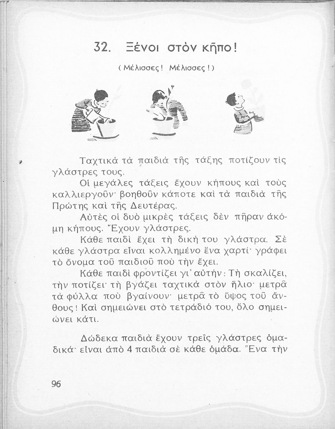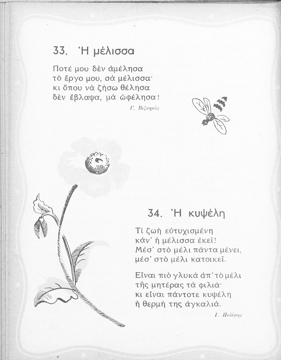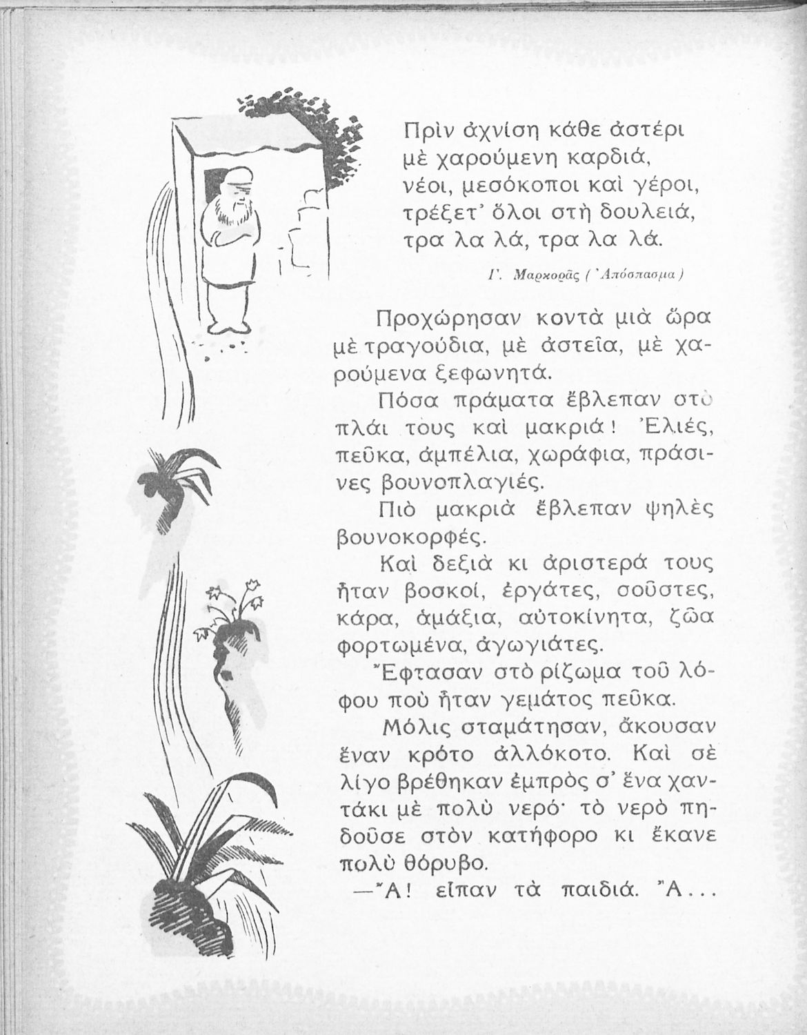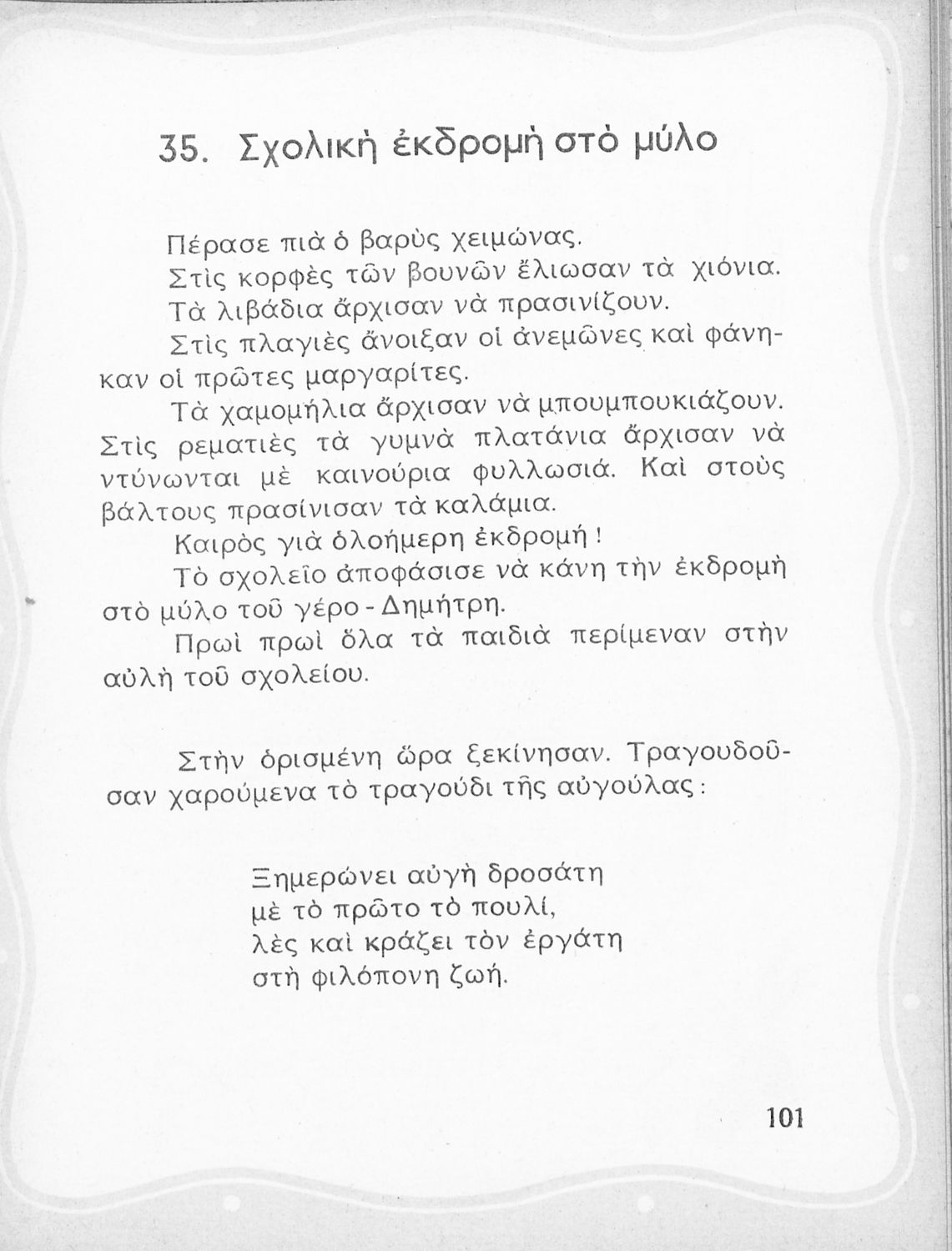 Αναγνωστικό για τη Β΄ Δημοτικού που περιέχει ποιήματα και πεζά που αντλούν τα θέματά τους από τη φύση και την παράδοση της Ελλάδας και την κοινωνική και επαγγελματική ζωή των κατοίκων της.
