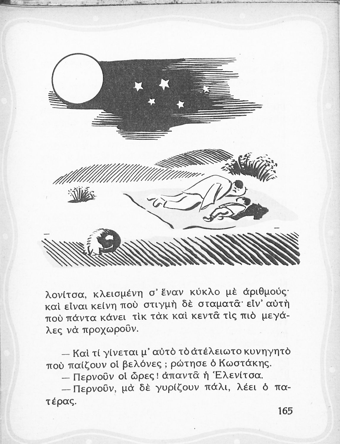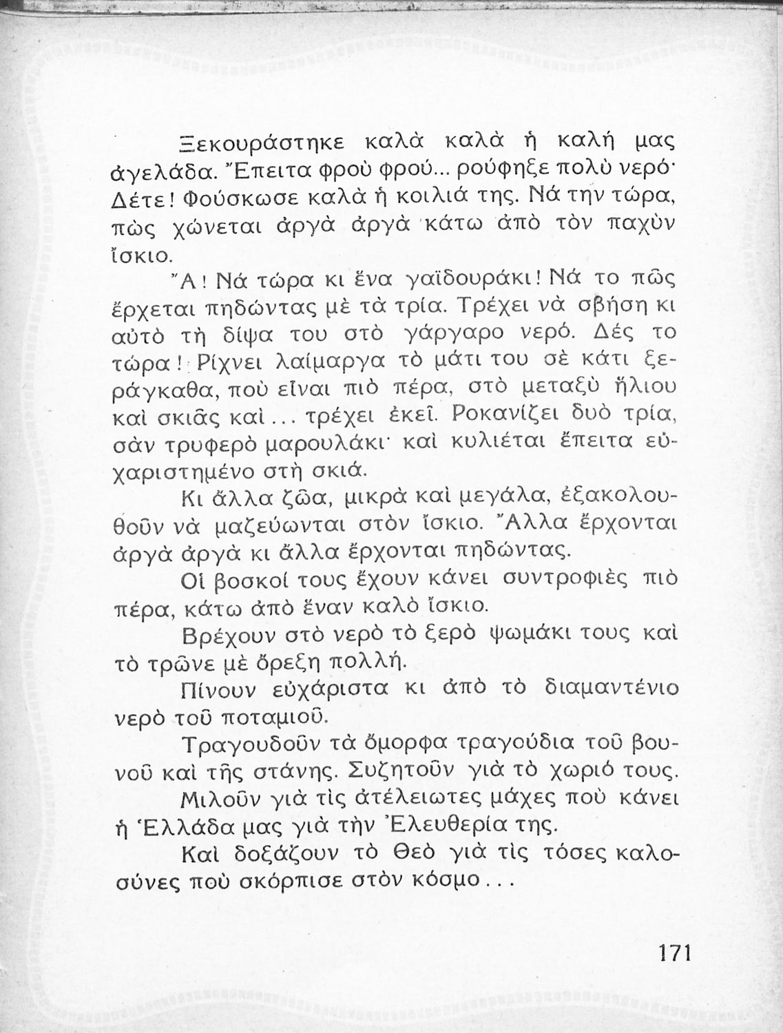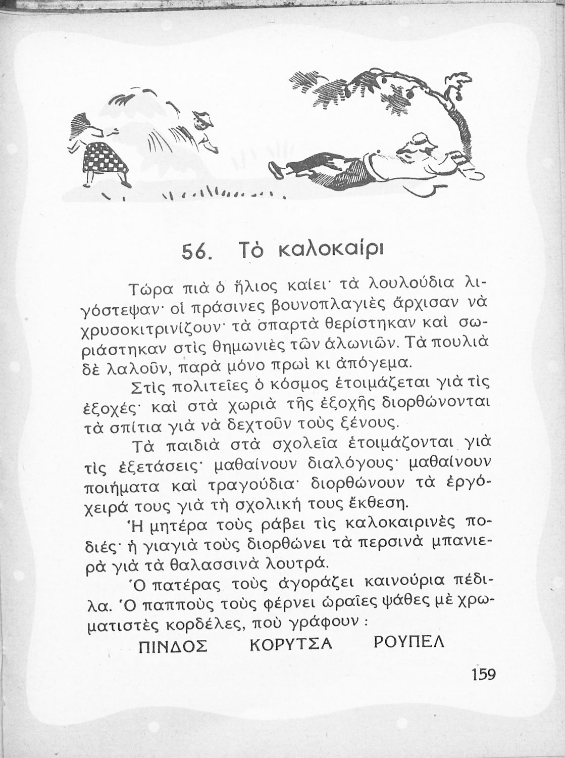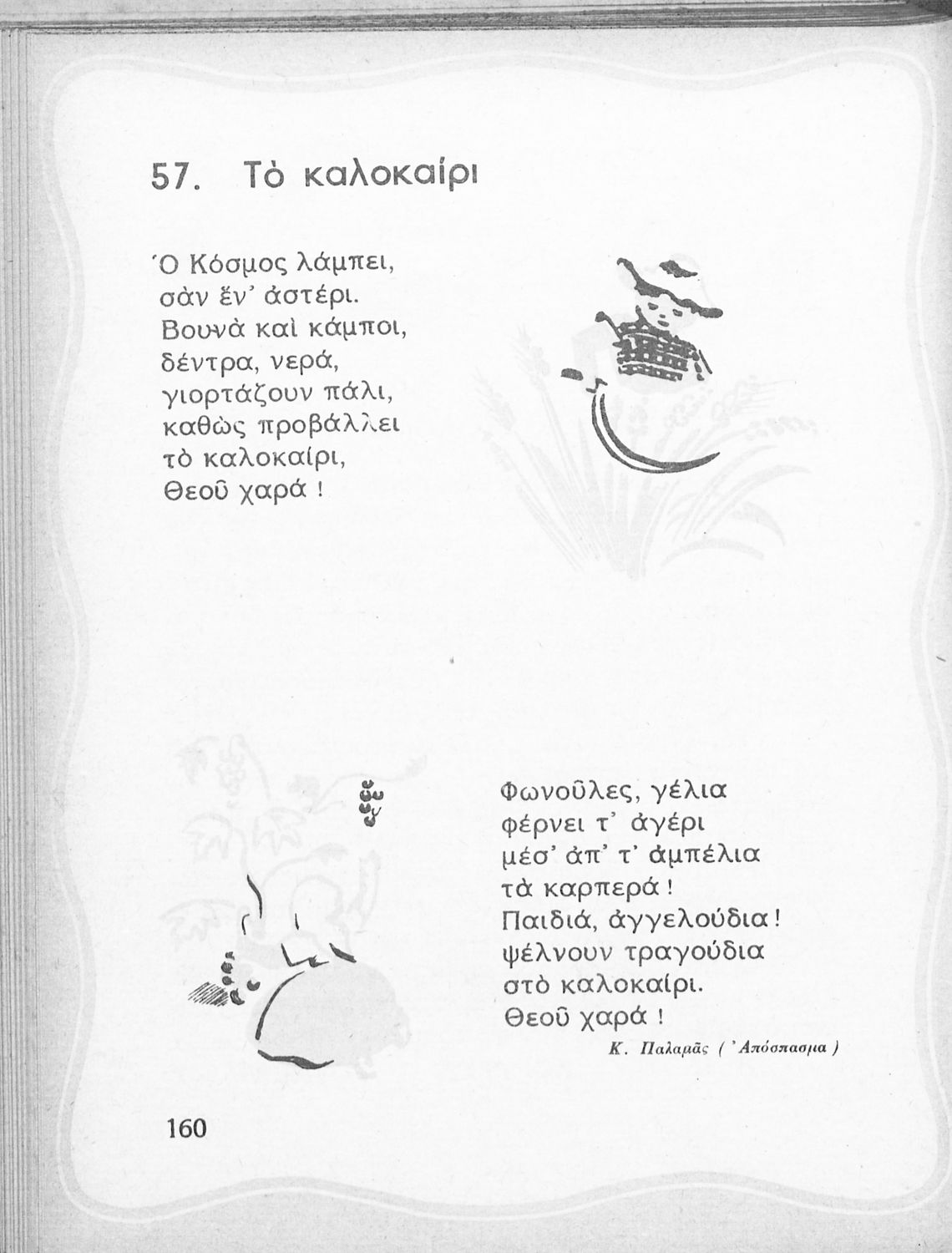 Αναγνωστικό για τη Β΄ Δημοτικού που περιέχει ποιήματα και πεζά που αντλούν τα θέματά τους από τη φύση και την παράδοση της Ελλάδας και την κοινωνική και επαγγελματική ζωή των κατοίκων της.