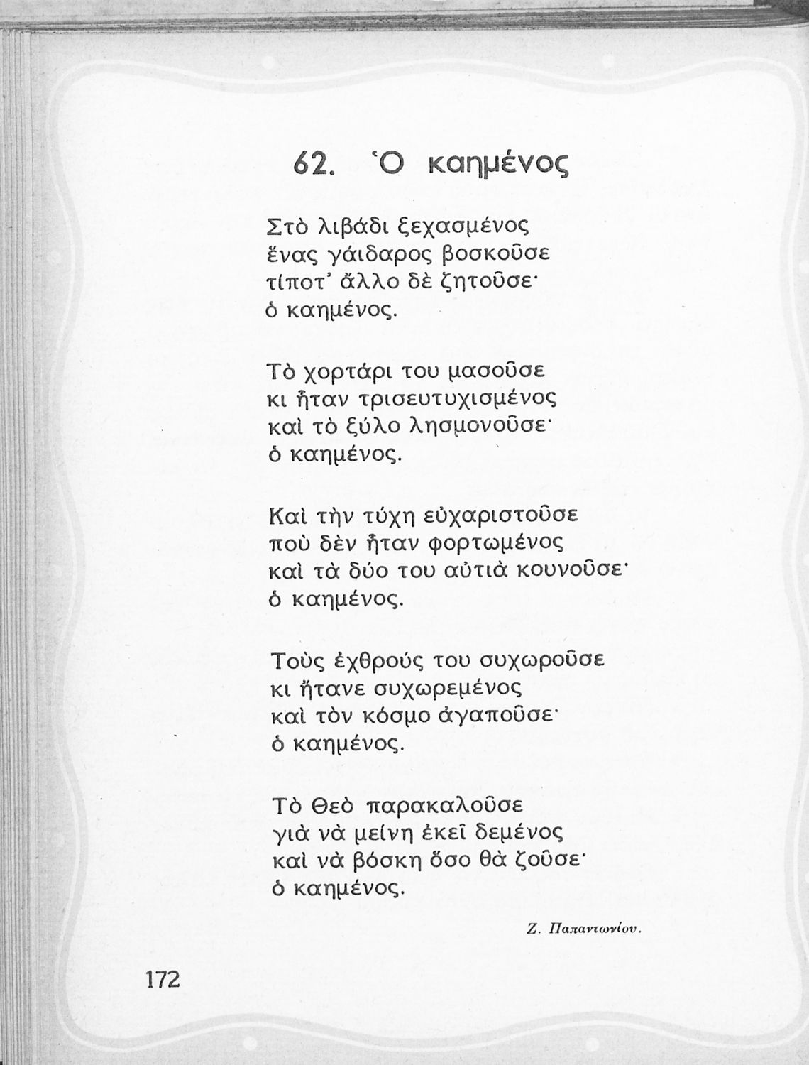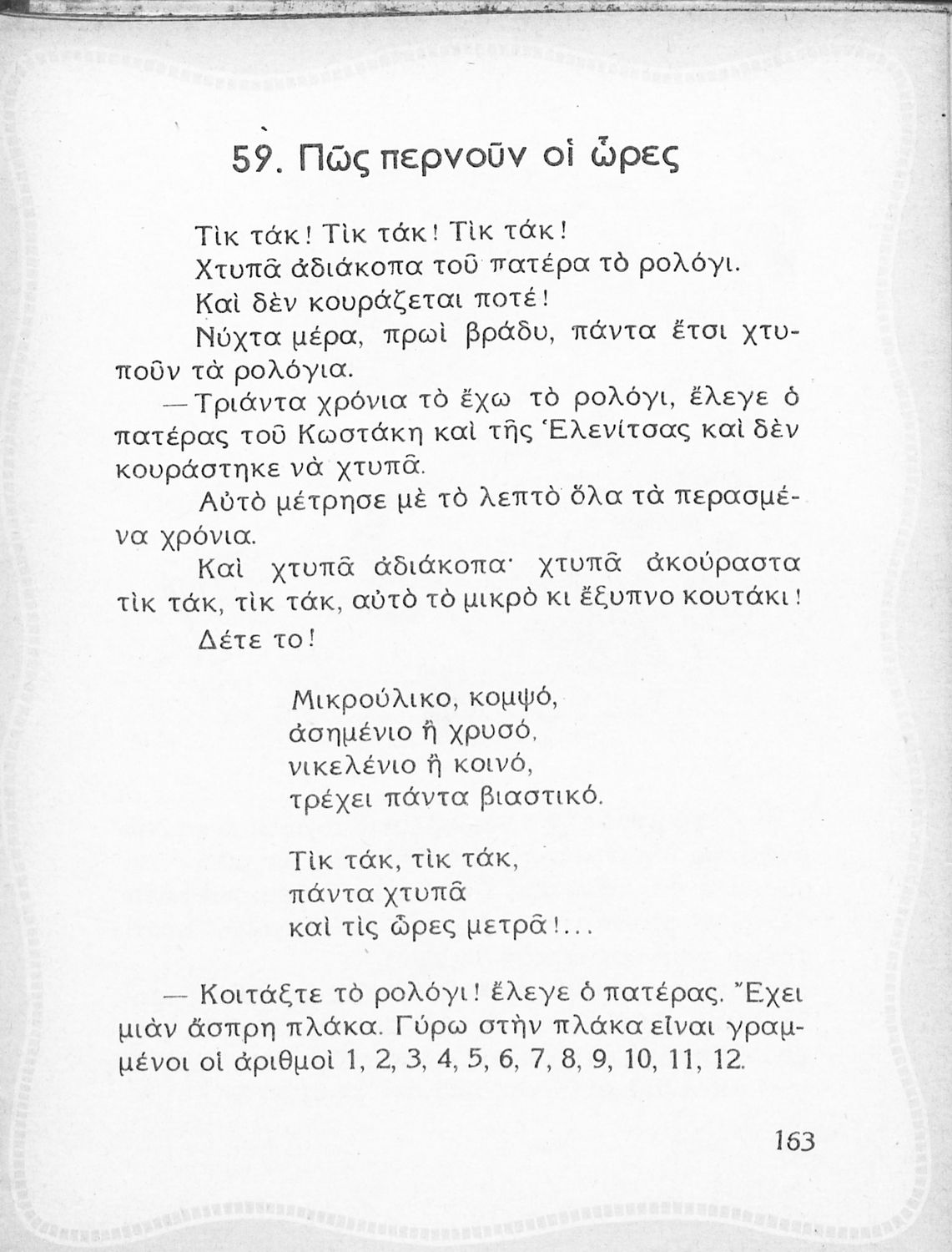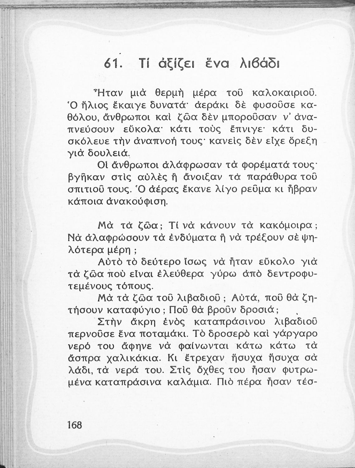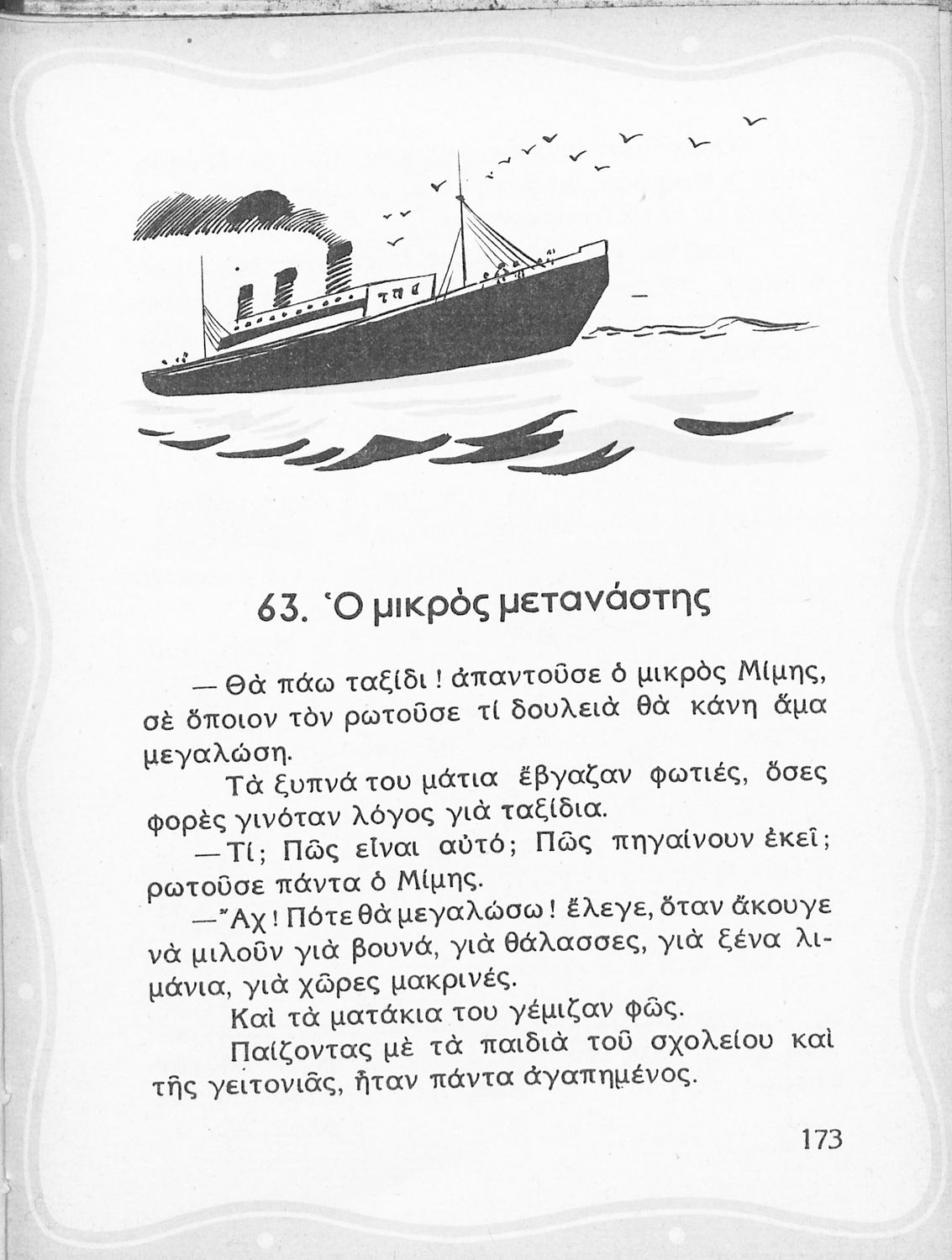 Αναγνωστικό για τη Β΄ Δημοτικού που περιέχει ποιήματα και πεζά που αντλούν τα θέματά τους από τη φύση και την παράδοση της Ελλάδας και την κοινωνική και επαγγελματική ζωή των κατοίκων της.