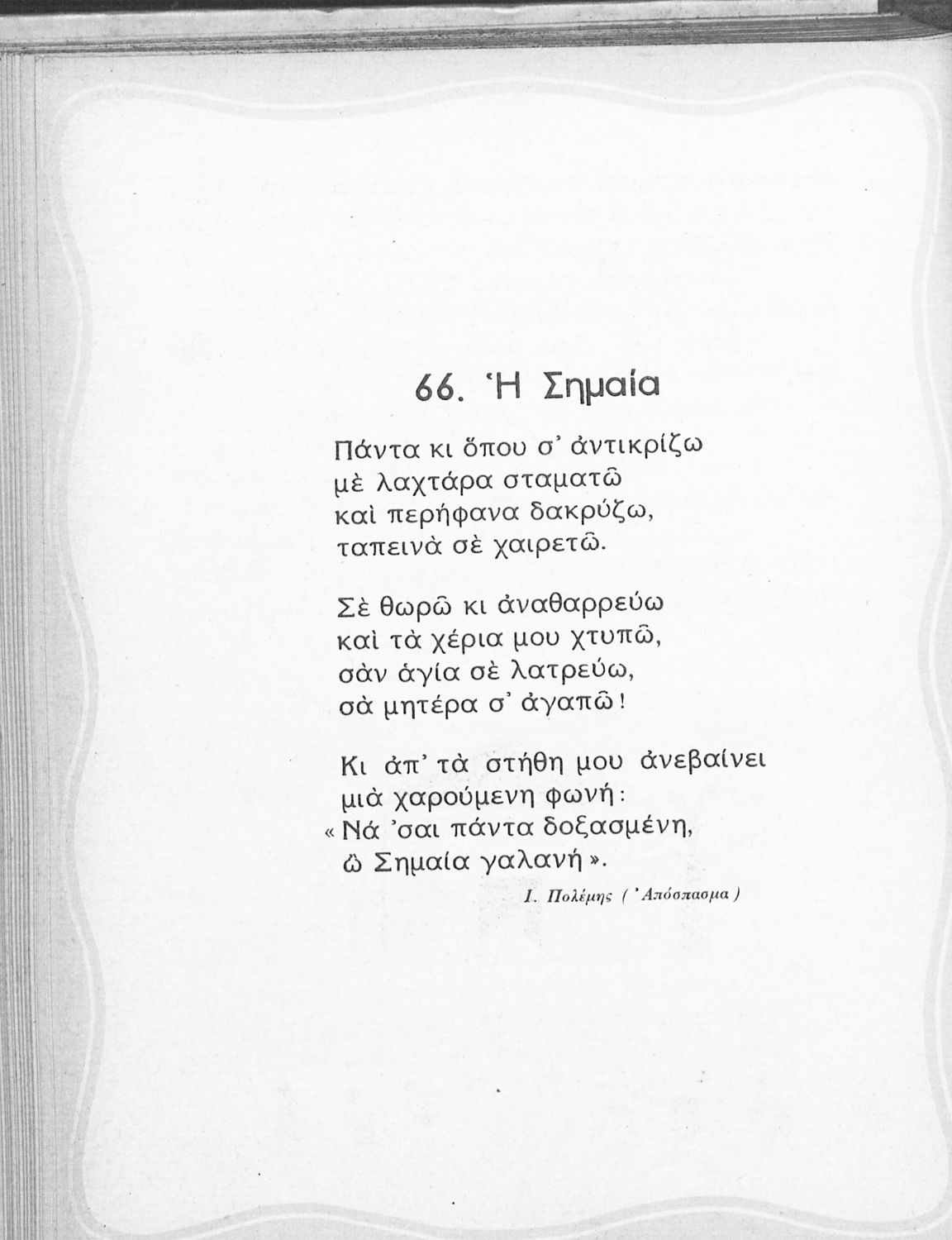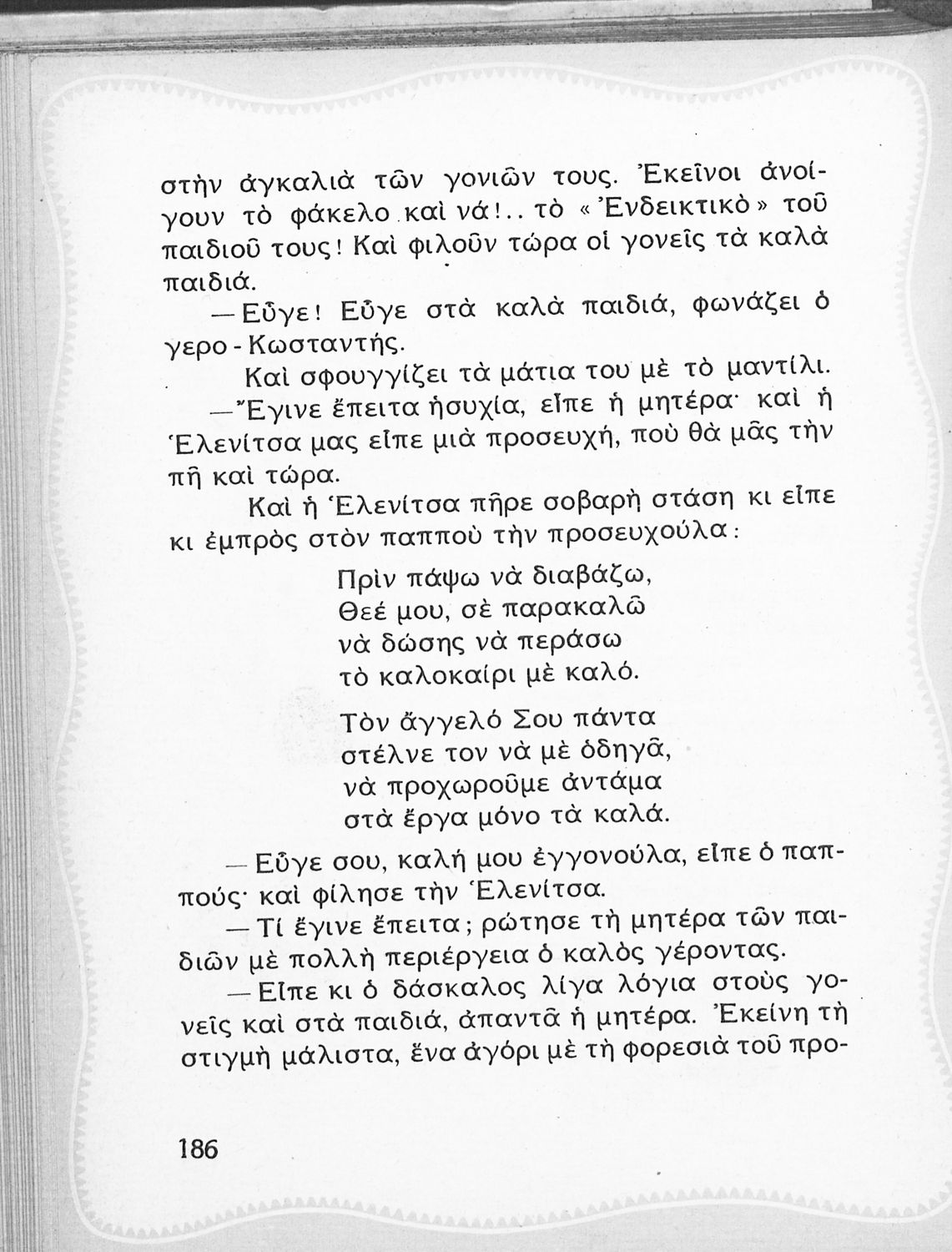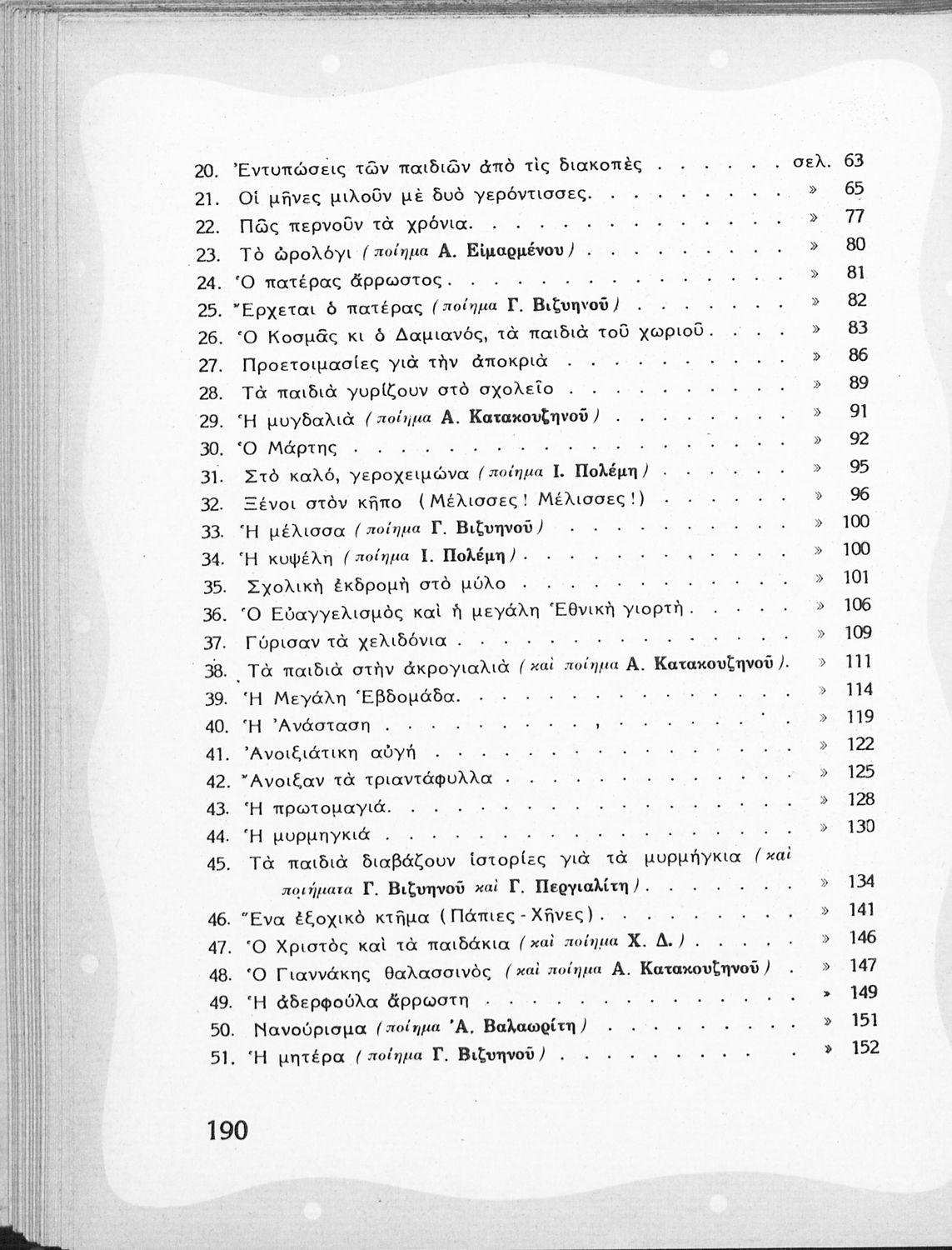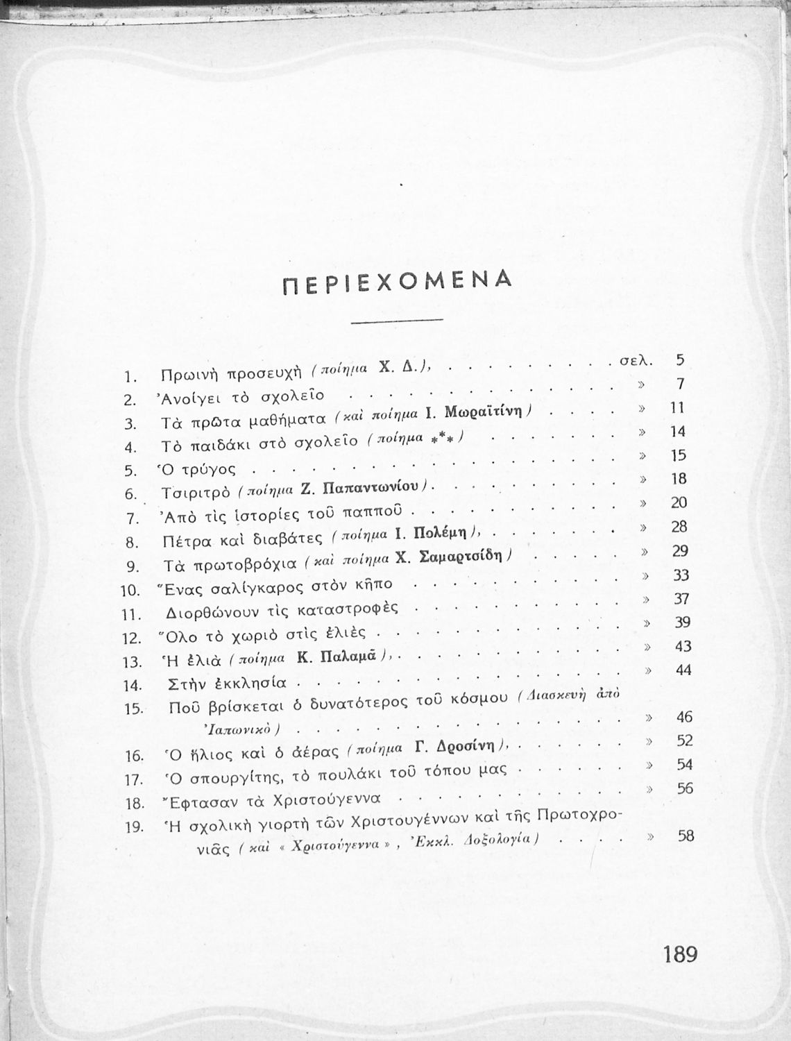 Αναγνωστικό Β' Δημοτικού που περιλαμβάνει ποιήματα και πεζά εμπνευσμένα από την καθημερινή ζωή, την ελληνική μυθολογία, την ελληνική φύση και τη θρησκευτική παράδοση.
