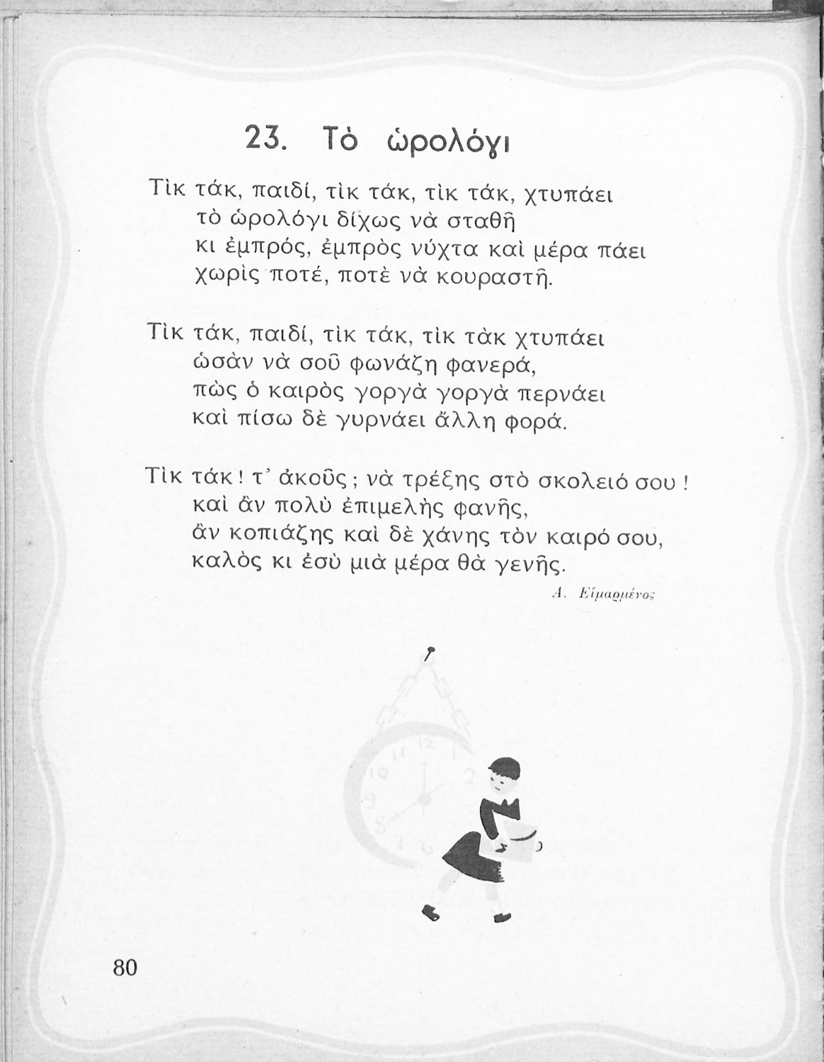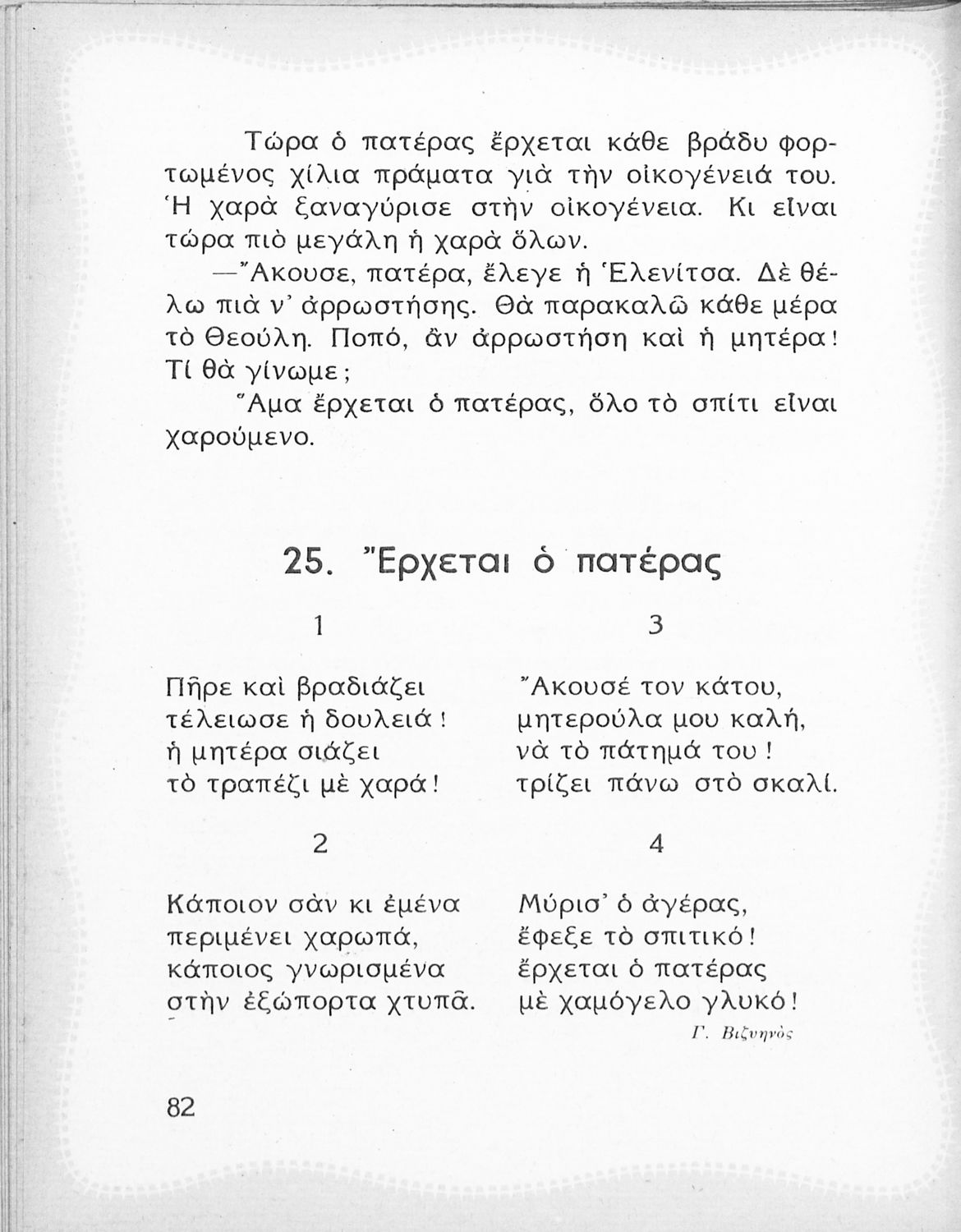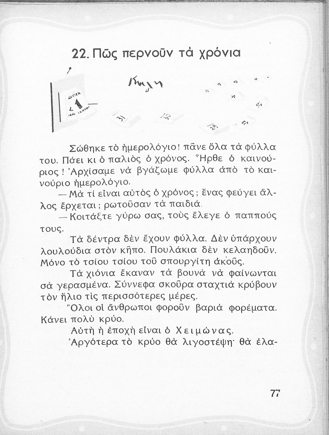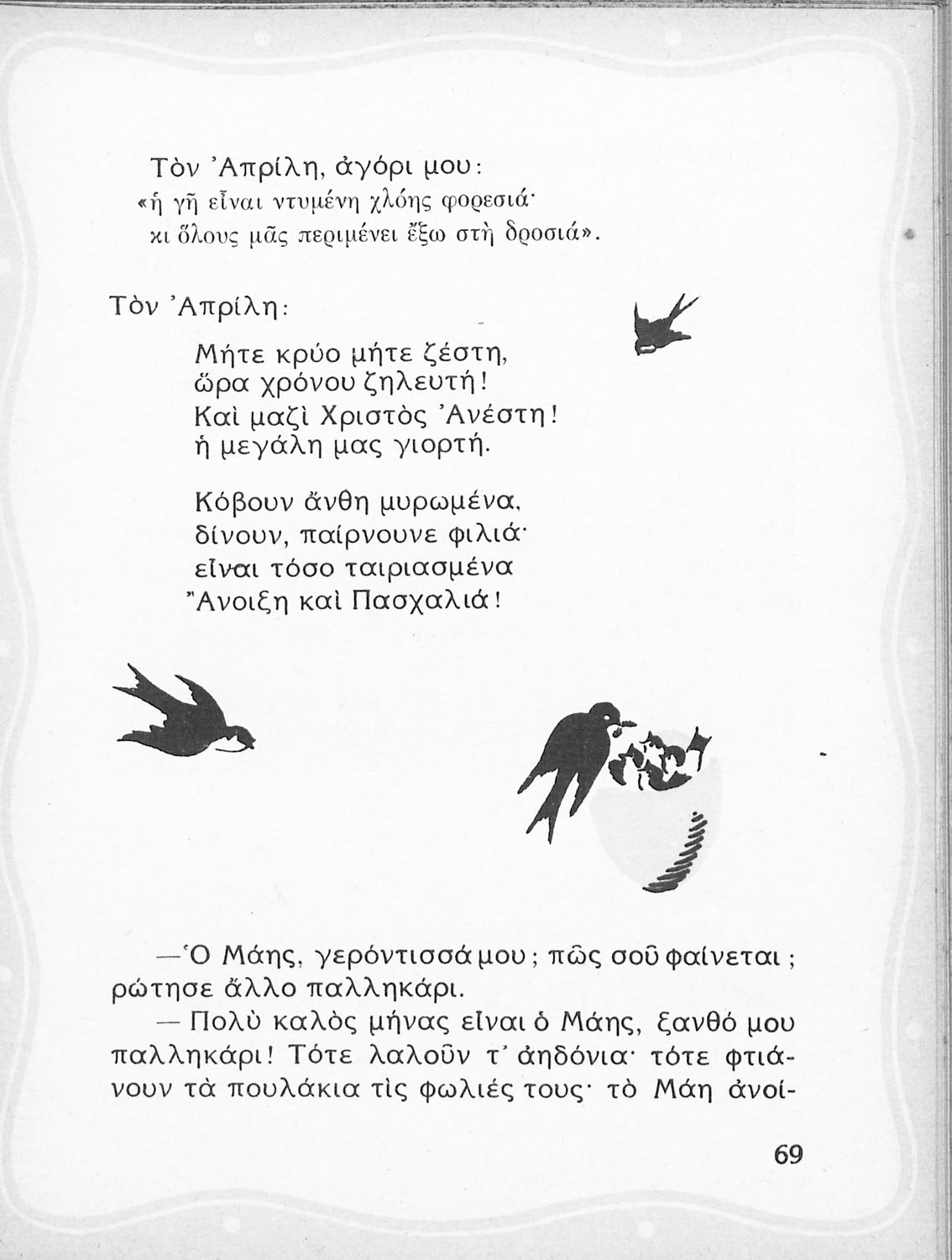 Αναγνωστικό Β΄ Δημοτικού που περιέχει ποιήματα και διηγήματα Ελλήνων συγγραφέων που αντλούν τα θέματά τους από την καθημερινή ζωή των ανθρώπων.