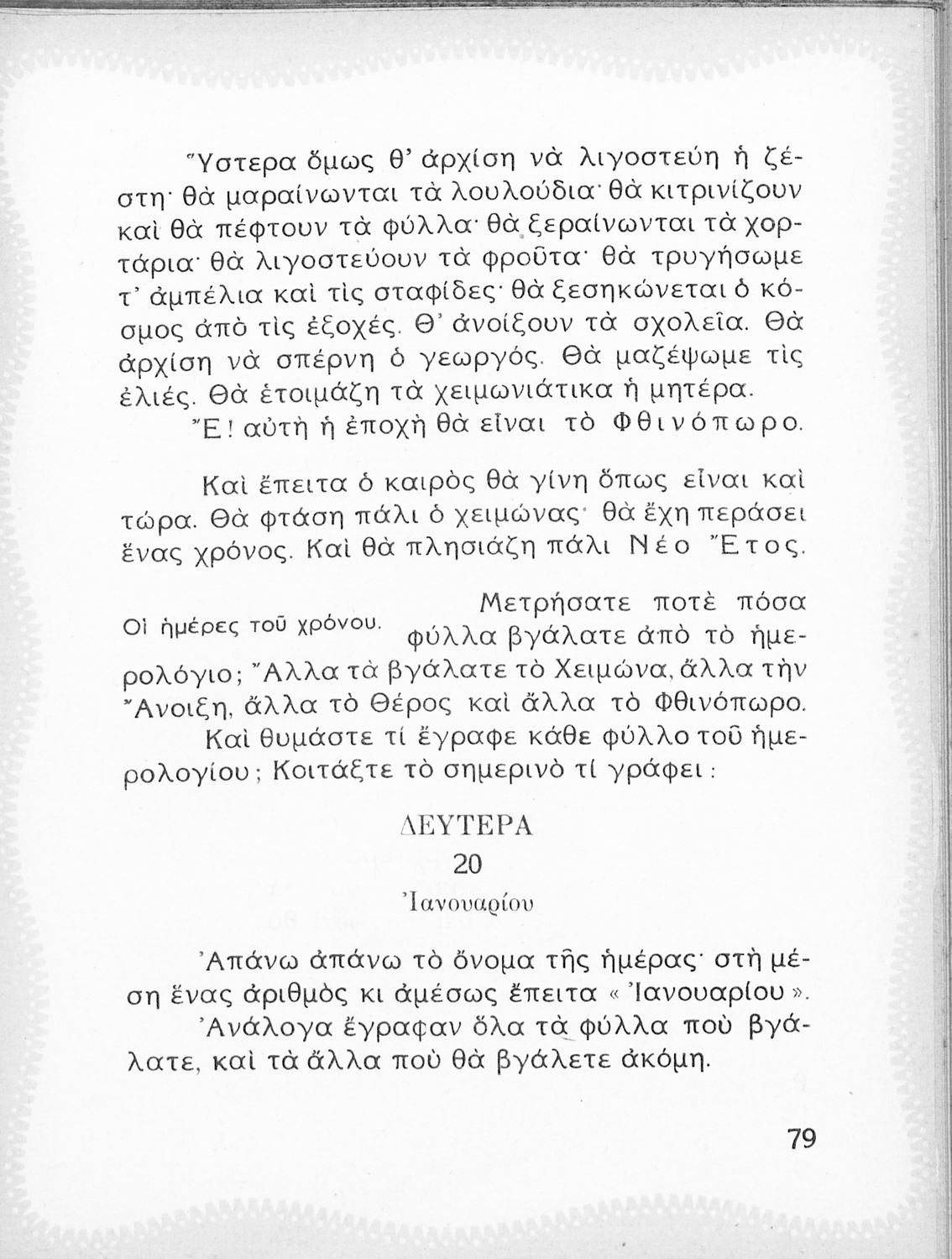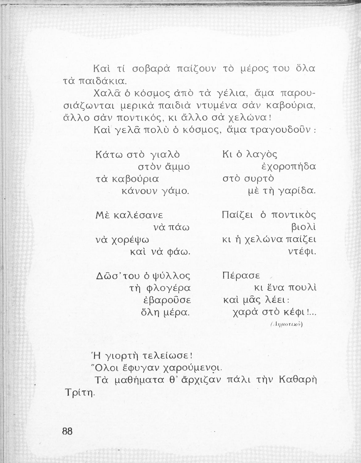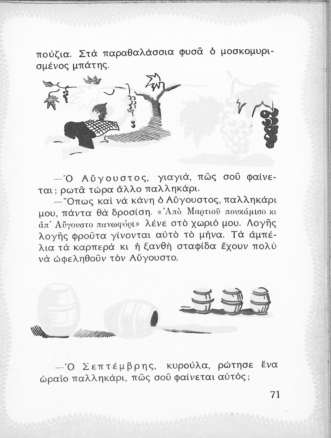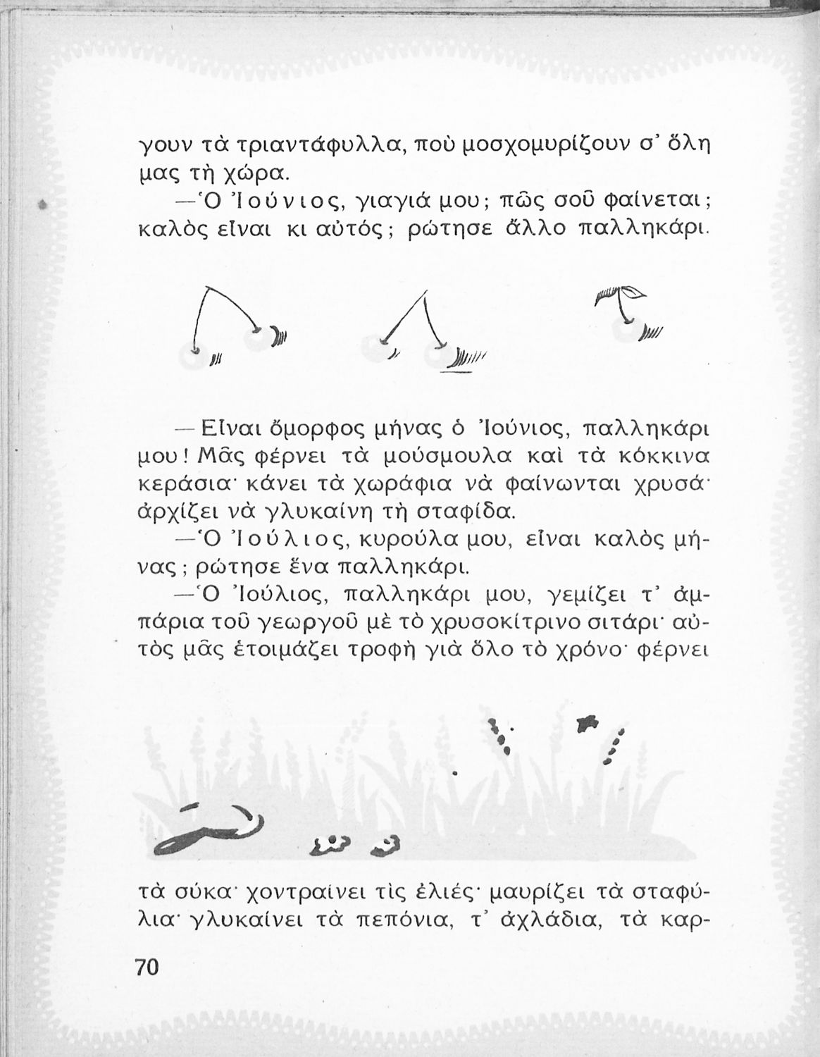 Αναγνωστικό Β΄ Δημοτικού που περιέχει ποιήματα και διηγήματα Ελλήνων συγγραφέων που αντλούν τα θέματά τους από την καθημερινή ζωή των ανθρώπων.