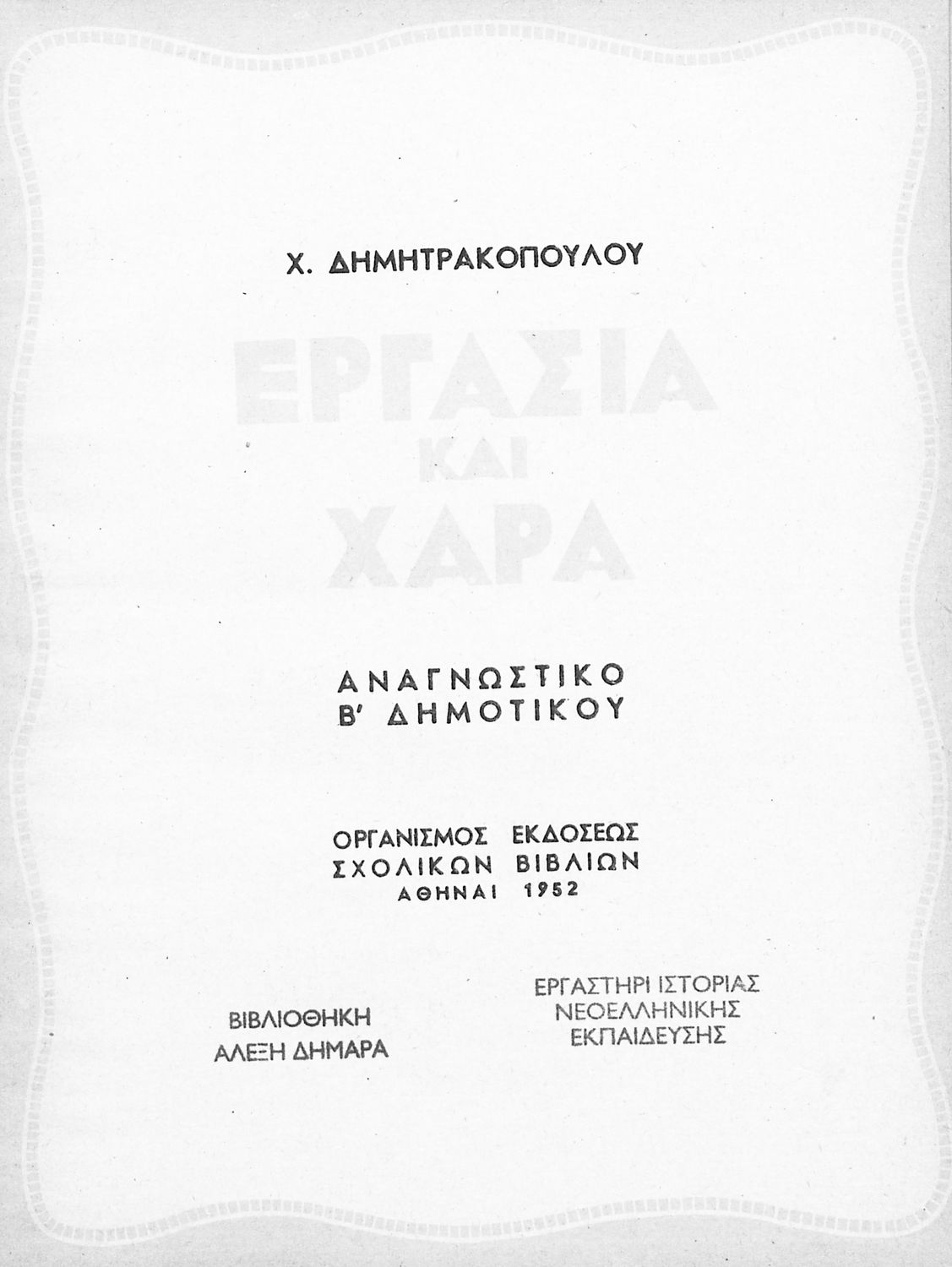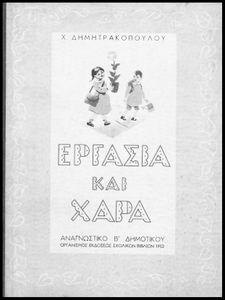 Κωδικός αναγνώρισης: 05-00072 Τίτλος: Εργασία και χαρά. Αναγνωστικό Β΄ Δημοτικού Συγγραφέας: Χ. Δημητρακόπουλος Εικονογράφος: Λουΐζα Μοντεσάντου Μέγεθος και υπόστρωμα: Σχολικό εγχειρίδιο, 192 σελίδες. Σκίτσα (έγχρωμα). |