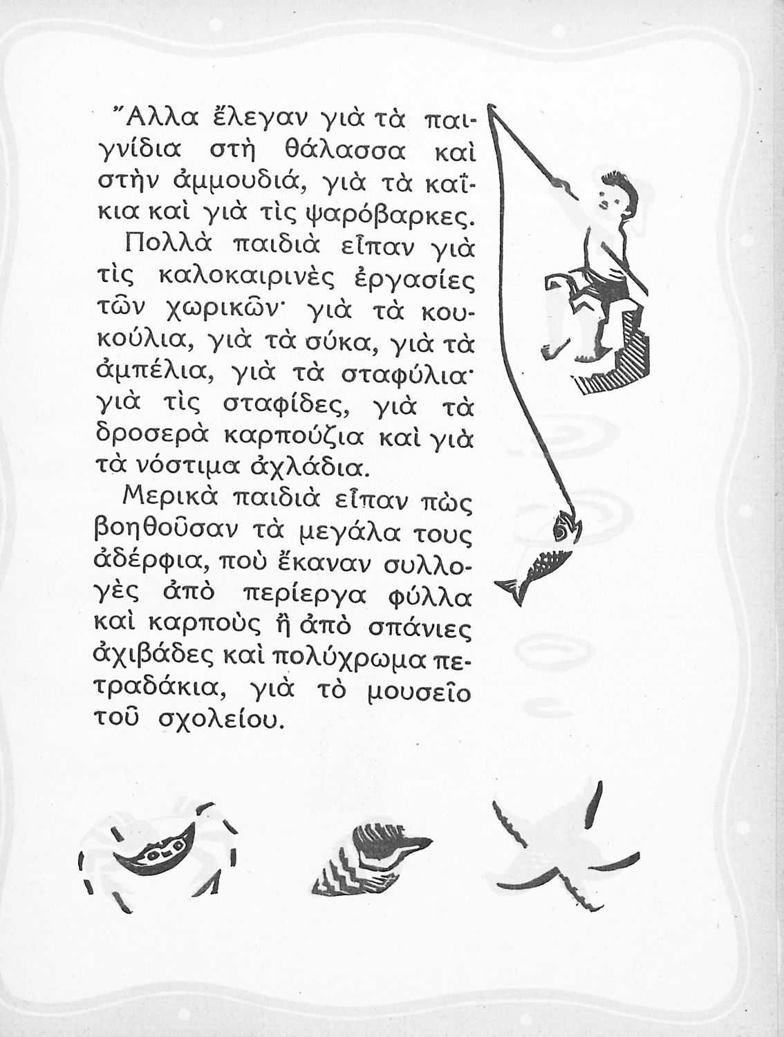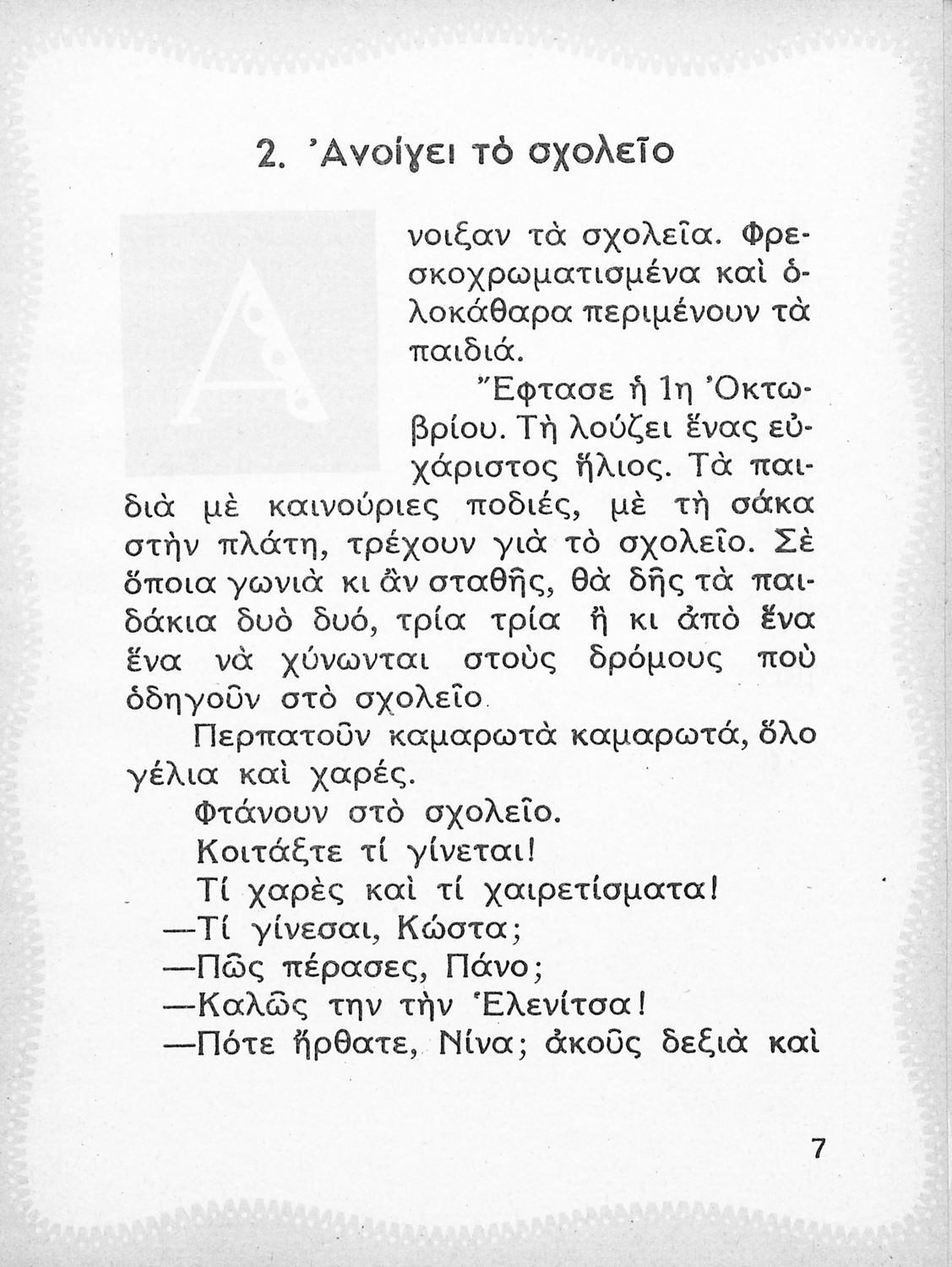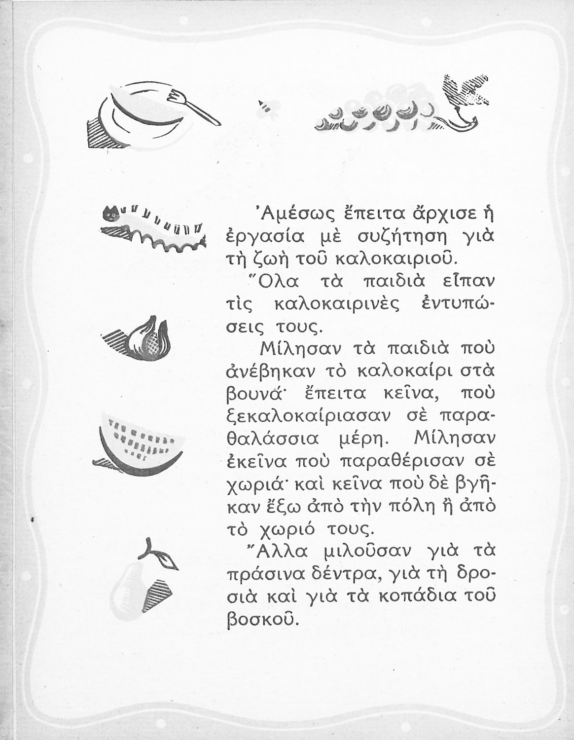 Αναγνωστικό Β΄ Δημοτικού που περιέχει ποιήματα και διηγήματα Ελλήνων συγγραφέων που αντλούν τα θέματά τους από την καθημερινή ζωή των ανθρώπων.