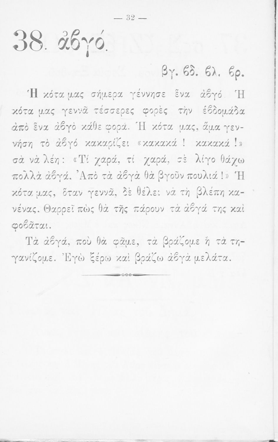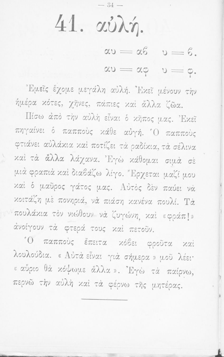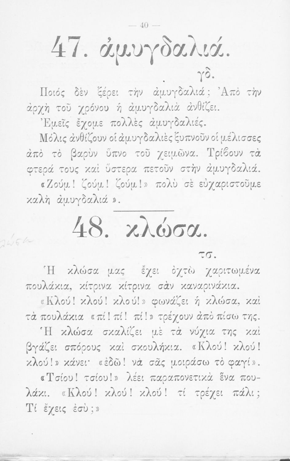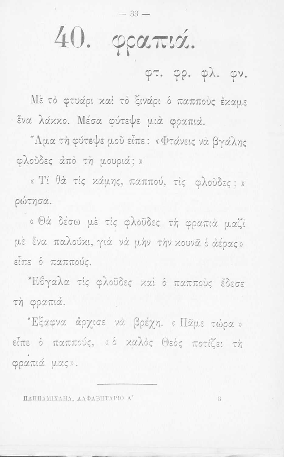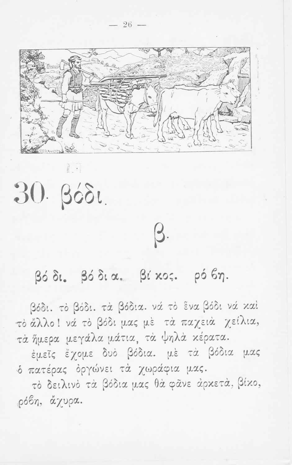 Βαθμίδα εκπαίδευσης: Πρωτοβάθμια Τάξη: Α' Δημοτικού Μάθημα: Νέα Ελληνικά Γλώσσα: Δημοτική Παρουσίαση περιεχομένου: Αναγνωστικό Α΄ Δημοτικού που περιλαμβάνει την εκμάθηση του ελληνικού αλφάβητου, των πρώτων συλλαβών, λέξεων, φράσεων και μικρών παραγράφων. Η θεματολογία αντλείται από την ελληνική ύπαιθρο, την αγροτική ζωή και τον οικογενειακό περίγυρο. |
