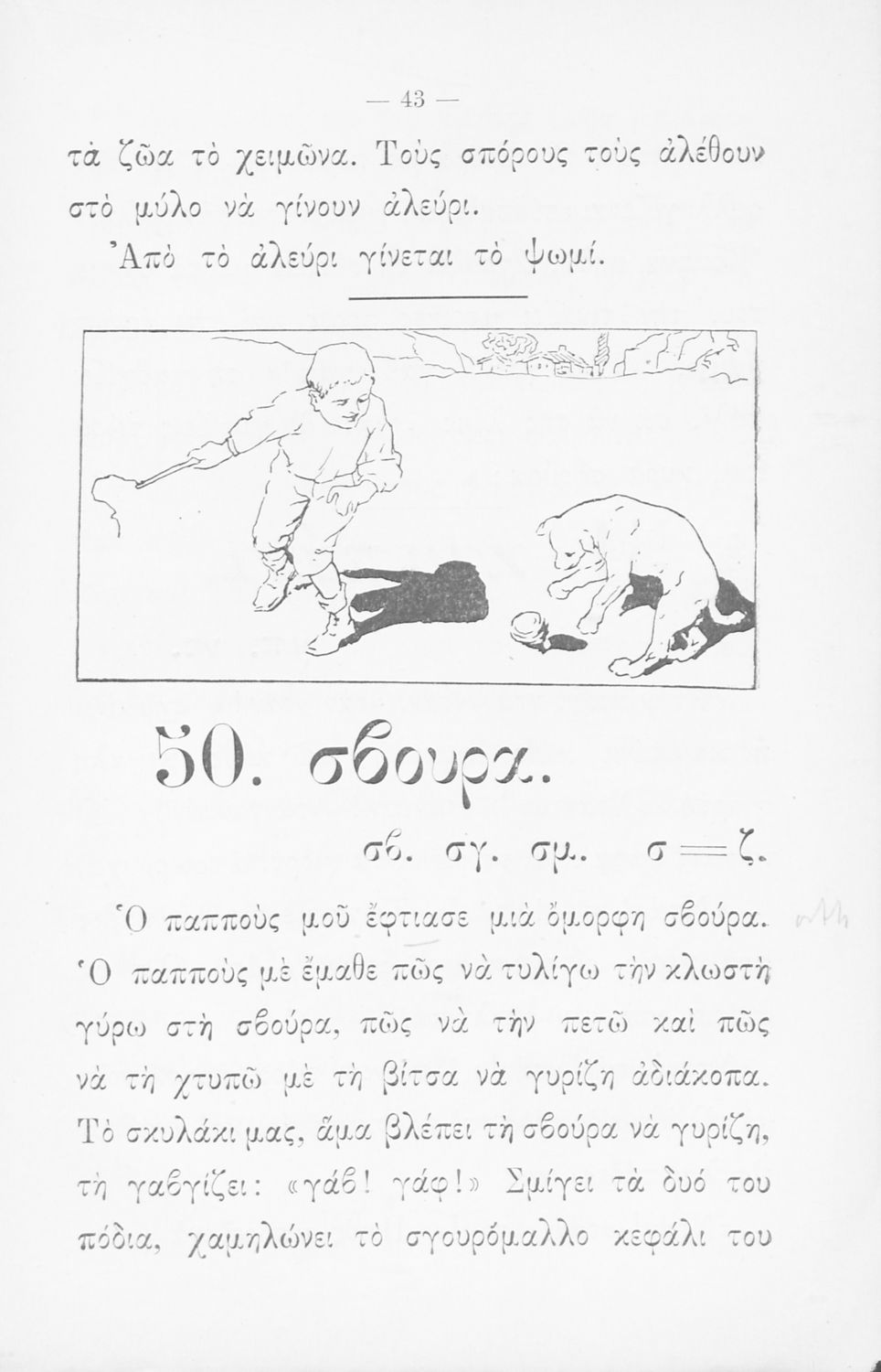 Αναγνωστικό Α΄ Δημοτικού που περιλαμβάνει την εκμάθηση του ελληνικού αλφάβητου, των πρώτων συλλαβών, λέξεων, φράσεων και μικρών παραγράφων. Η θεματολογία αντλείται από την ελληνική ύπαιθρο, την αγροτική ζωή και τον οικογενειακό περίγυρο.