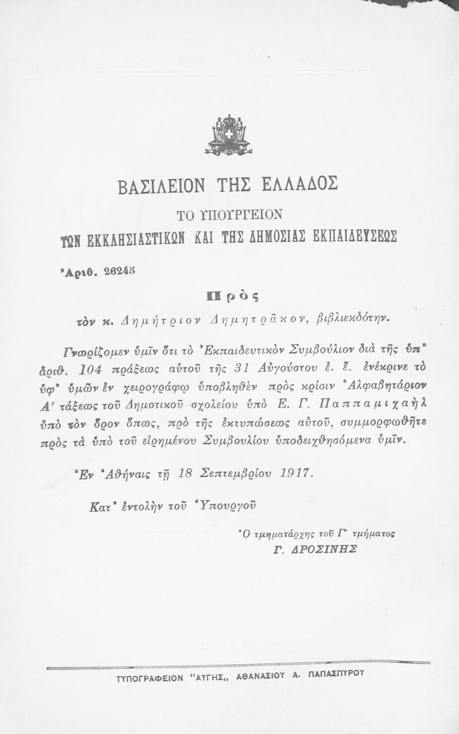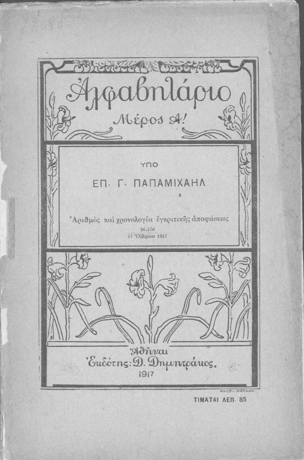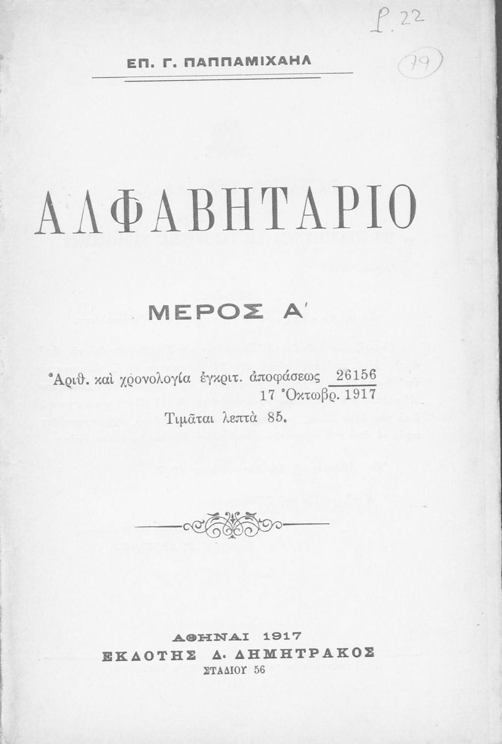 Εκδότης: Δημ. Δημητράκος Έτος έκδοσης: 1917 Τόπος έκδοσης: Αθήνα Υπουργική απόφαση / Σύμβαση: 26156/17-10-1917 Έτος έγκρισης: 1917 |